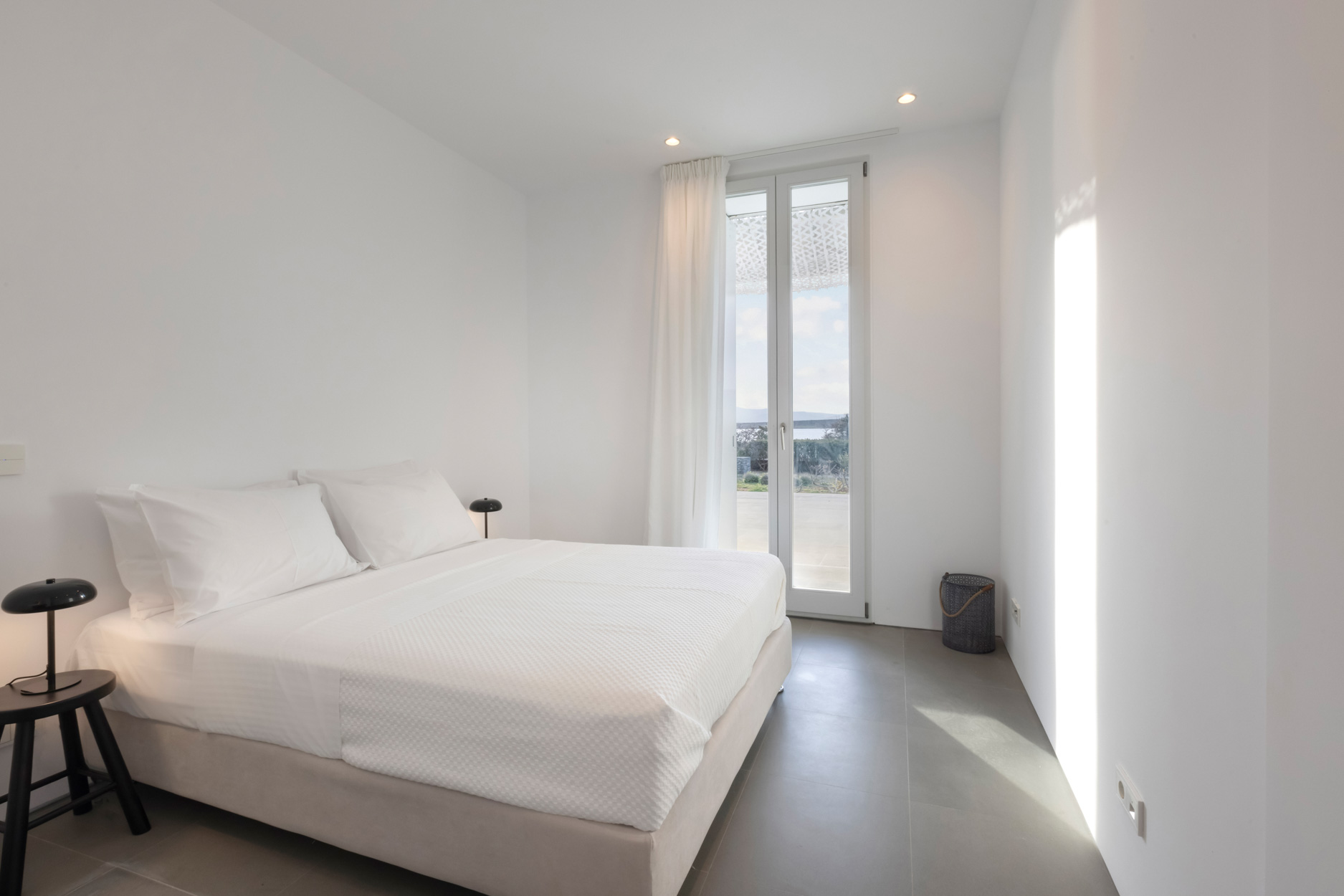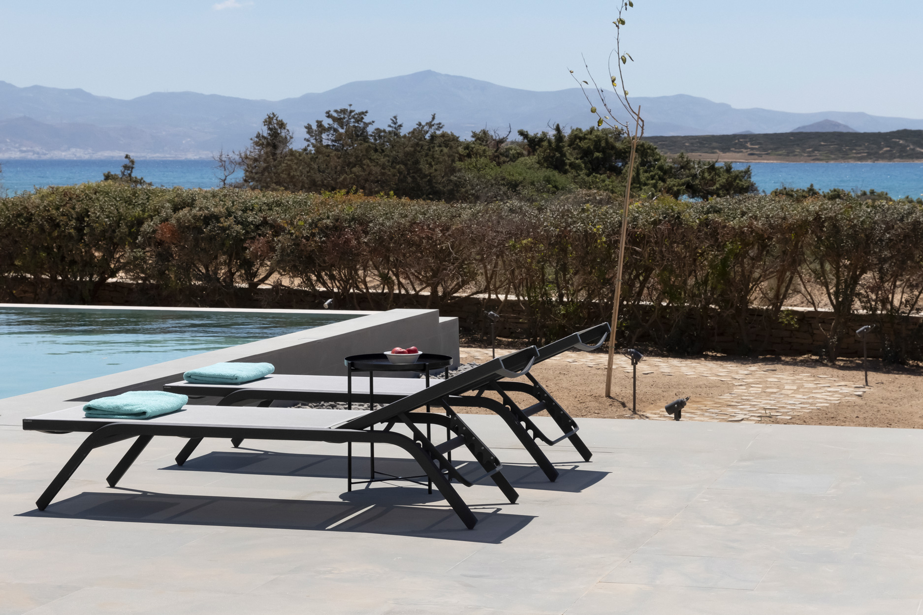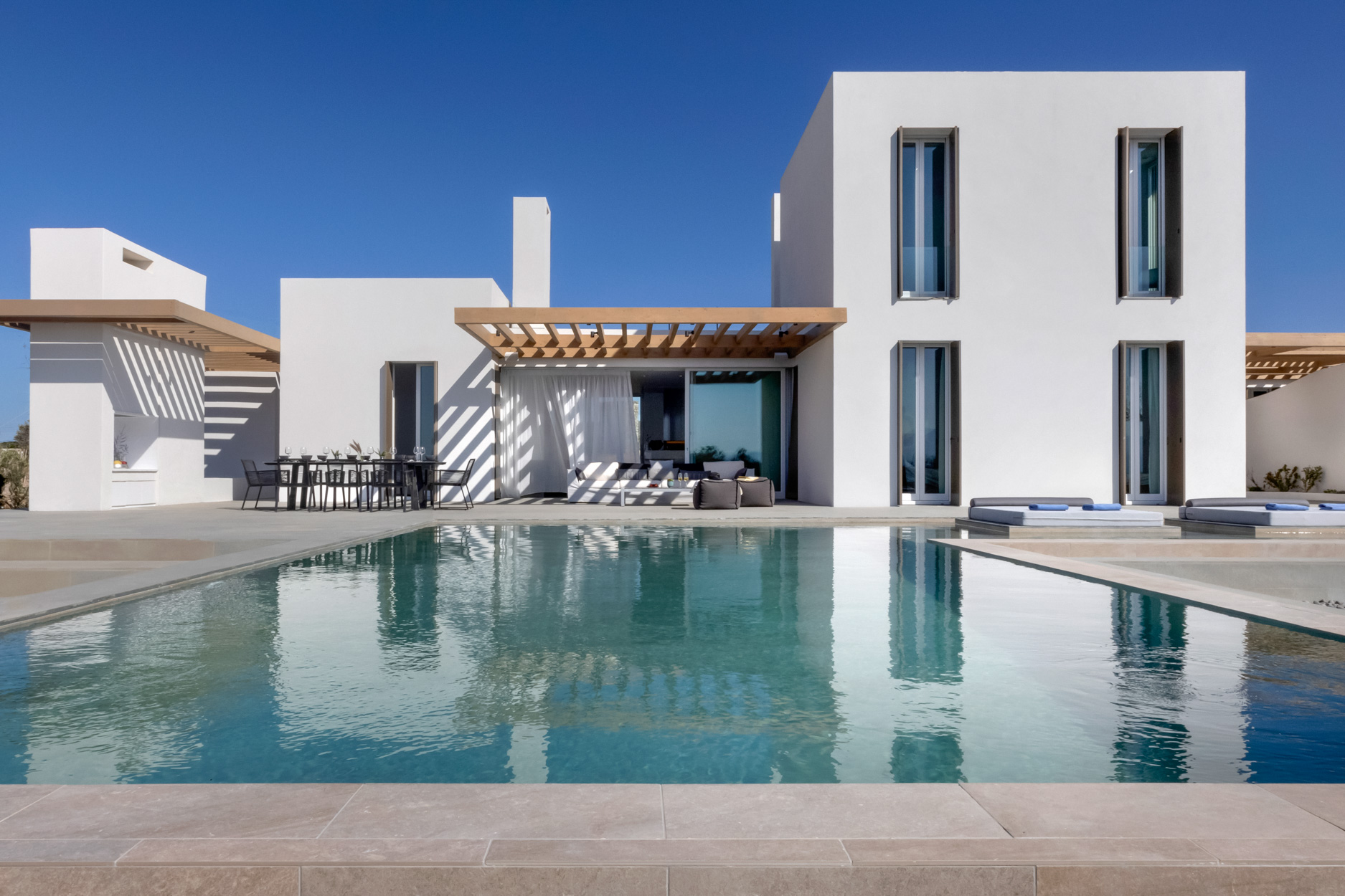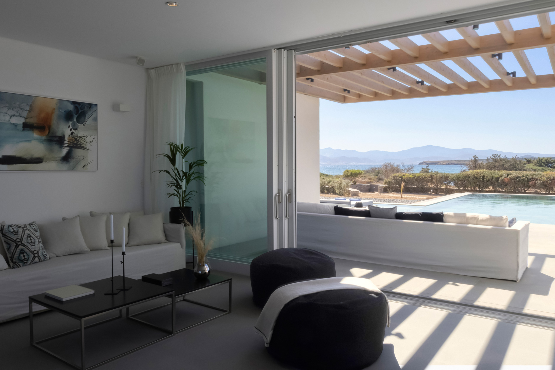 The villa enjoys an exceptional location directly in front of Santa Maria Beach after crossing the road —one of Paros’ most beautiful stretches of golden sand and turquoise water. Guests can enjoy the sea just steps from their door, while the vibrant town of Naousa—with its charming harbor, boutiques, and acclaimed restaurants—is only a short drive away.