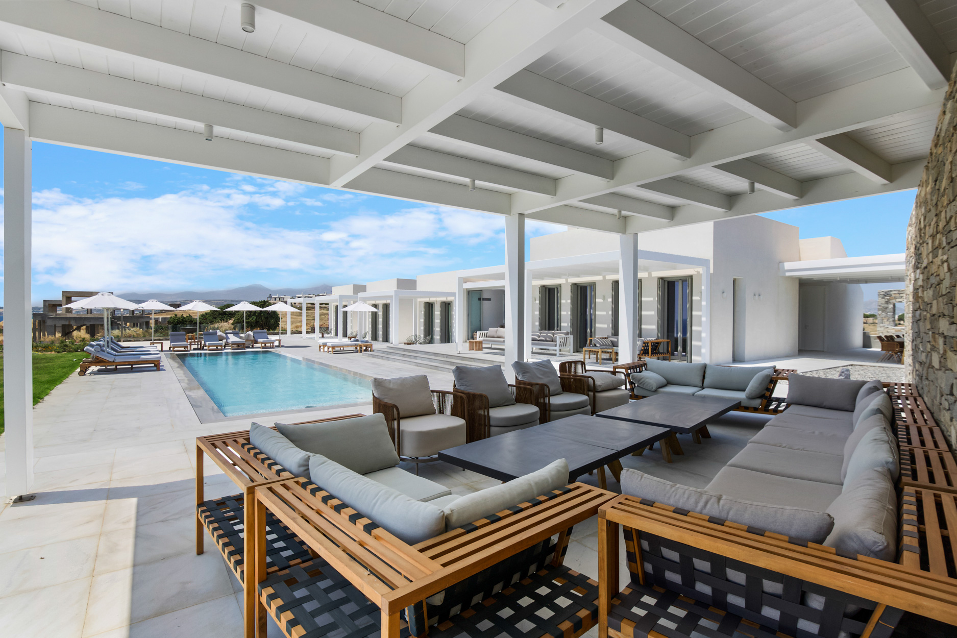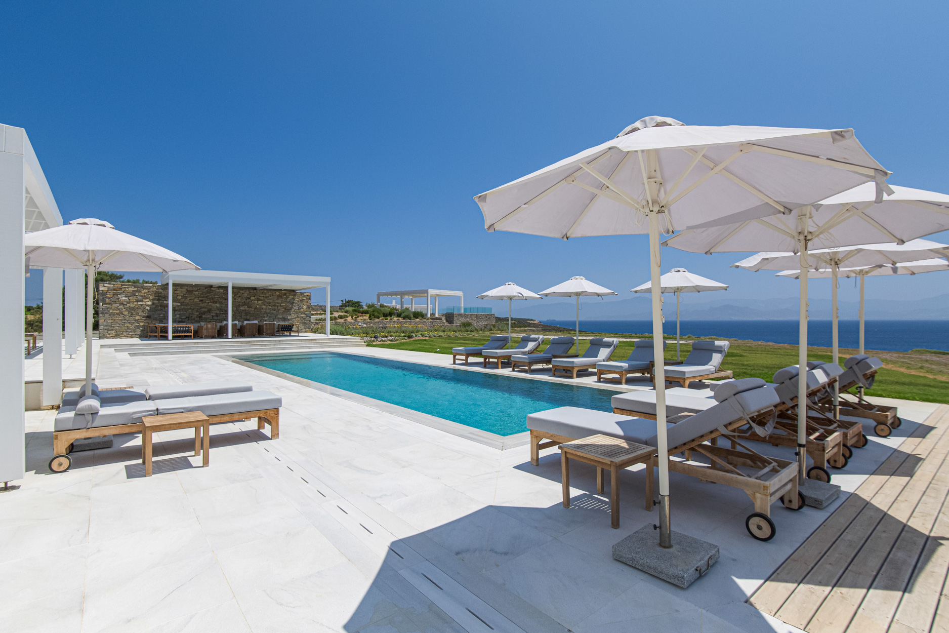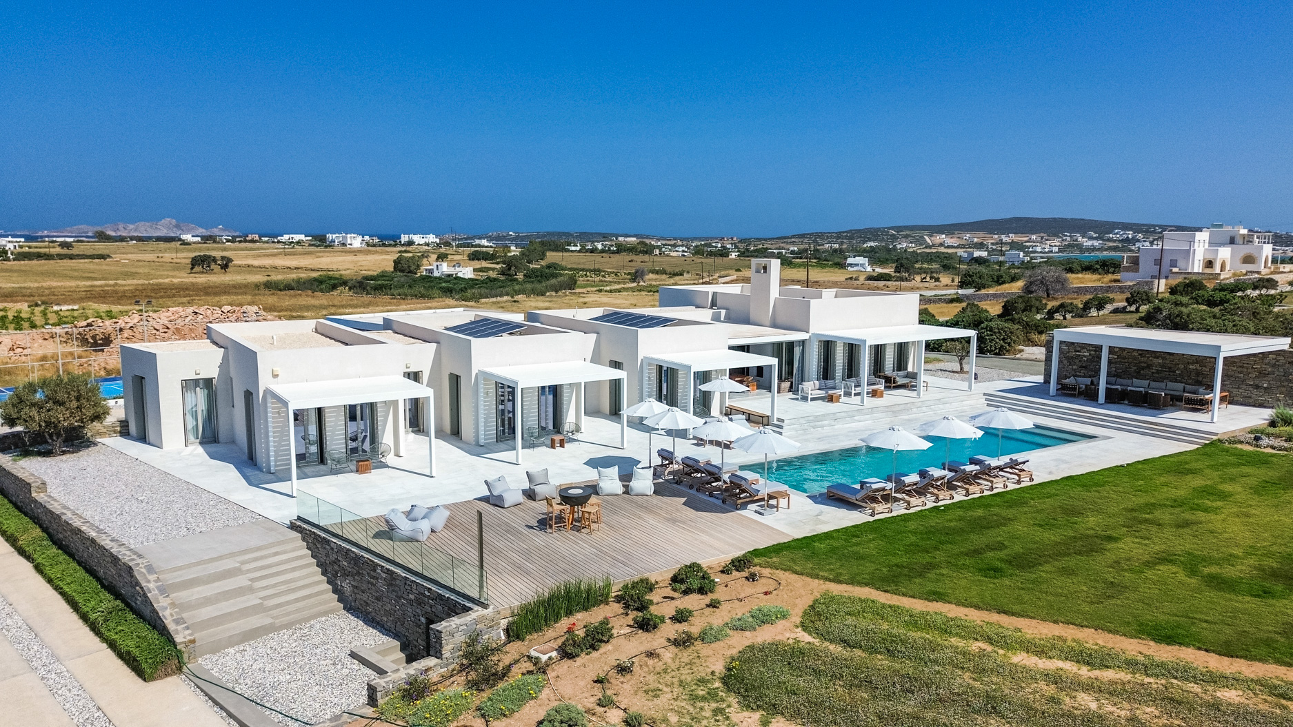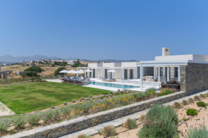 The villa features spacious, light-filled interiors, designed with clean lines and minimalist Cycladic architecture, blending seamlessly with its natural surroundings. Each of the seven beautifully appointed bedrooms provides comfort and privacy, making it ideal for large families or groups of friends.