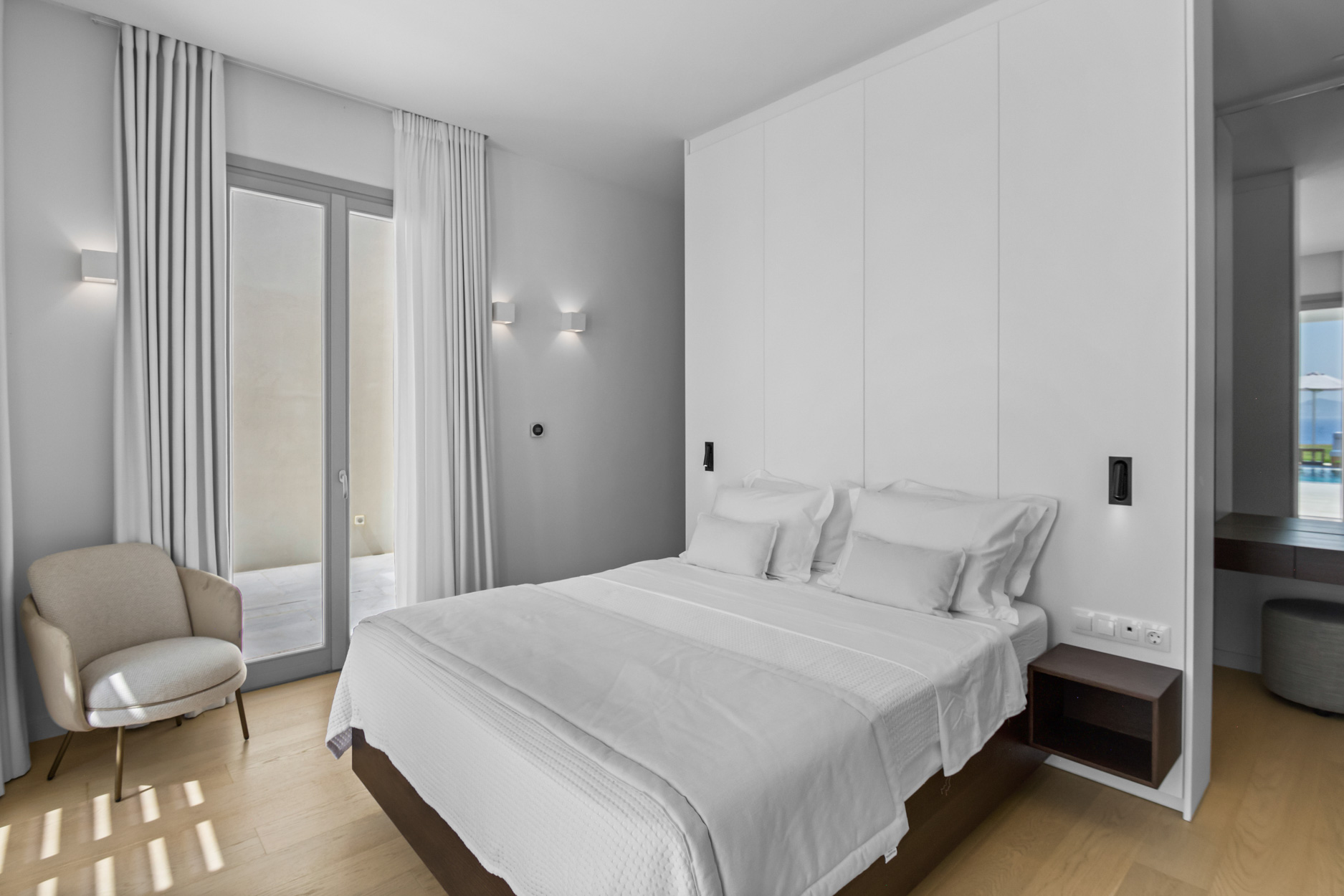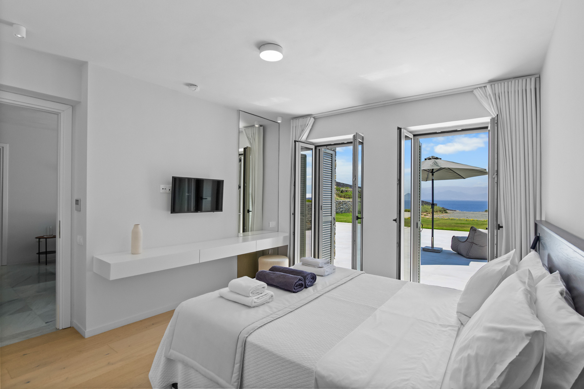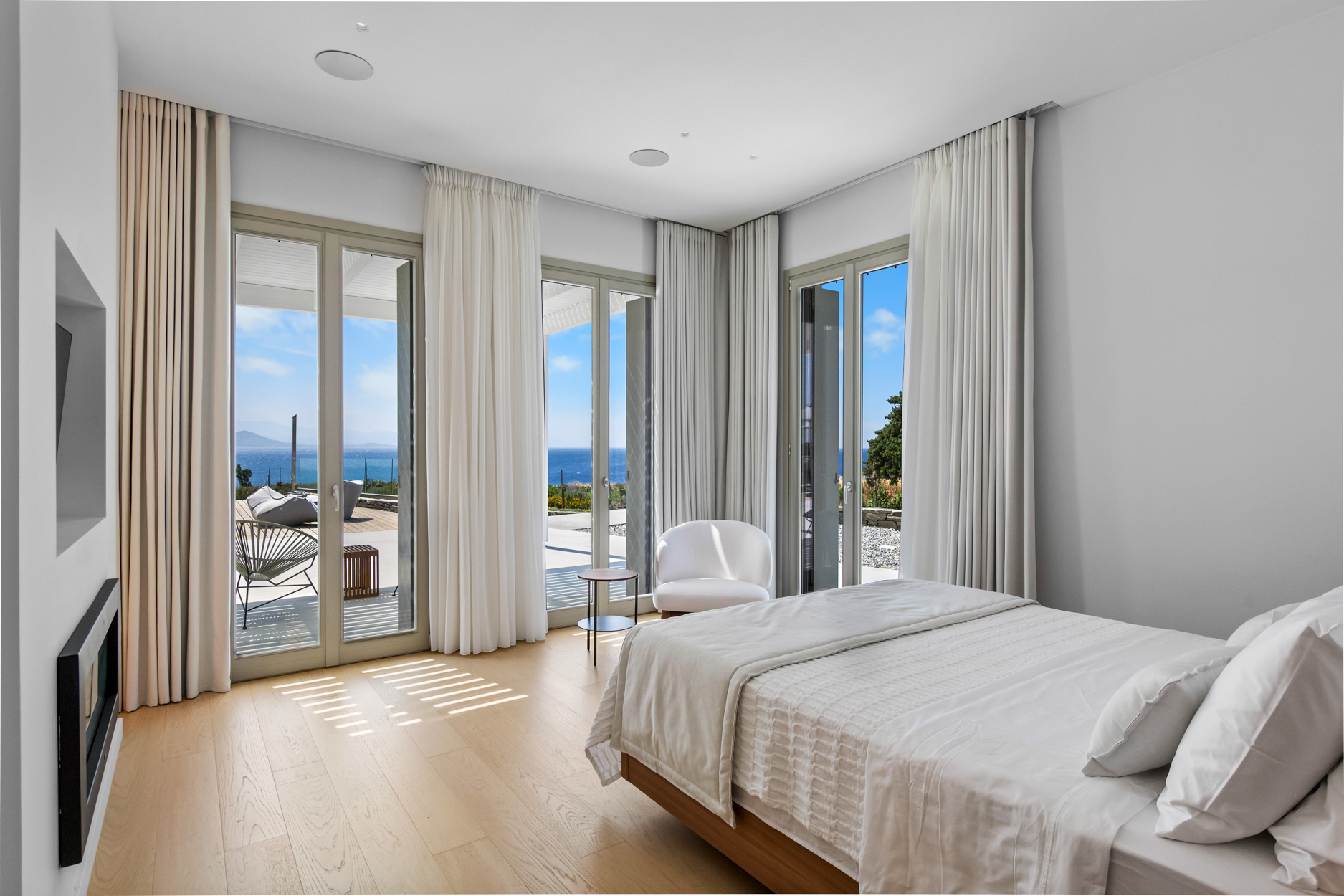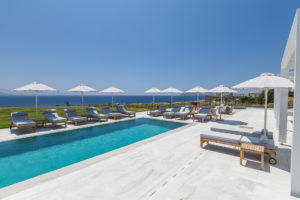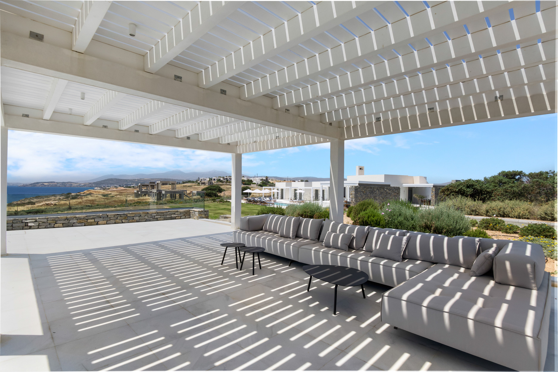 The villa features spacious, light-filled interiors, designed with clean lines and minimalist Cycladic architecture, blending seamlessly with its natural surroundings. Each of the seven beautifully appointed bedrooms provides comfort and privacy, making it ideal for large families or groups of friends.