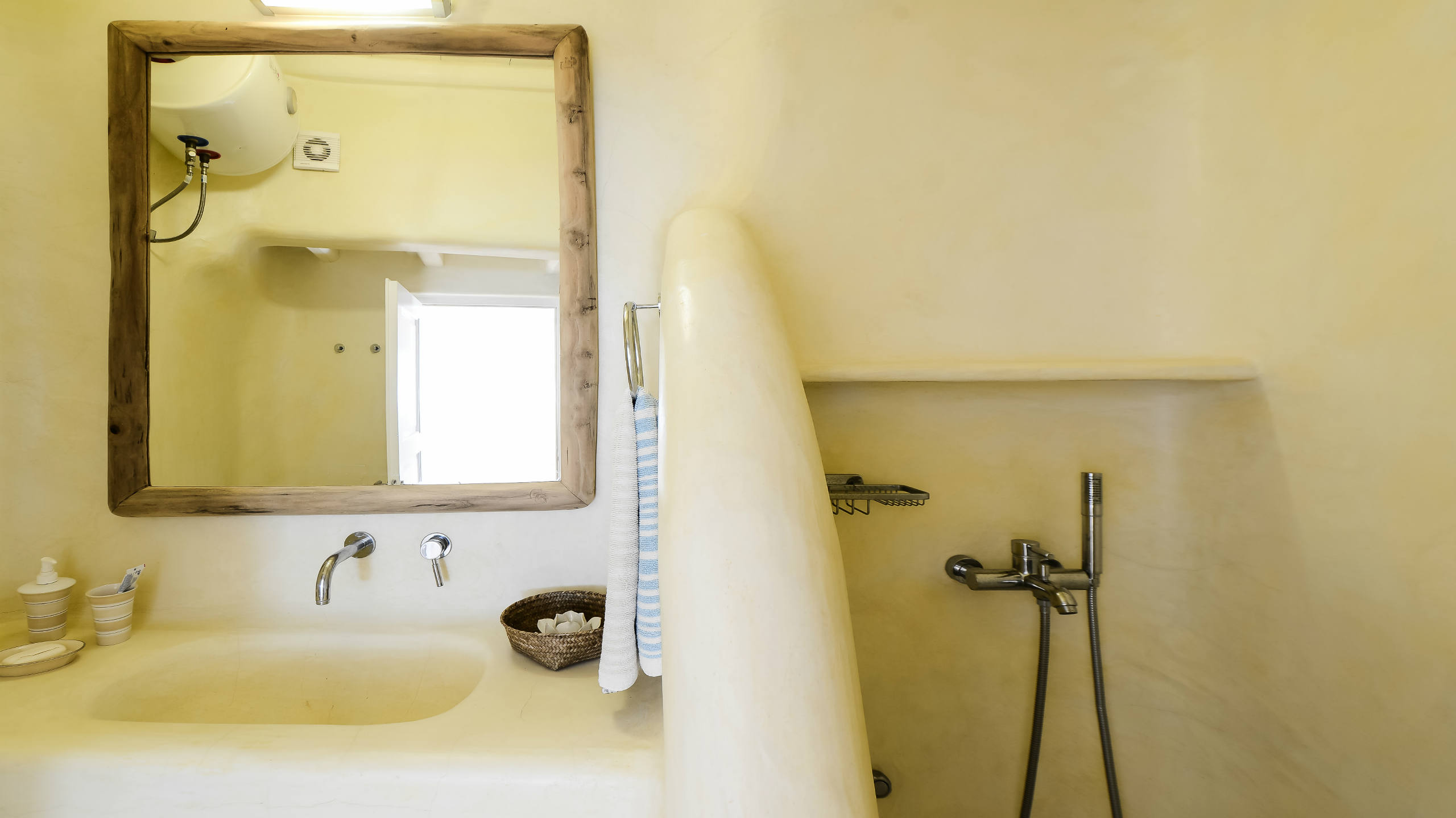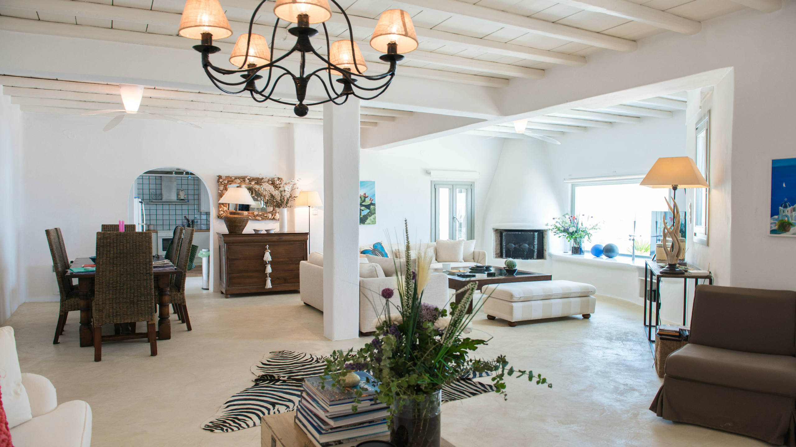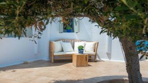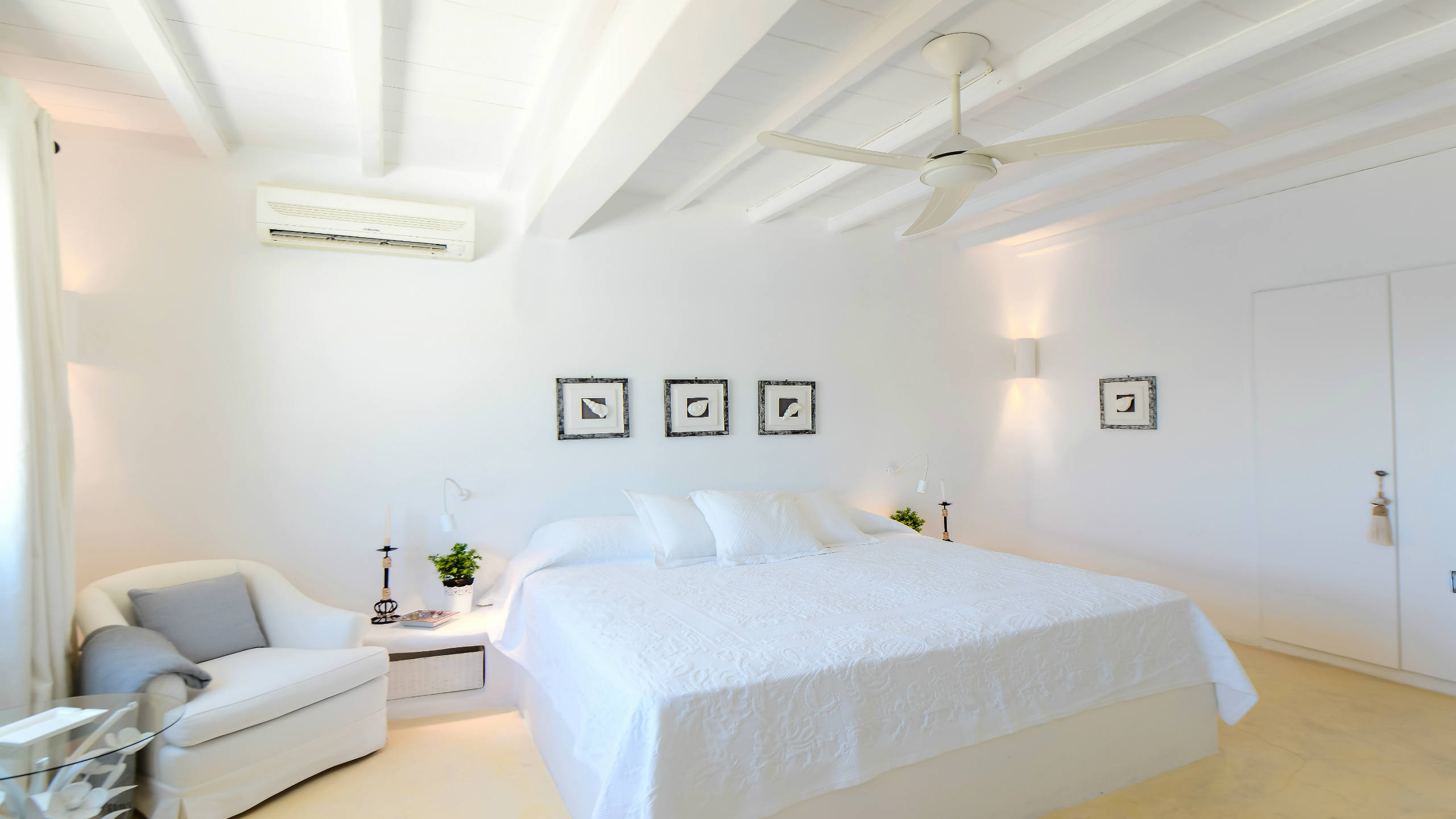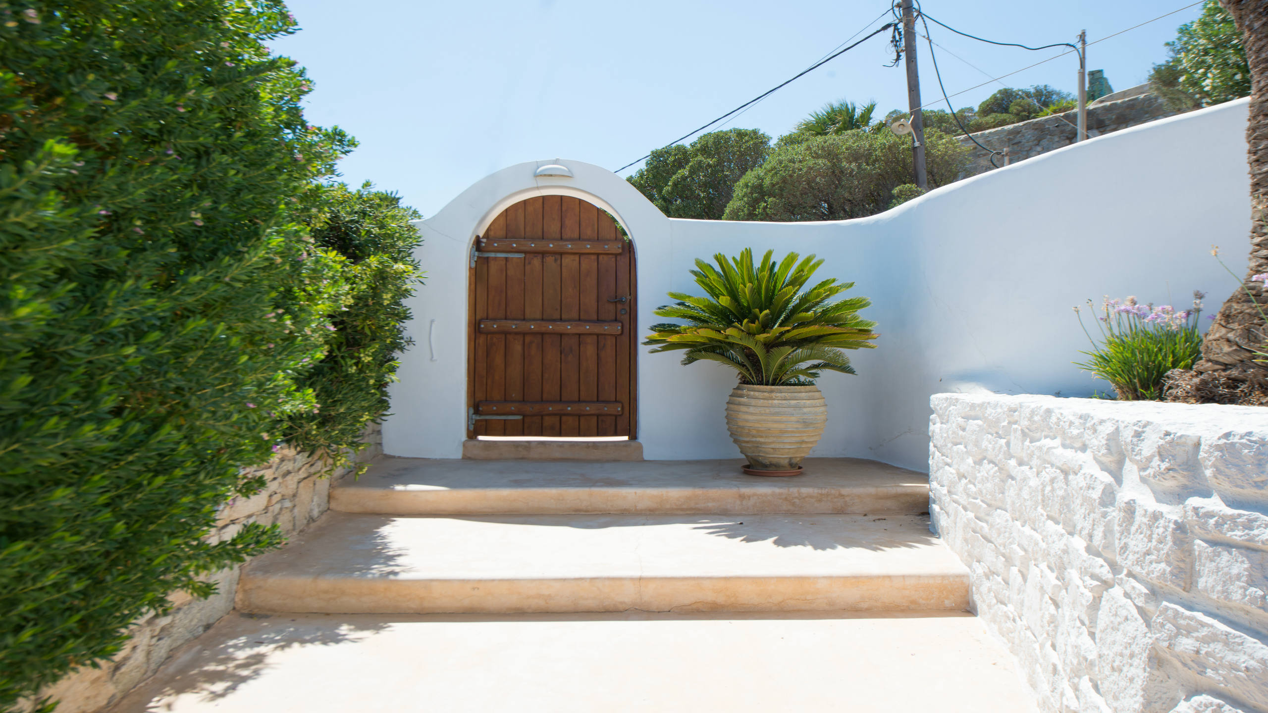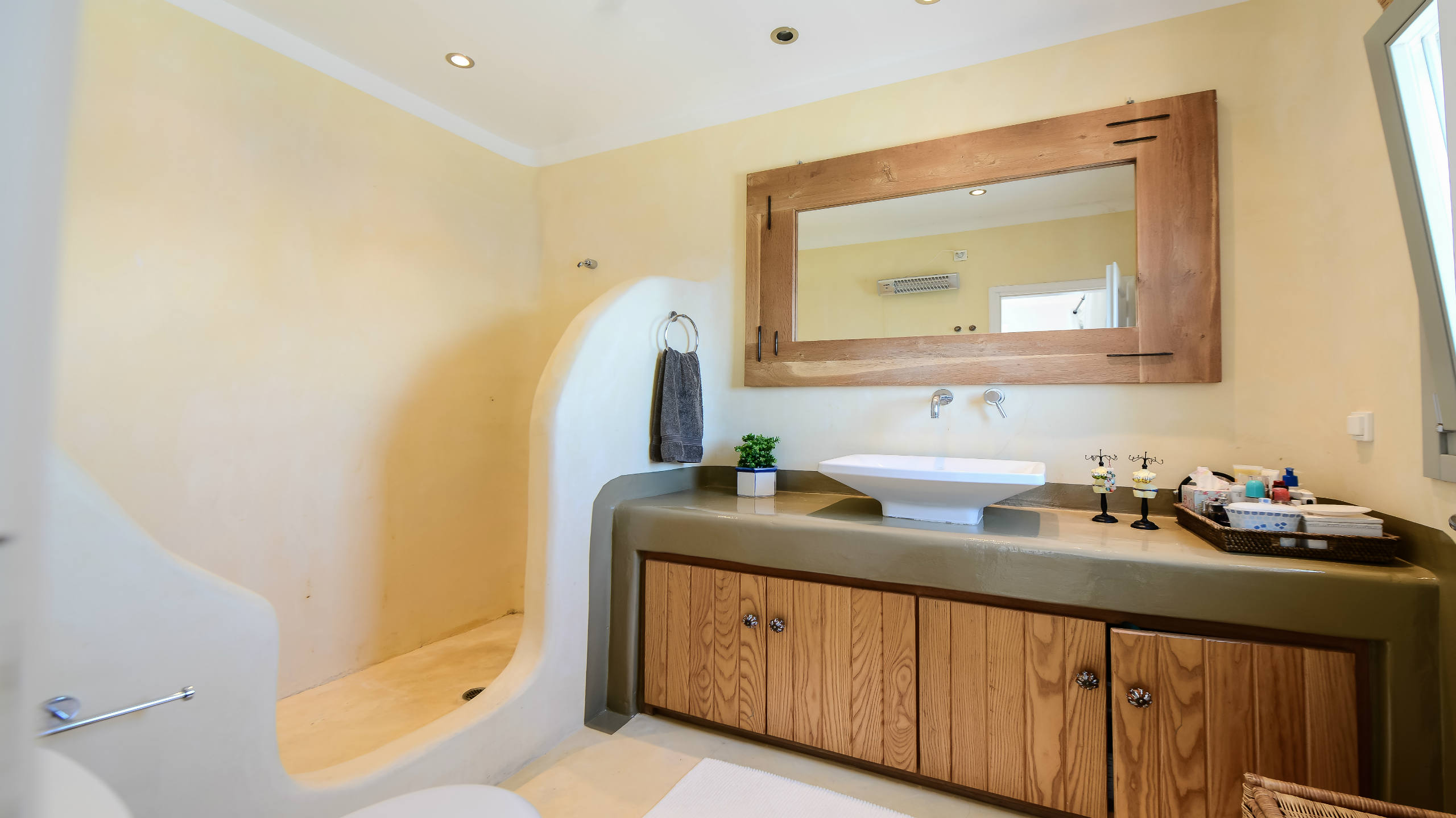 The Villa boasts 4 comfortable double bedrooms, one with its independent entrance and all en suite. Indoors, its pleasant warm colours combine with the Cycladic white to create a homey summer ambience,  Its outdoors offers spectacular views of the surrounding area.