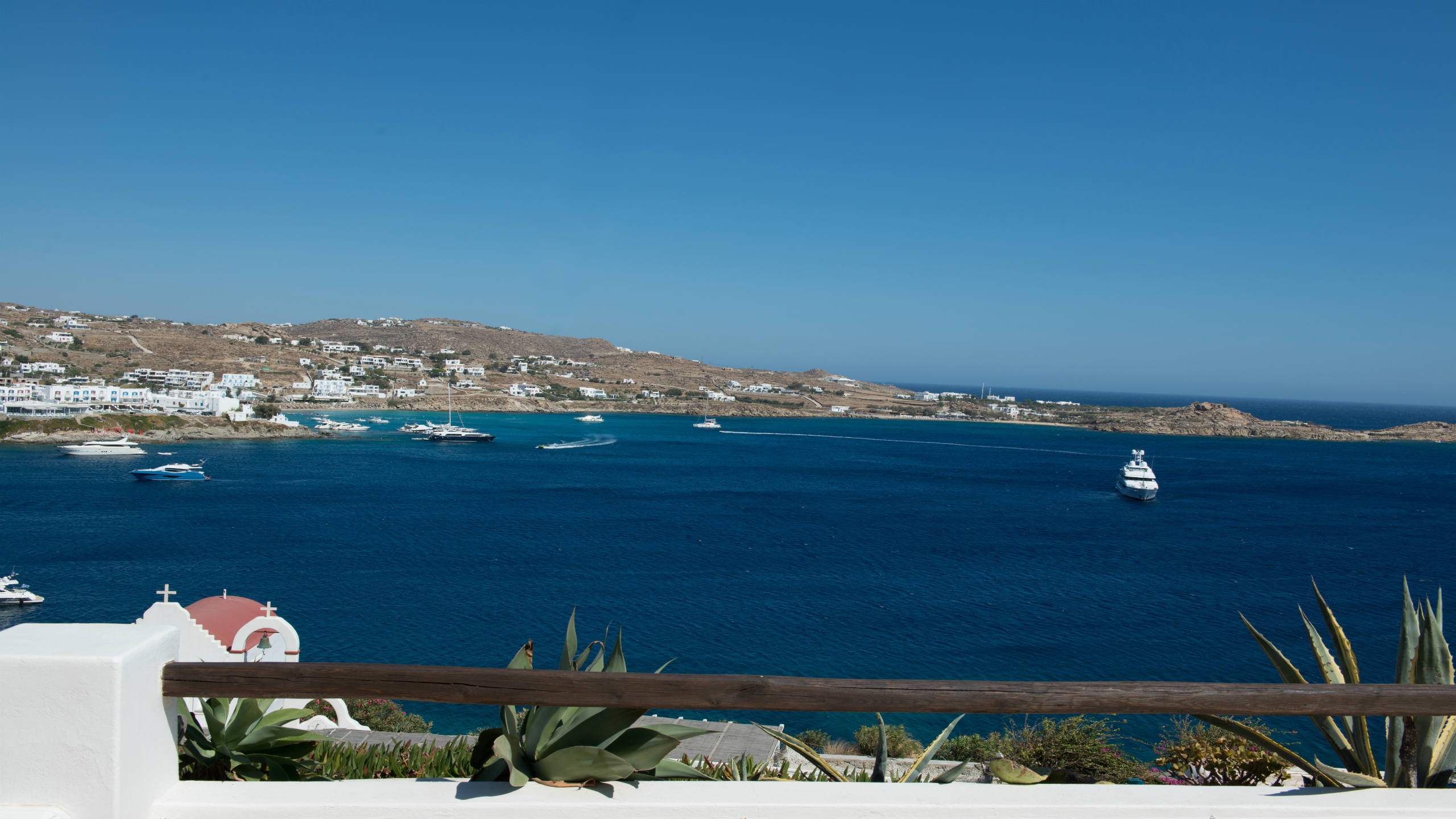 Villa Azure rests peacefully overlooking one of the most popular of beaches that of Psarou and Nammos Beach Bar and Restaurant. The Villa is in a privileged location in the area of Agios Lazaros facing east towards the open Aegean with wonderful views of the Bay and its parade of super and motor yachts. Chilling out on its terrace is an experience onto itself. Amphitheatrically facing the Beach, guests can lay down on the terrace and gaze at the happenings whilst soaking the sun.  Within just a 5 minute stroll along a private footpath guests can join Psarou Beach’s  reverberations