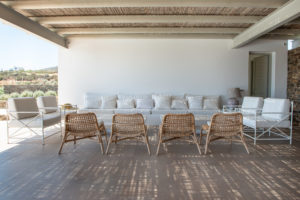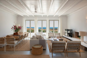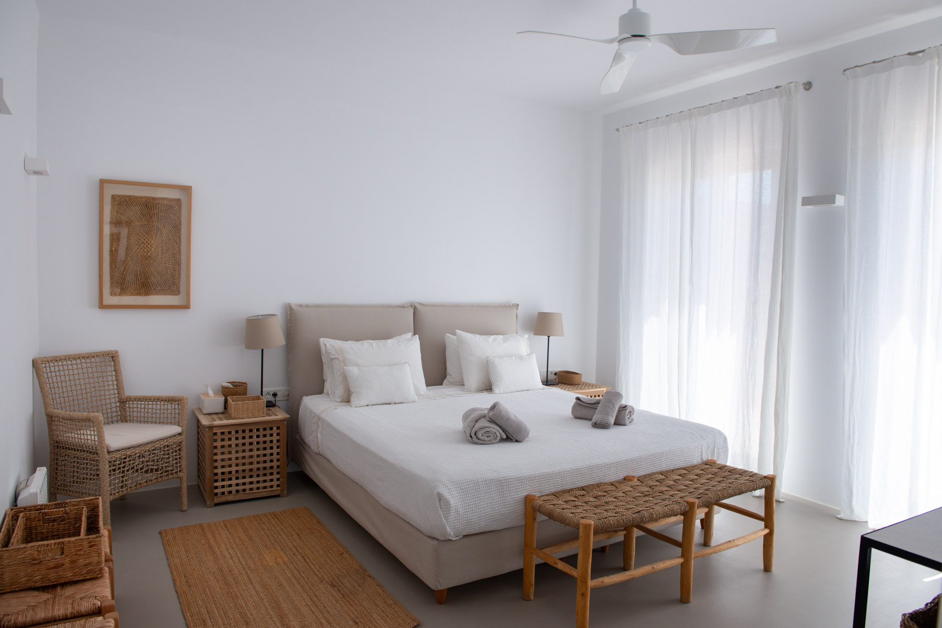 The flat design offers easy outdoor access from all interior spaces radiating the sea side easy living of the Aegean. A unique summer ambience enhanced by the white furniture, fabrics and surfaces that blend harmoniously with the local stones, and the wooden décor touches of bamboo and rattan pieces of furniture.