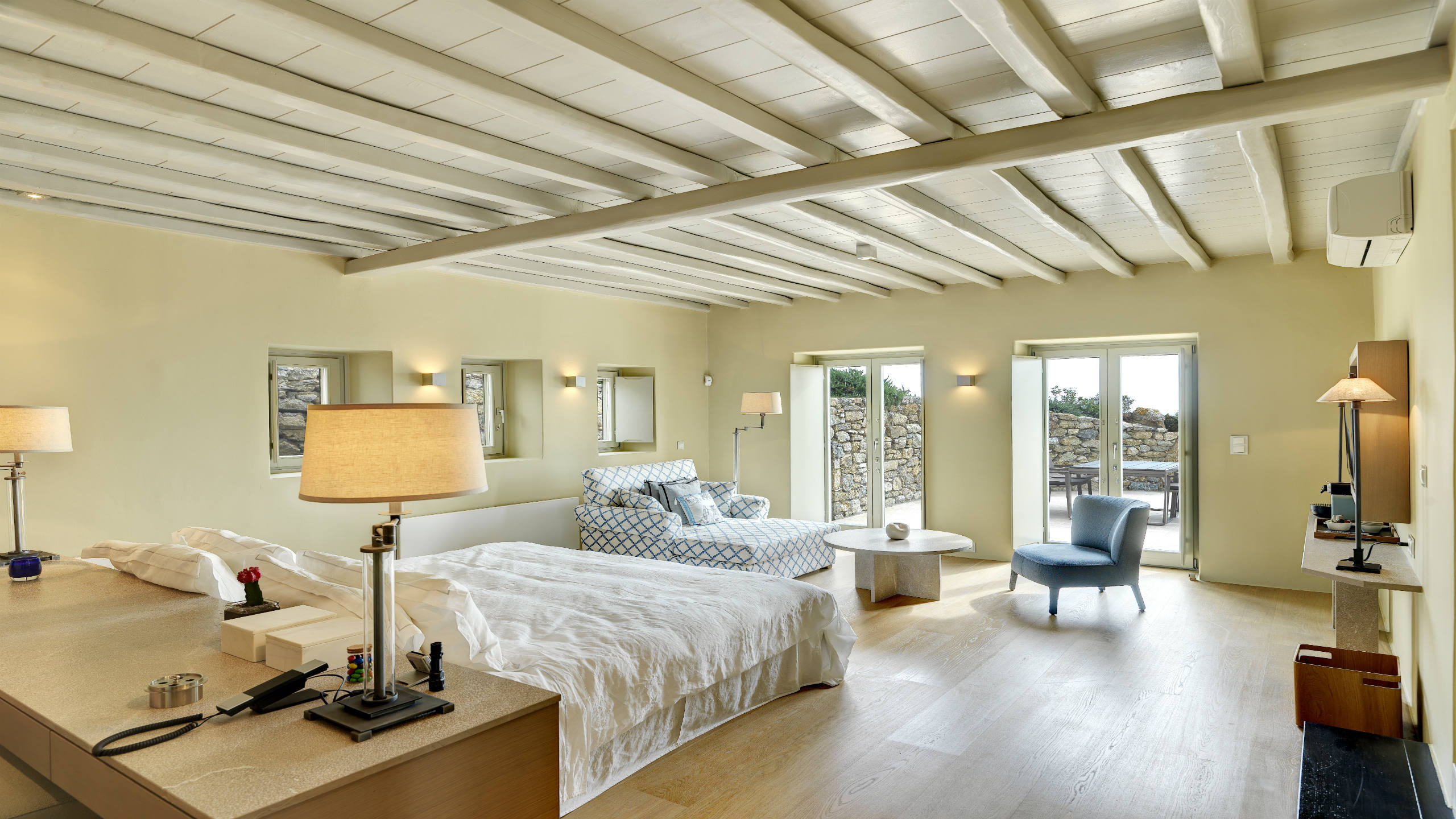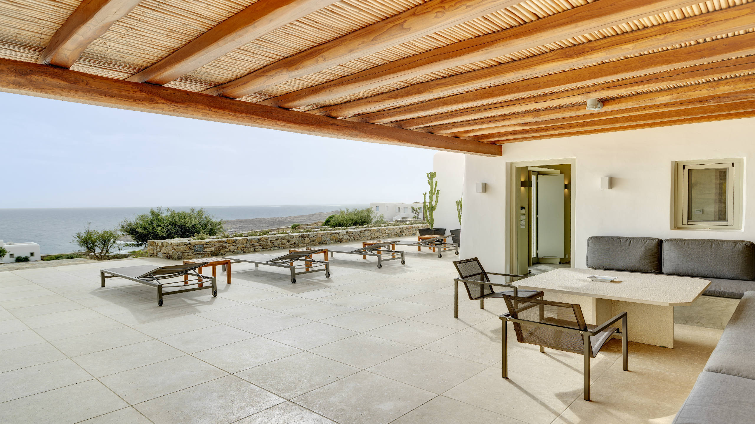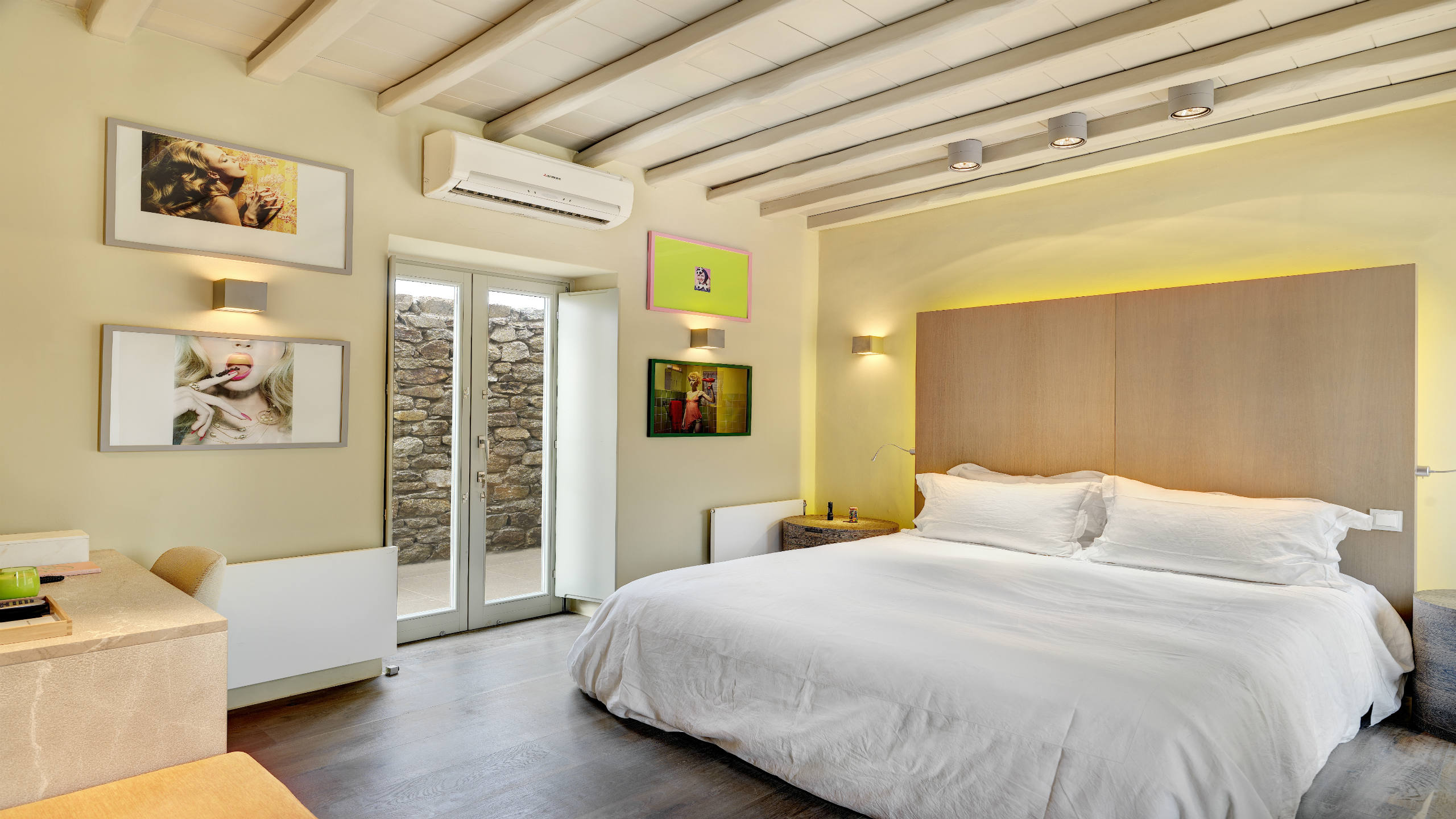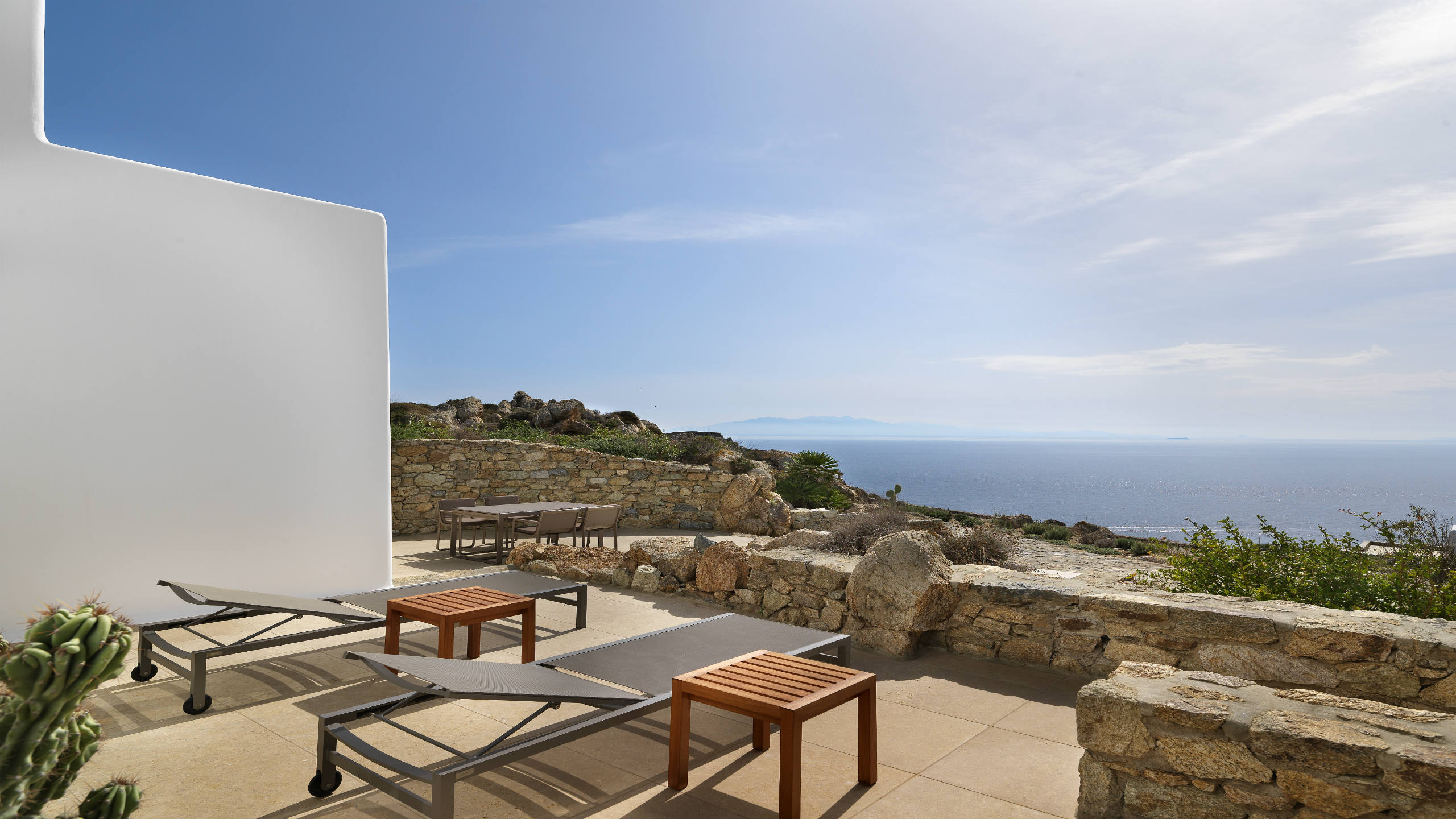 Double bedroom with en-suite bathroom, walk-in closet, independent terrace for sunbathing and outdoor dining area.