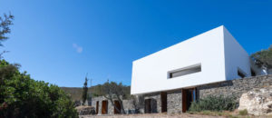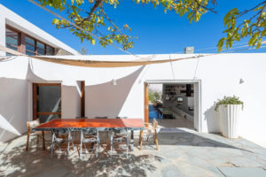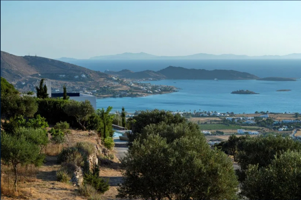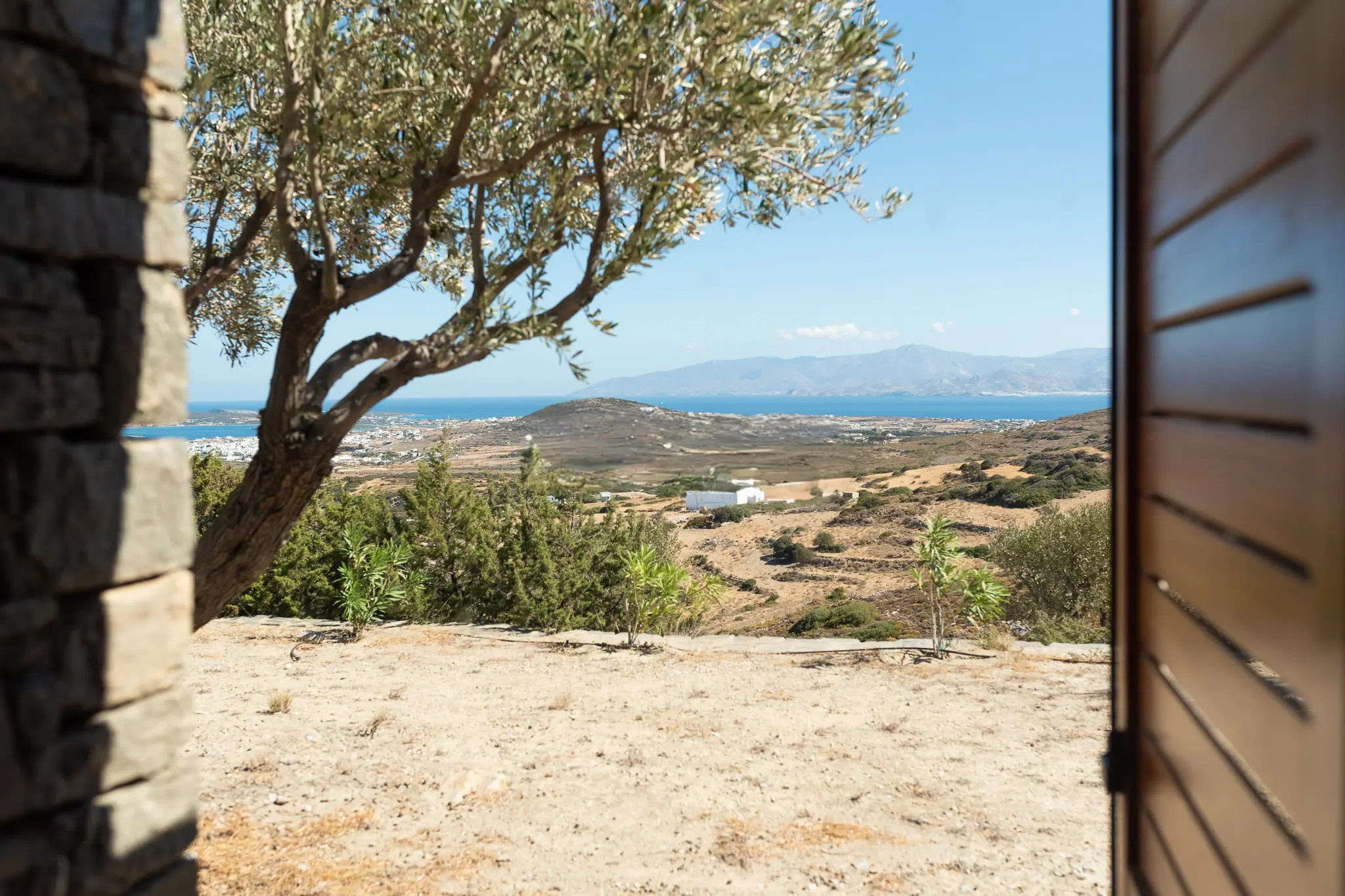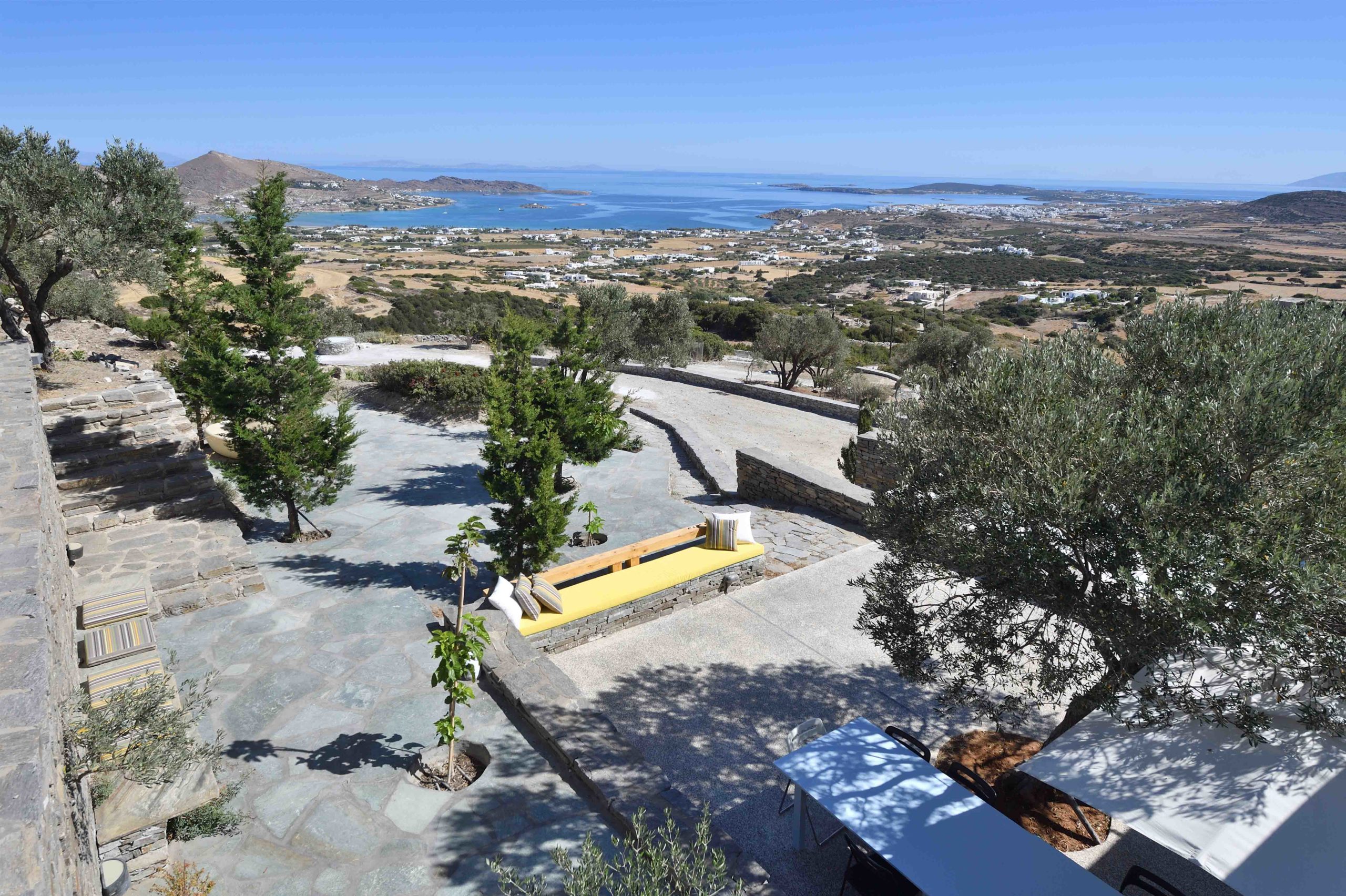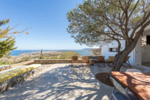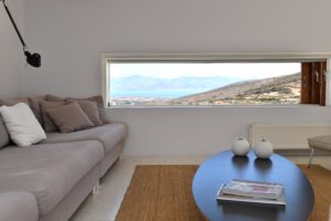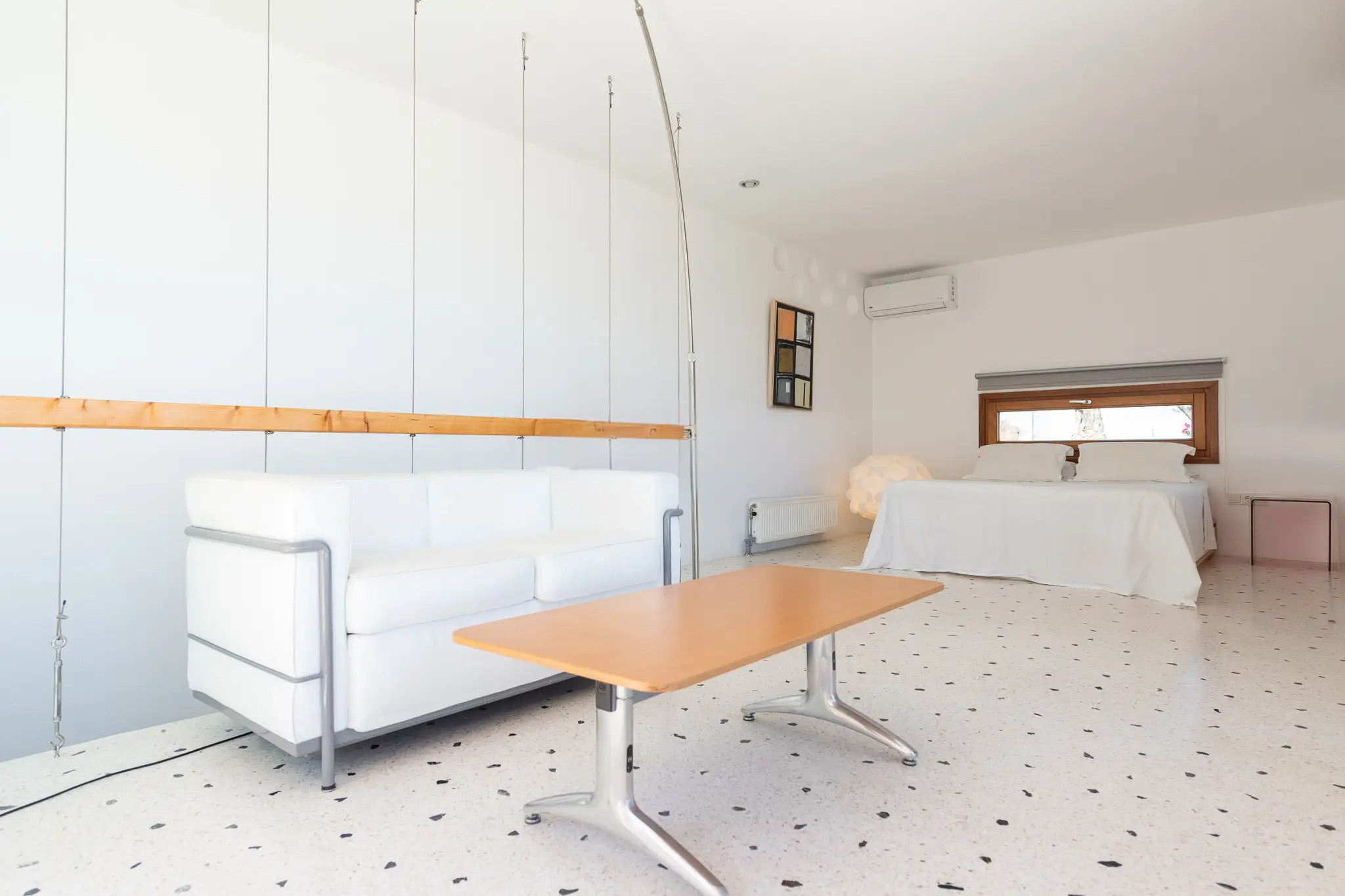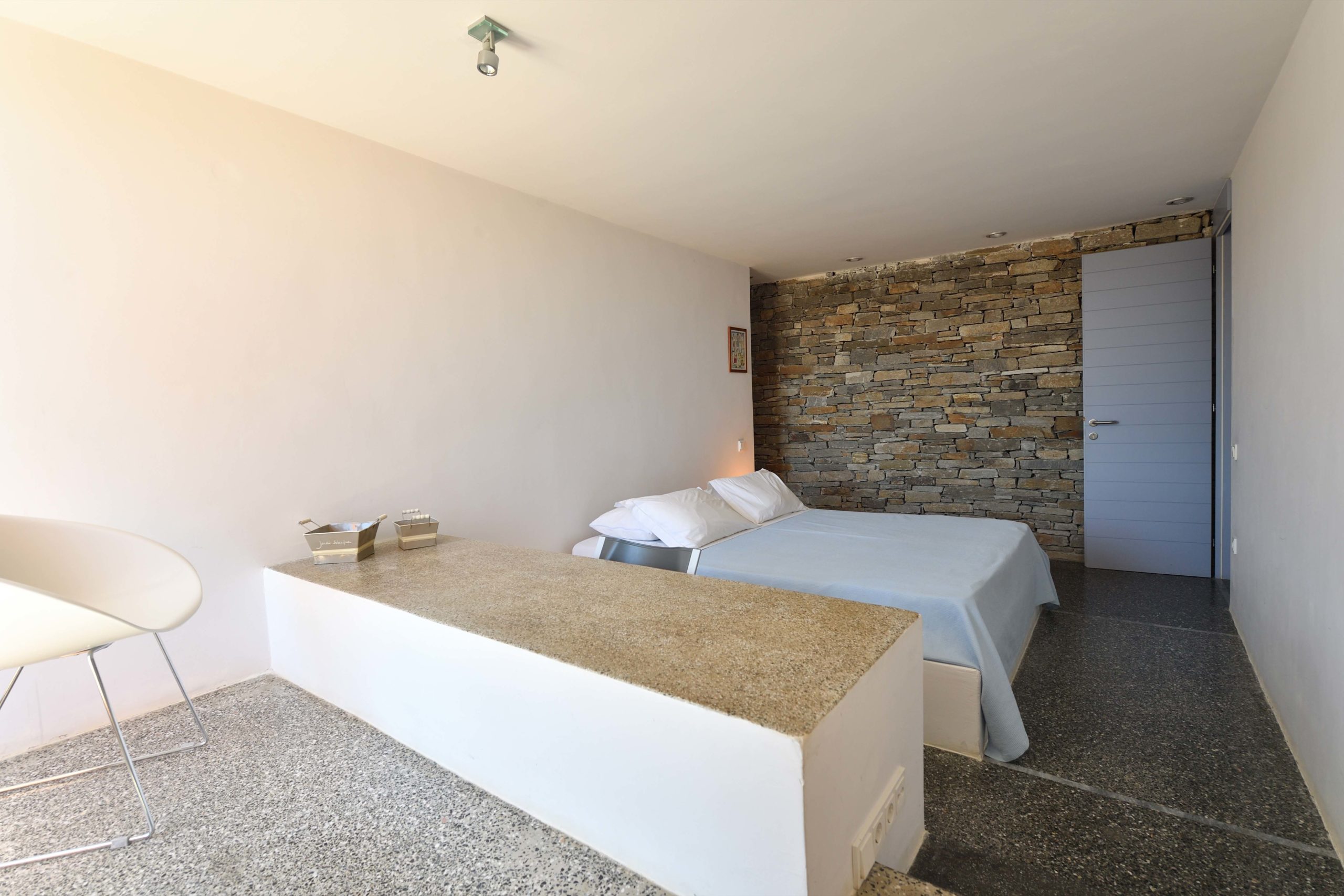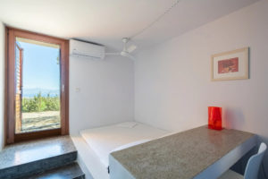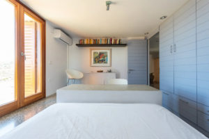 Master bedroom with a double bed, sea view, and access to the roof, its own bathroom at a lower level.