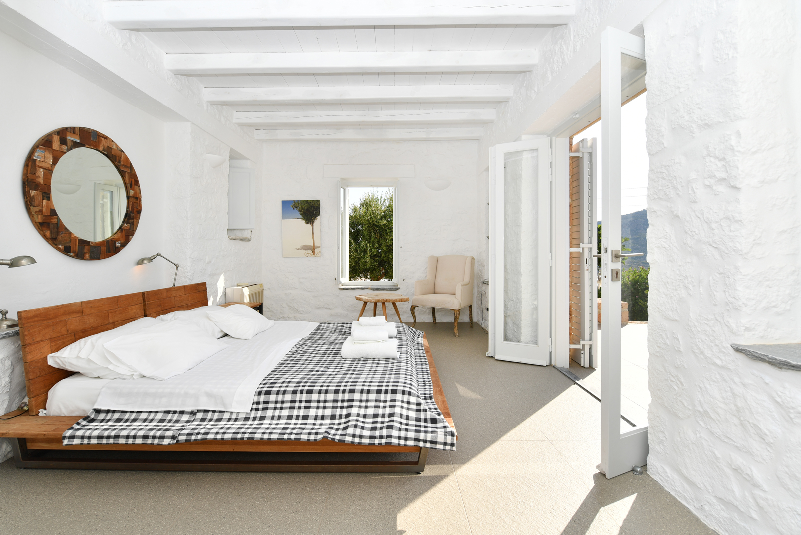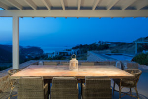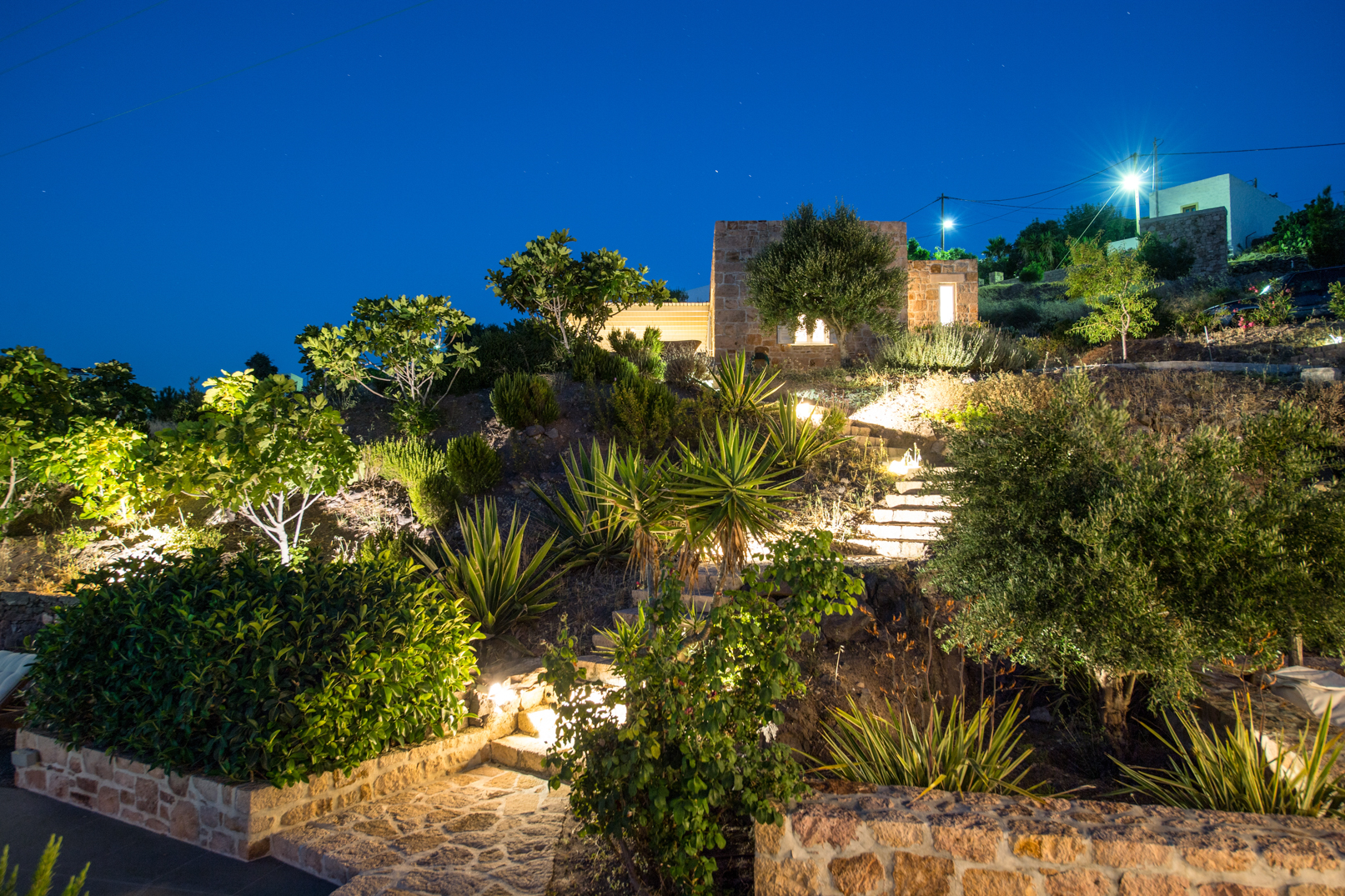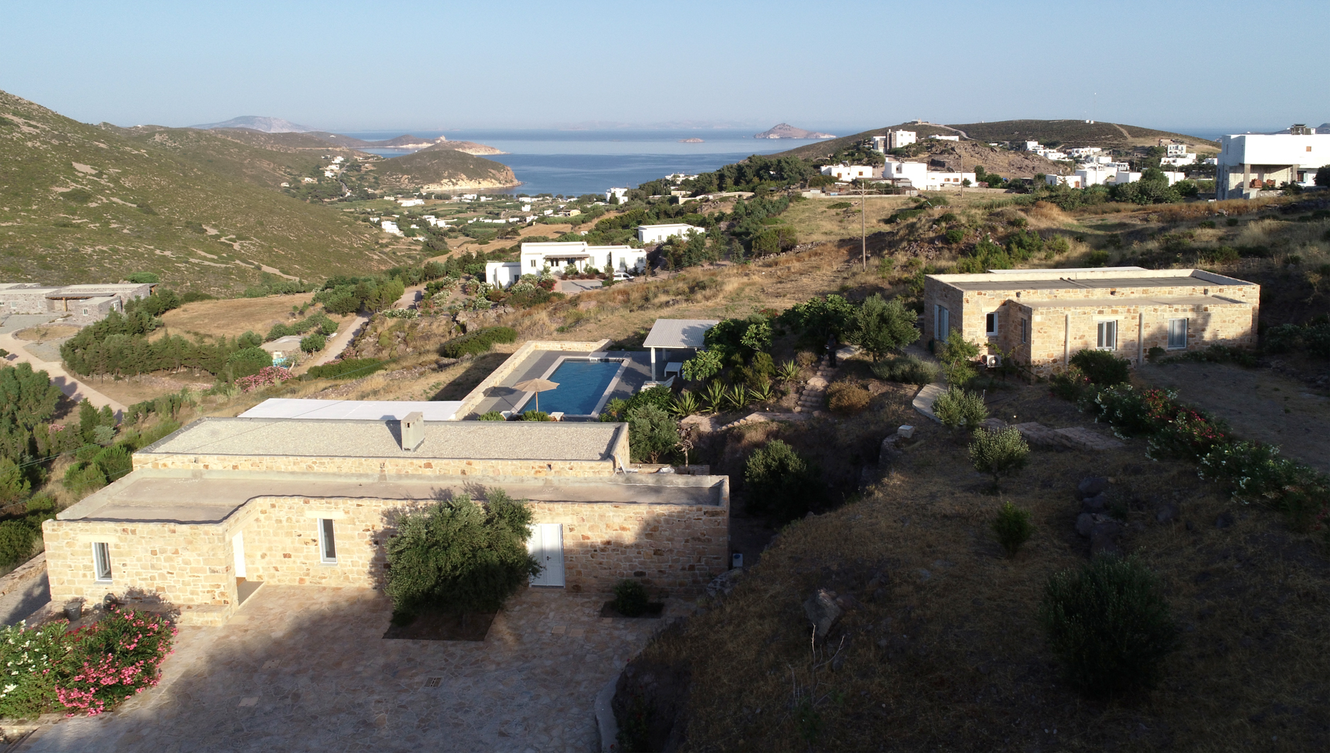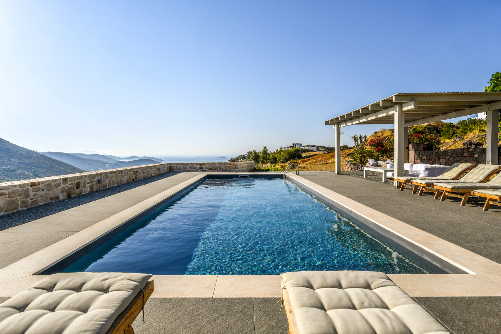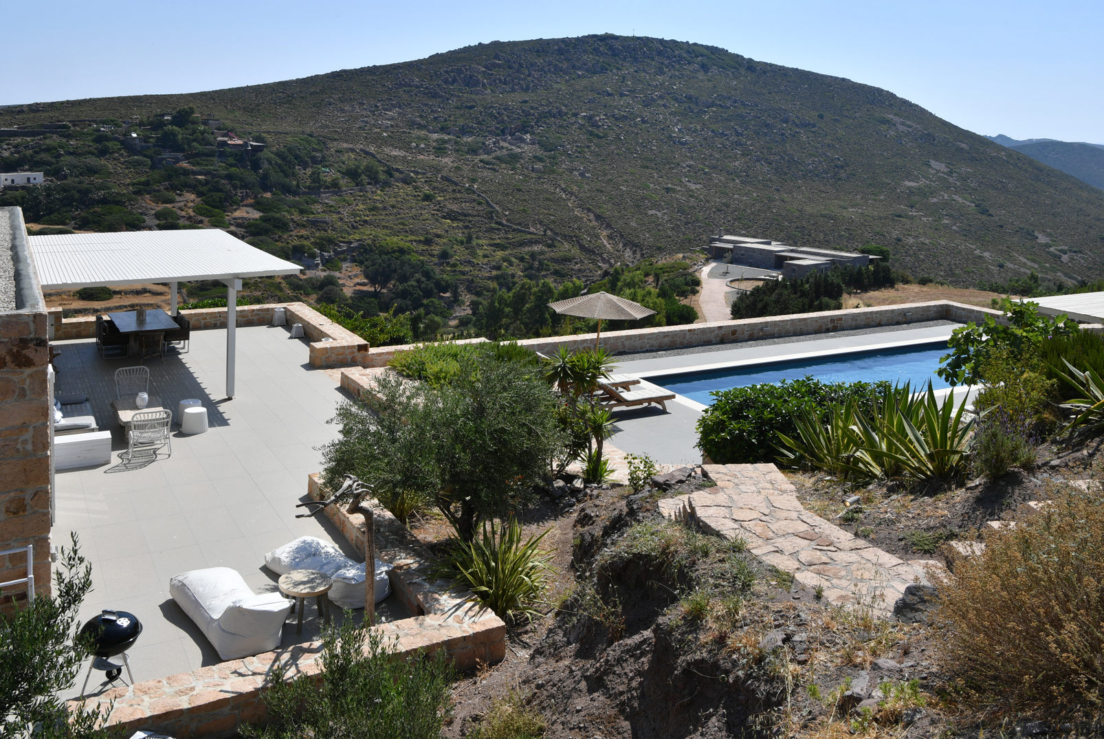 The Villa was built with hand crafted local stone timeless and elegant. A variety of local Mediterranean plants embellish the landscape, adding to the uniqueness and beauty of its surroundings. The Villa is situated on a large plot overlooking Kampos Town and Kampos bay surrounded by unspoilt natural beauty with spectacular views of both the mountain and sea.