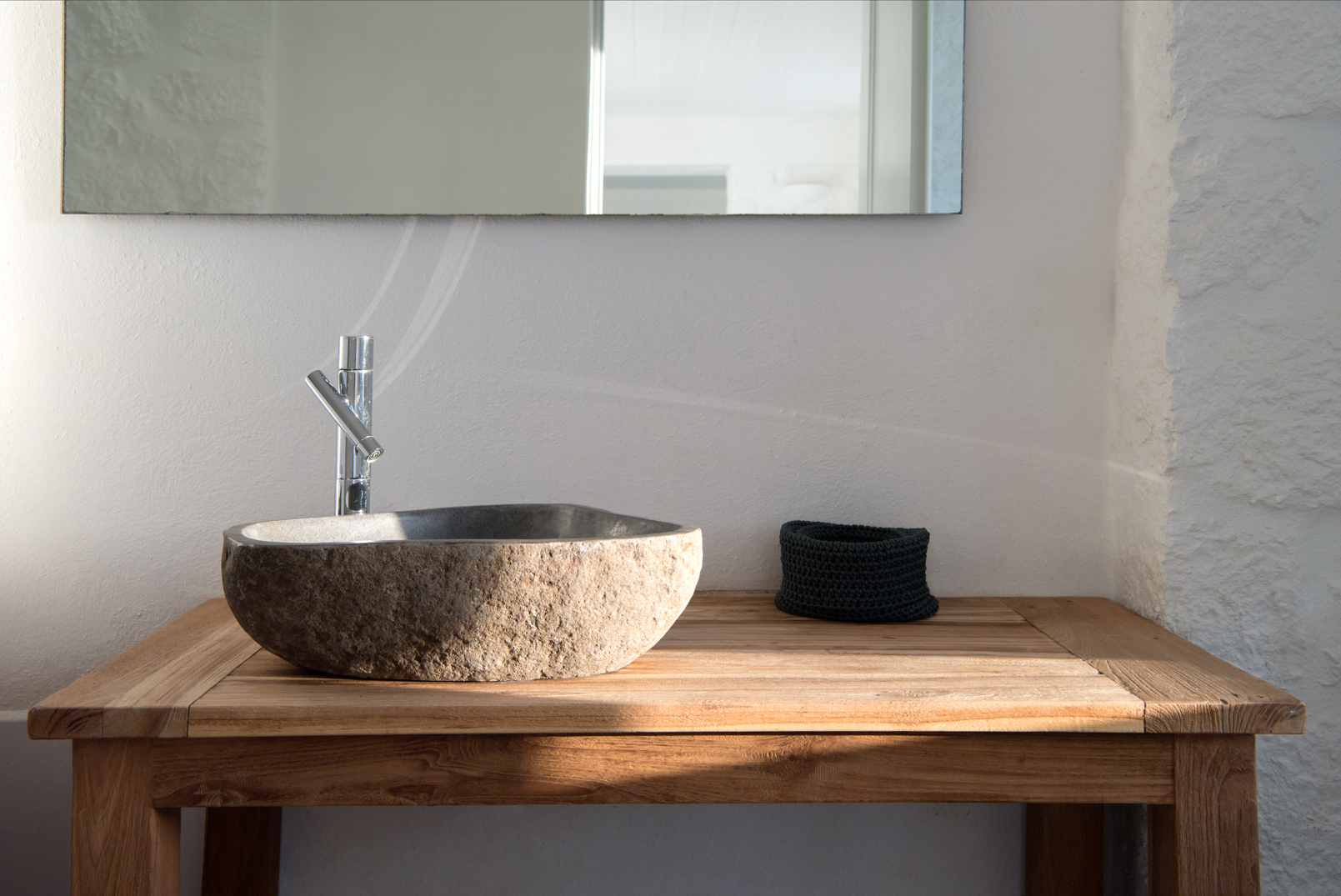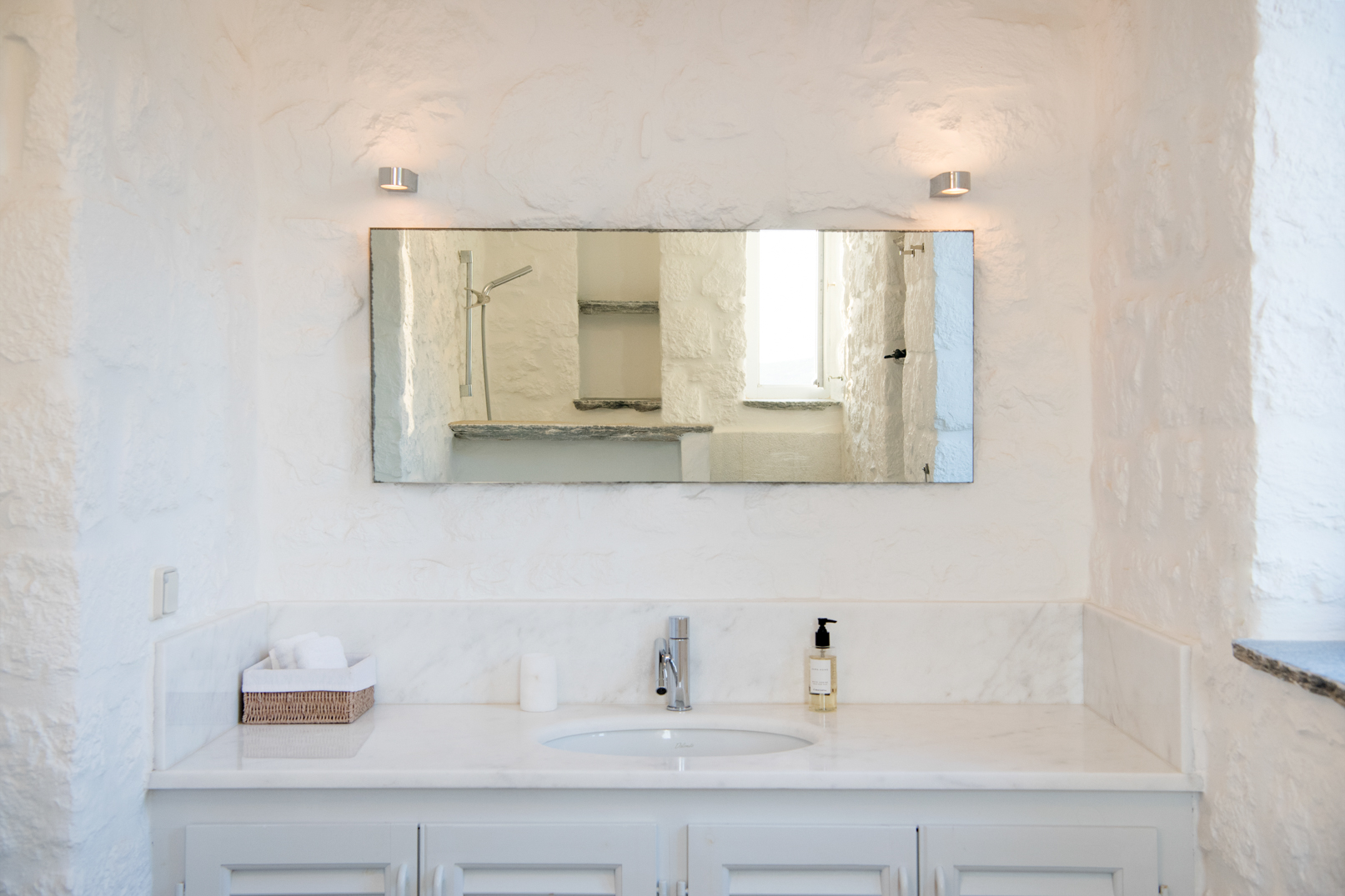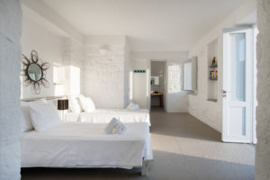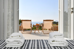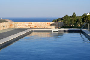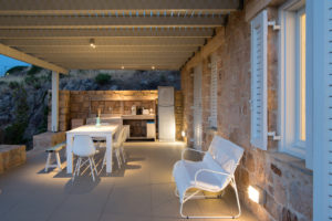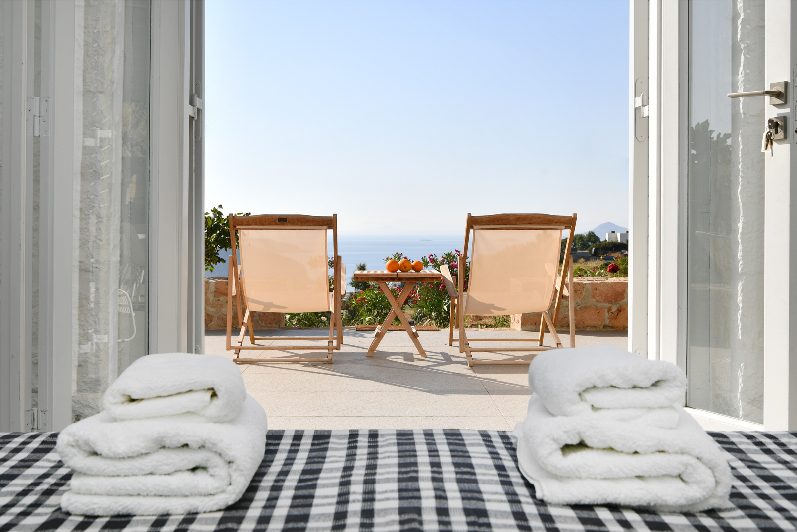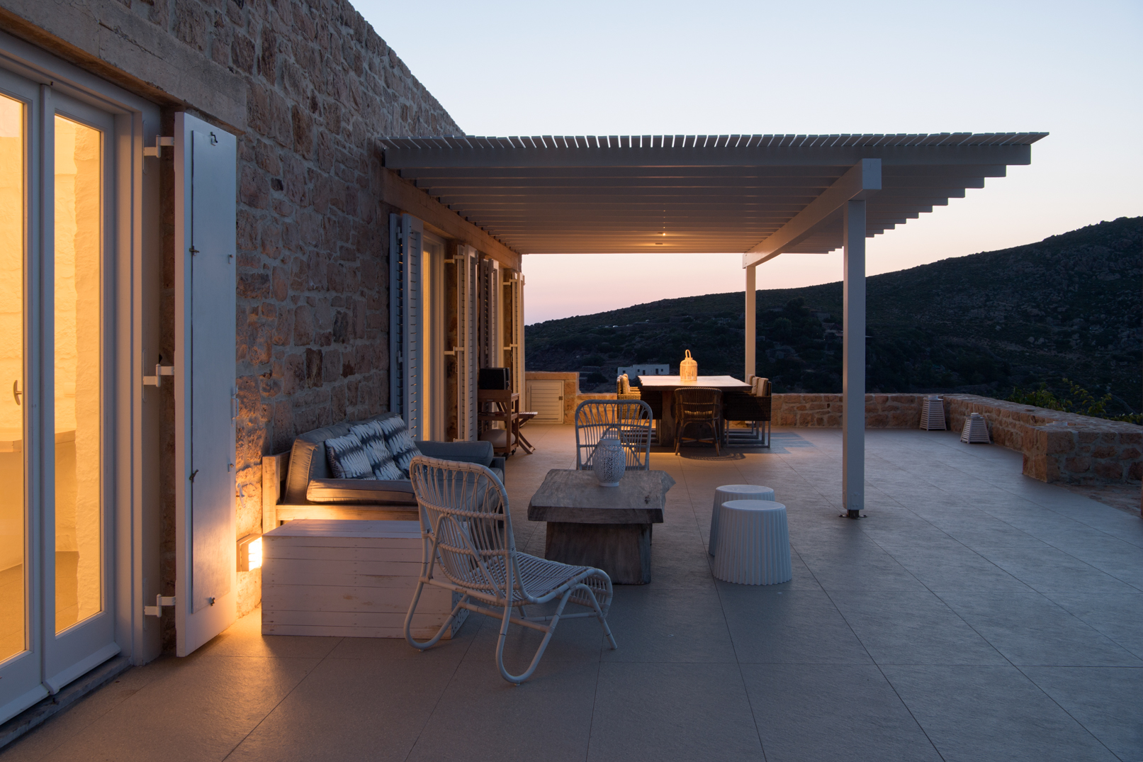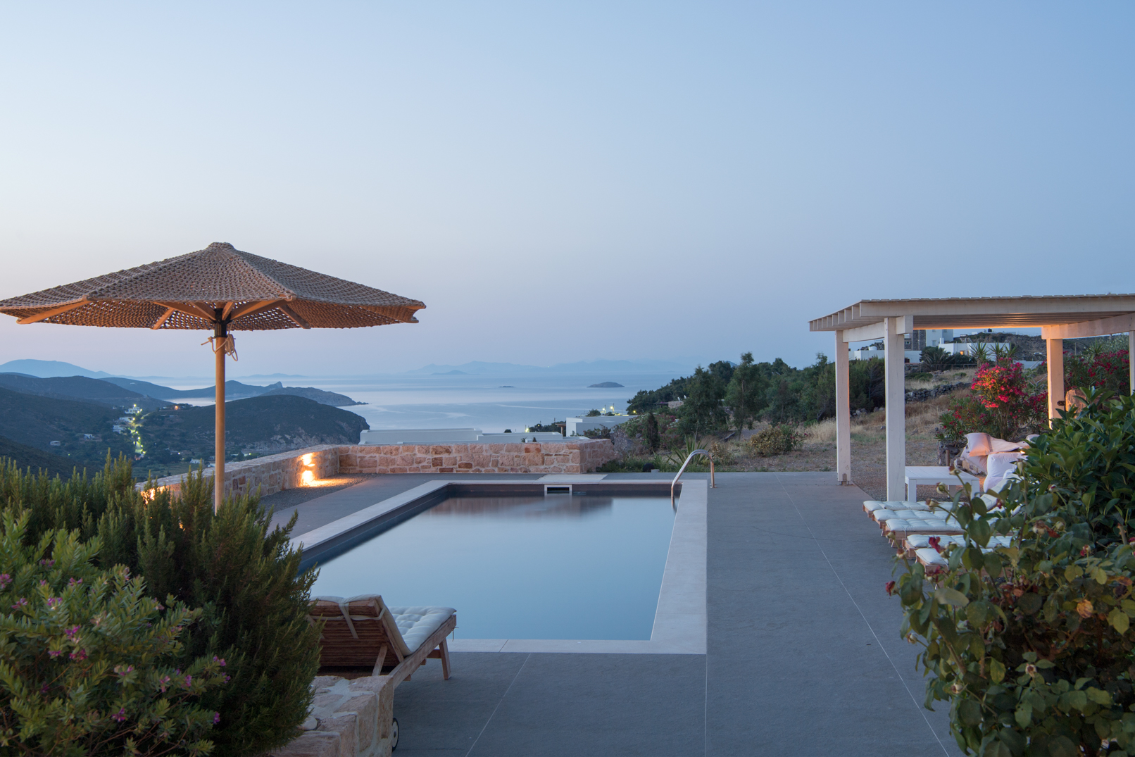 The Villa was built with hand crafted local stone timeless and elegant. A variety of local Mediterranean plants embellish the landscape, adding to the uniqueness and beauty of its surroundings. The Villa is situated on a large plot overlooking Kampos Town and Kampos bay surrounded by unspoilt natural beauty with spectacular views of both the mountain and sea.