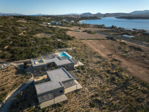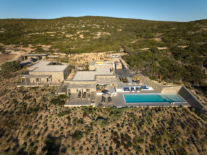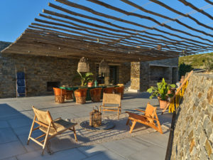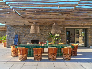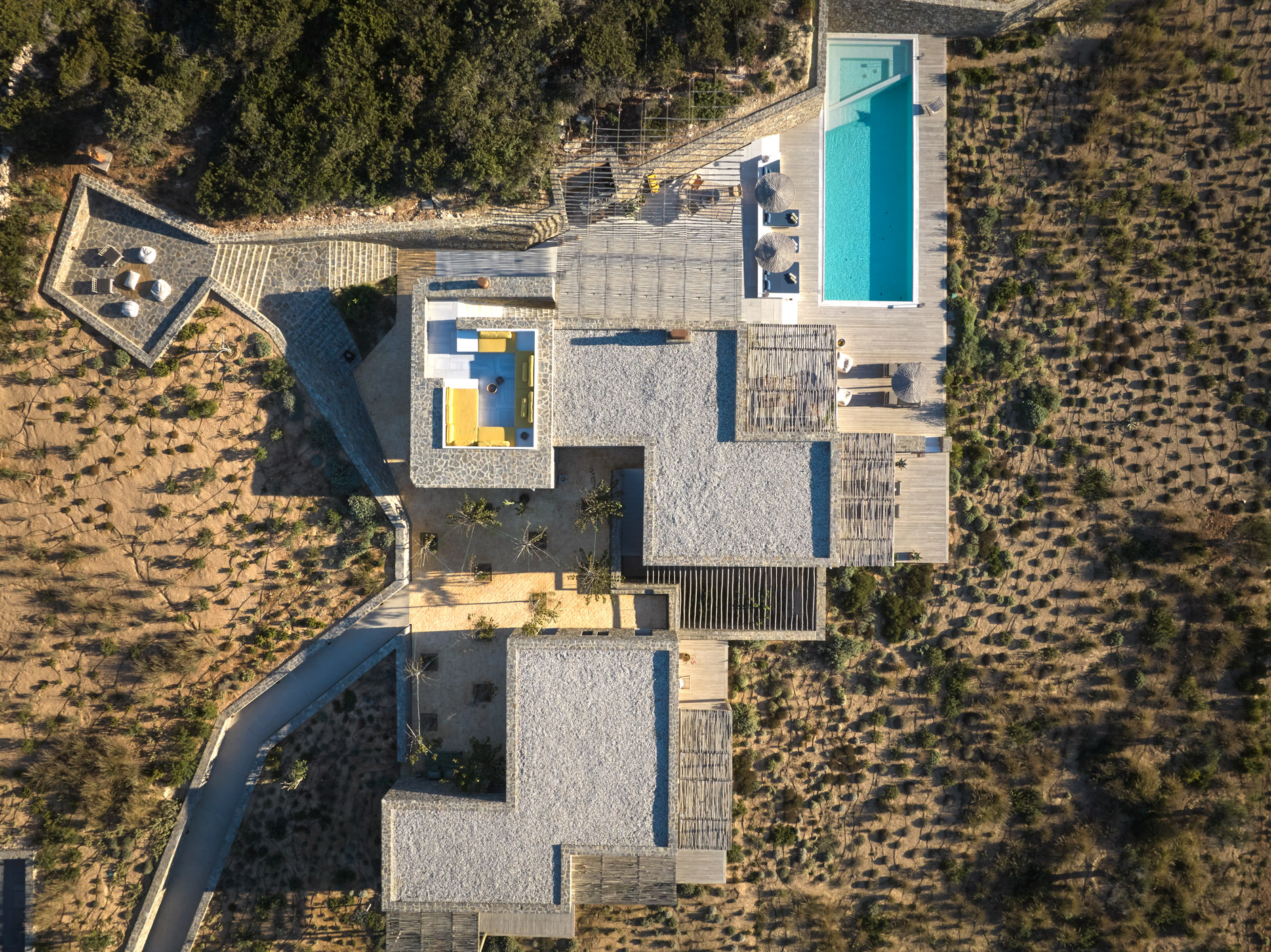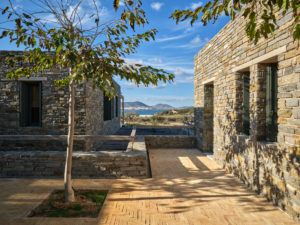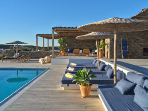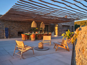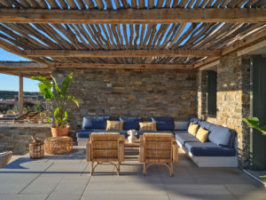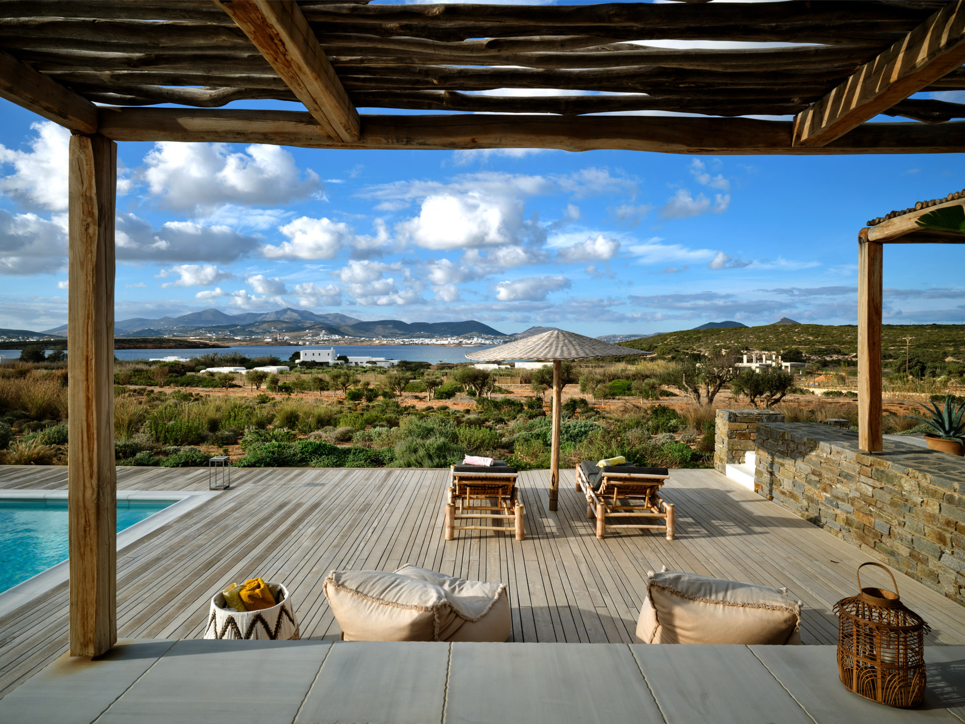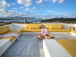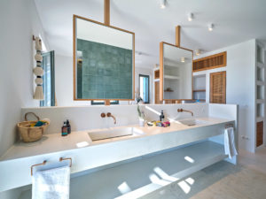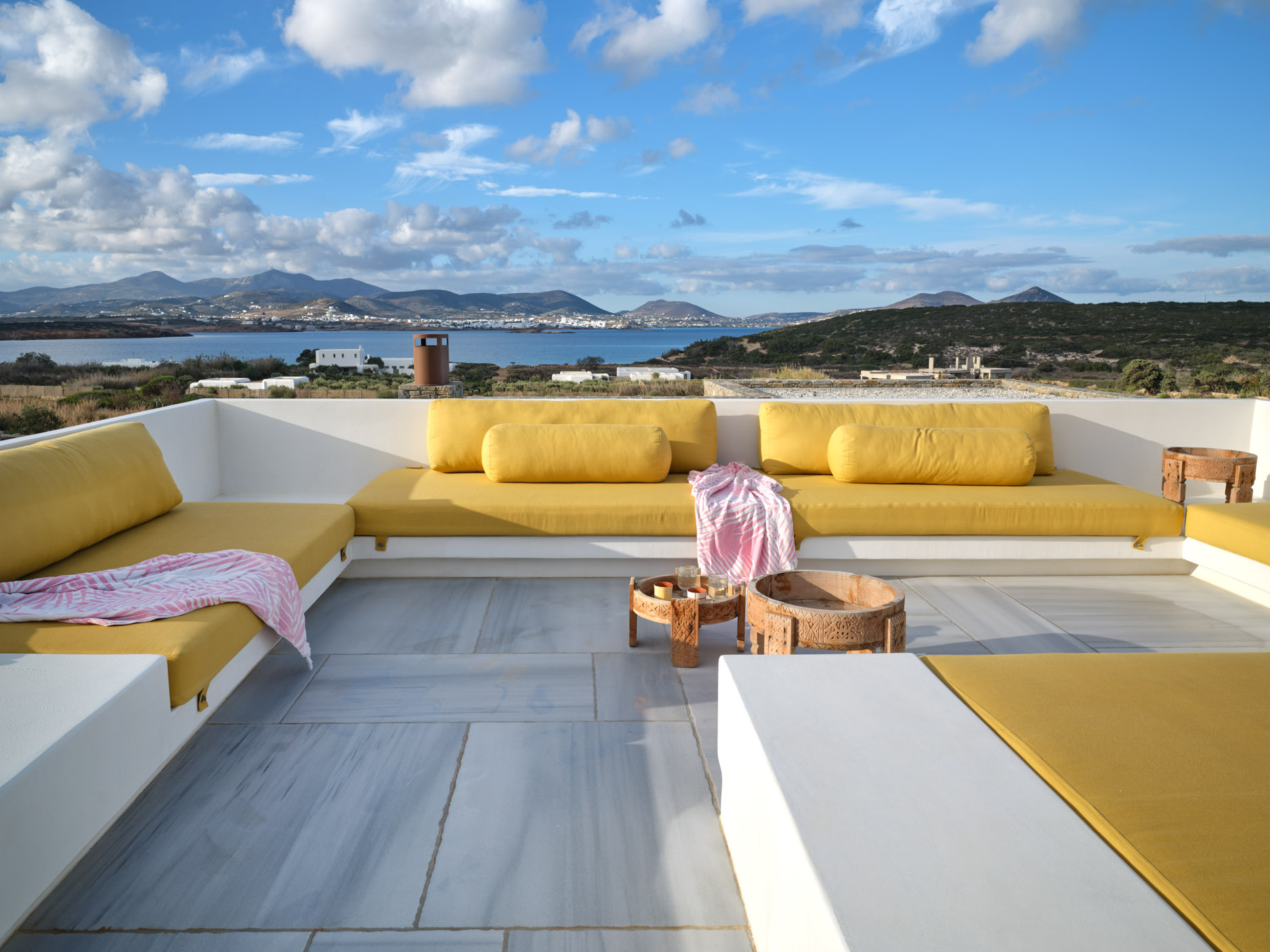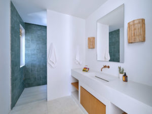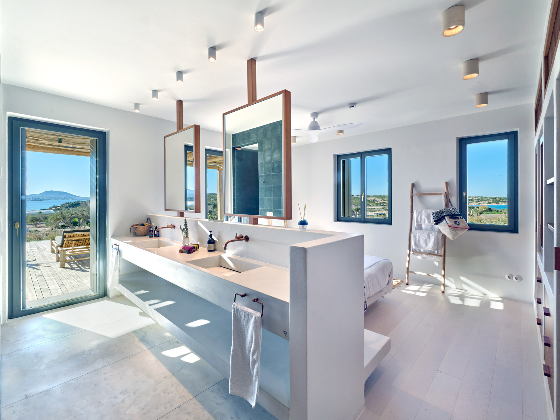 One double bedroom with a double bed, outdoor terrace with partial sea view, en-suite shower room (open plan sinks)