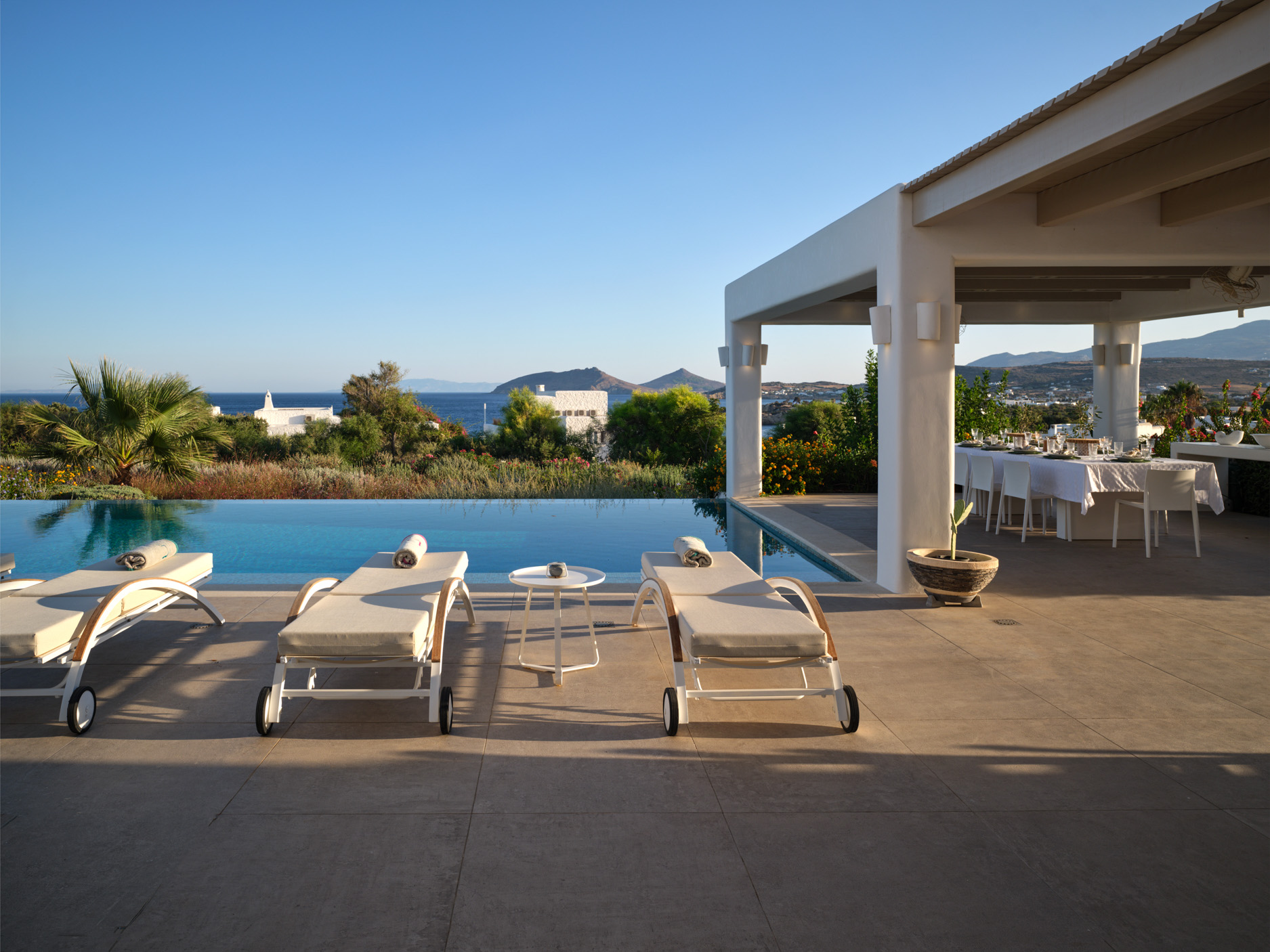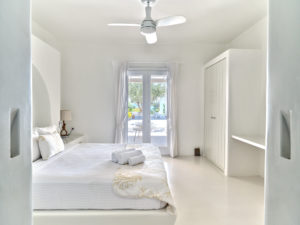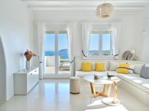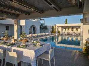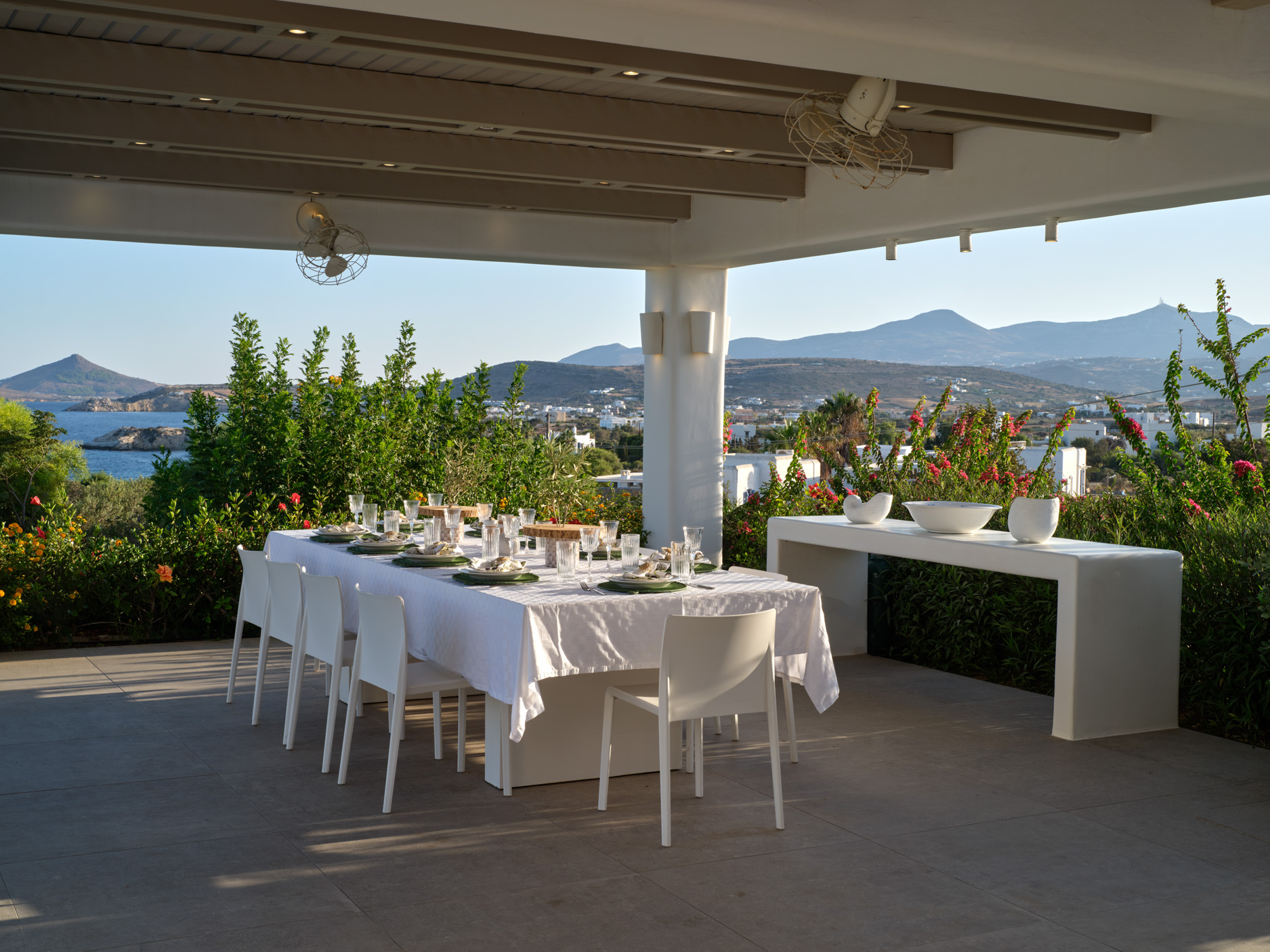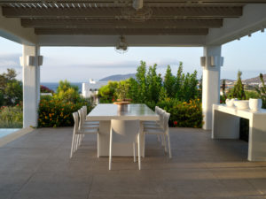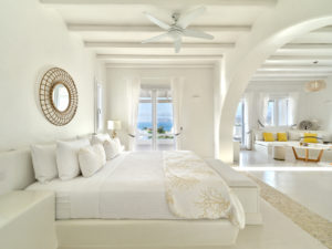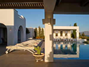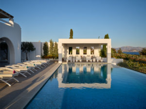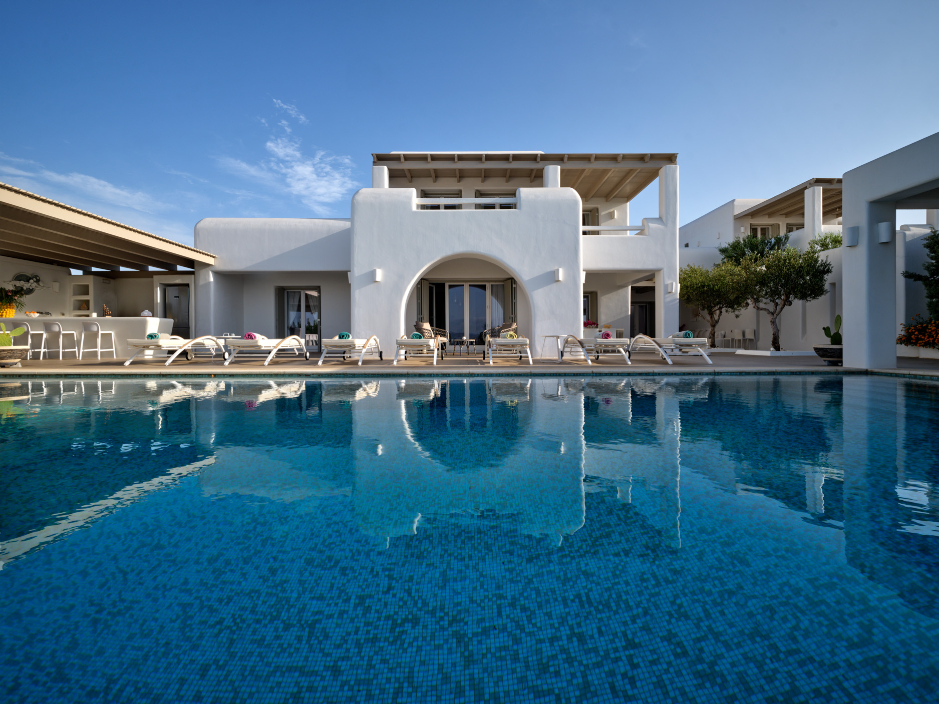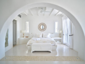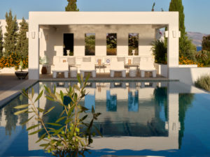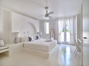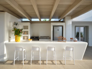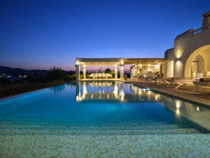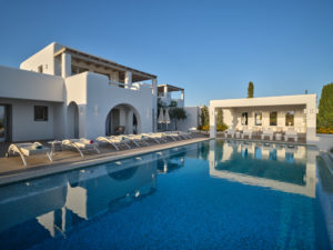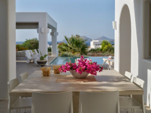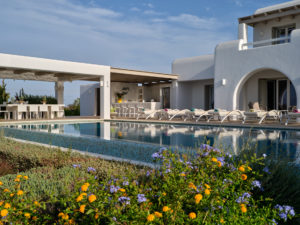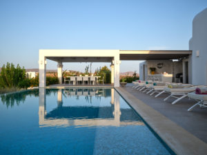 This brand new luxury 8-bedroom villa is located in Ampelas, overlooking the Aegean Sea and the island of Naxos. It boasts a fine fusion of Greek architectural integrity and modern finishes with all the luxuries of a five star hotel. Just a stone’s throw or 6-minute drive from the cosmopolitan town of Naousa, this is just the right property to enjoy a lavish, private stay on fabulous Paros.