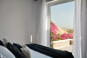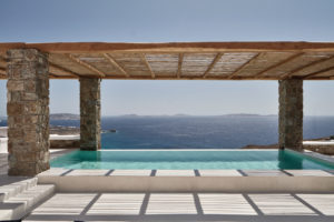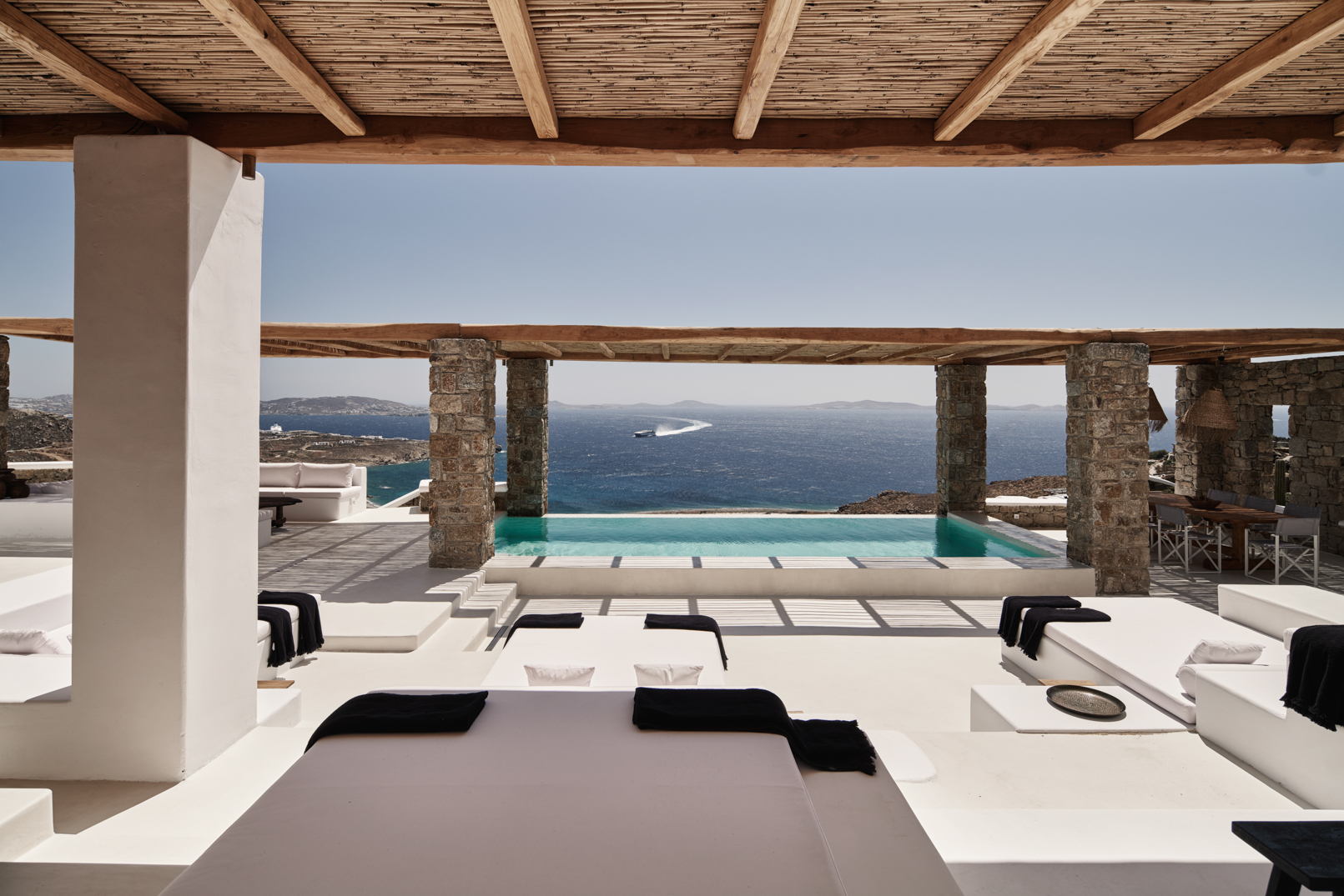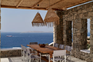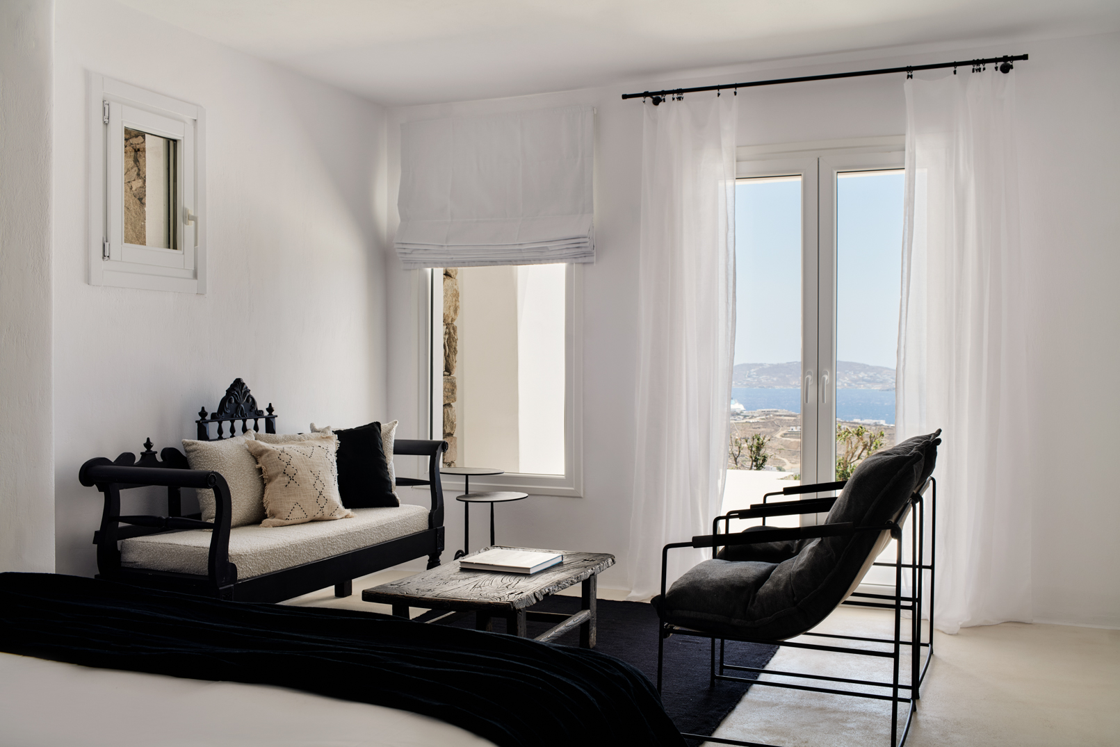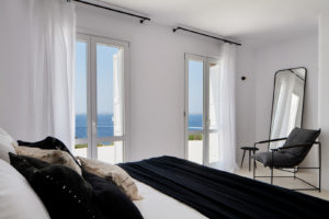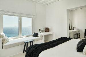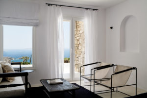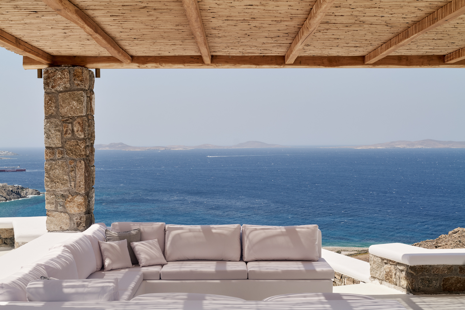 shaped built-in sofa and a tall glass opening with sea and sunset view