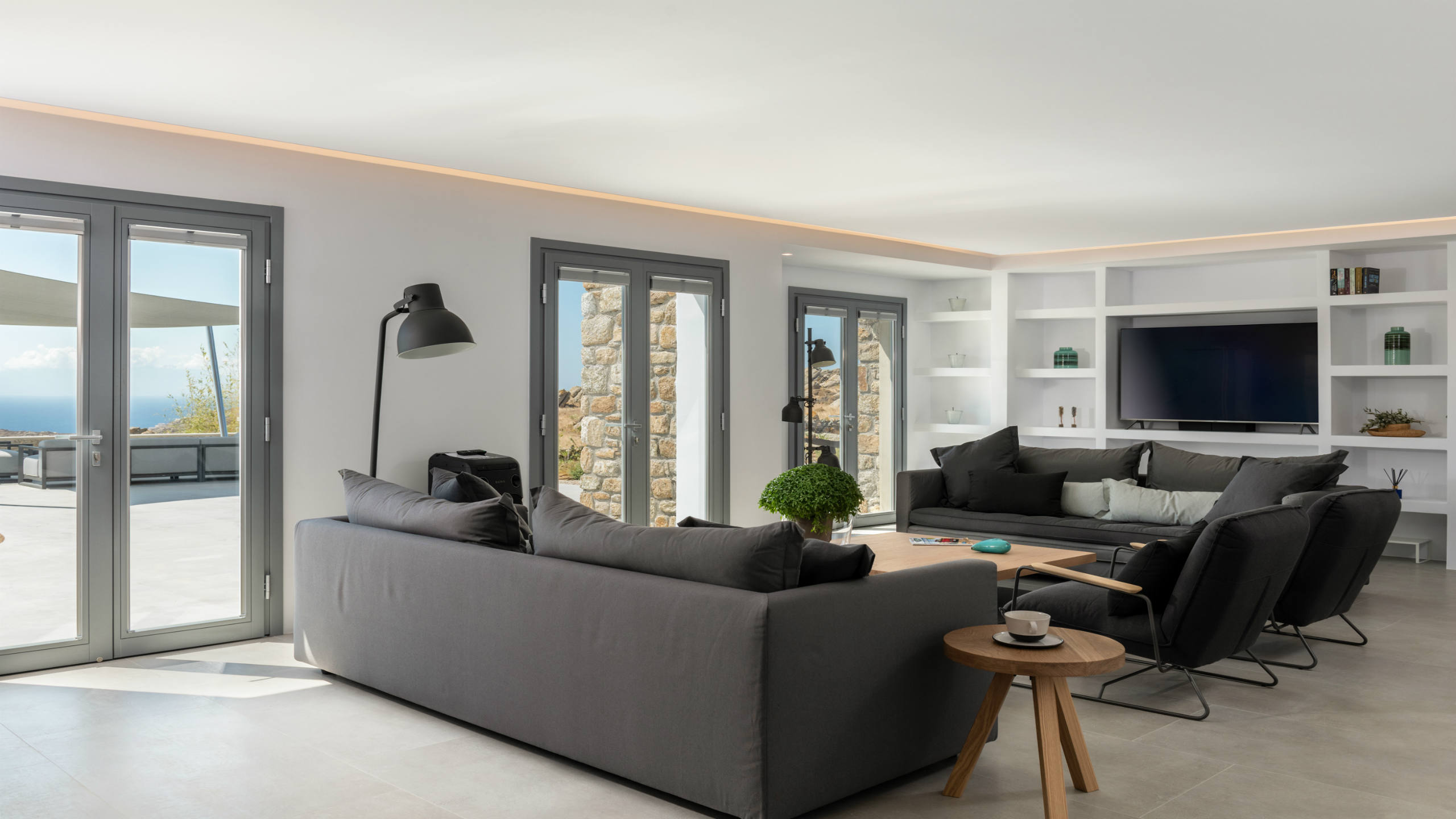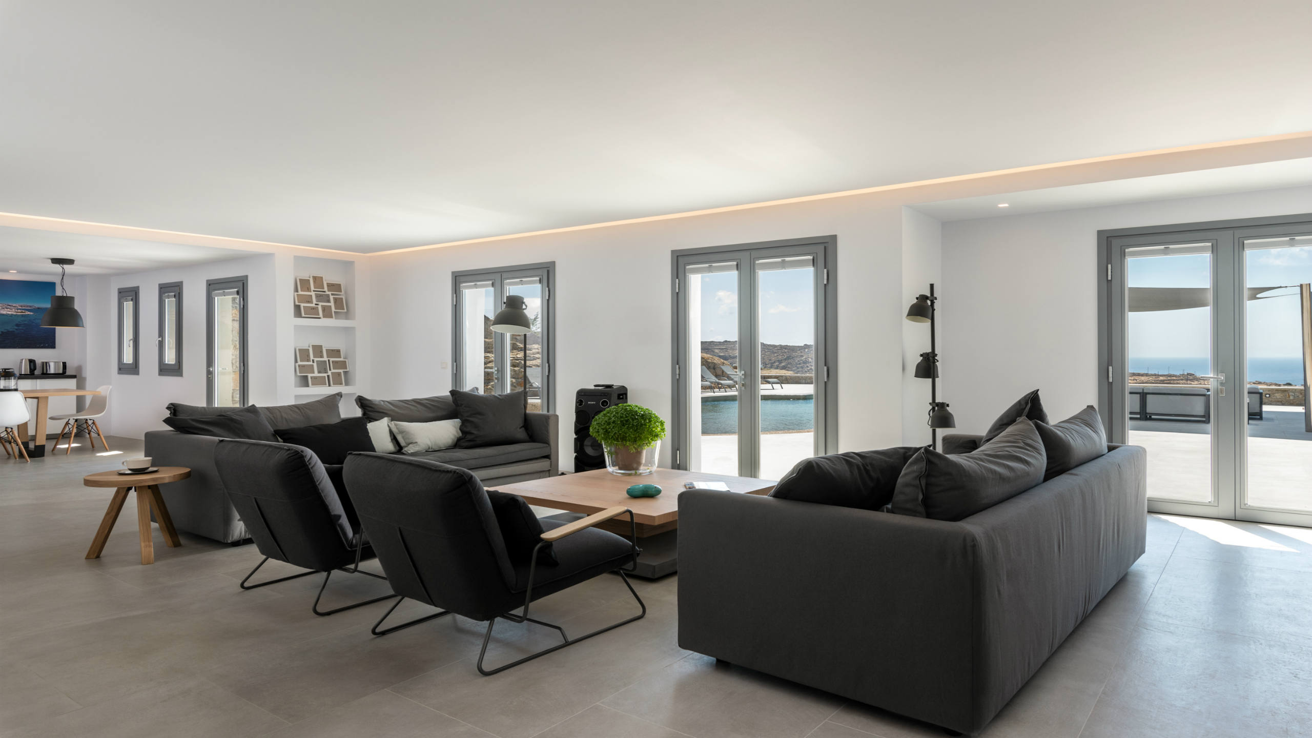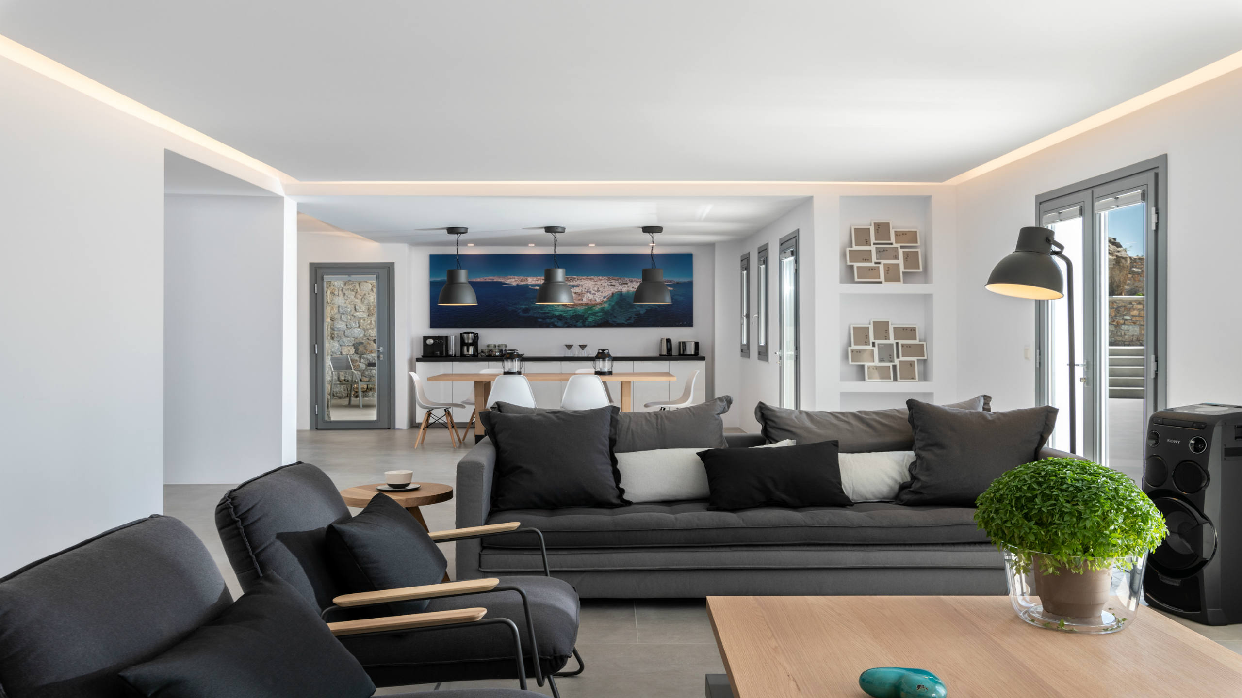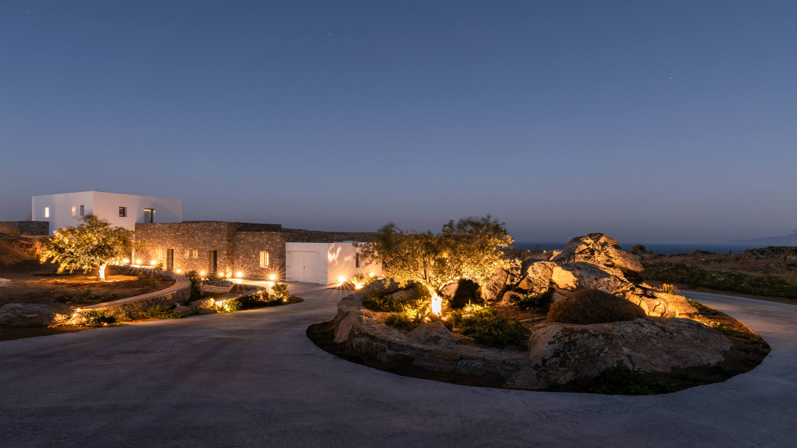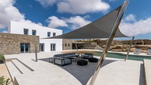 Newly built on a large land plot and in an elevated position just over 2 km or 6 driving minutes to Agrari Beach this magnificent contemporary Villa can accommodate large groups in total privacy in what can only be described as the perfect Myconian setting. Combining the rocky elements of its surroundings Villa Rocky is built of local stone and colours that integrate in perfect harmony with its typical Myconian landscape.