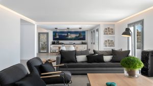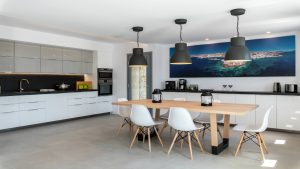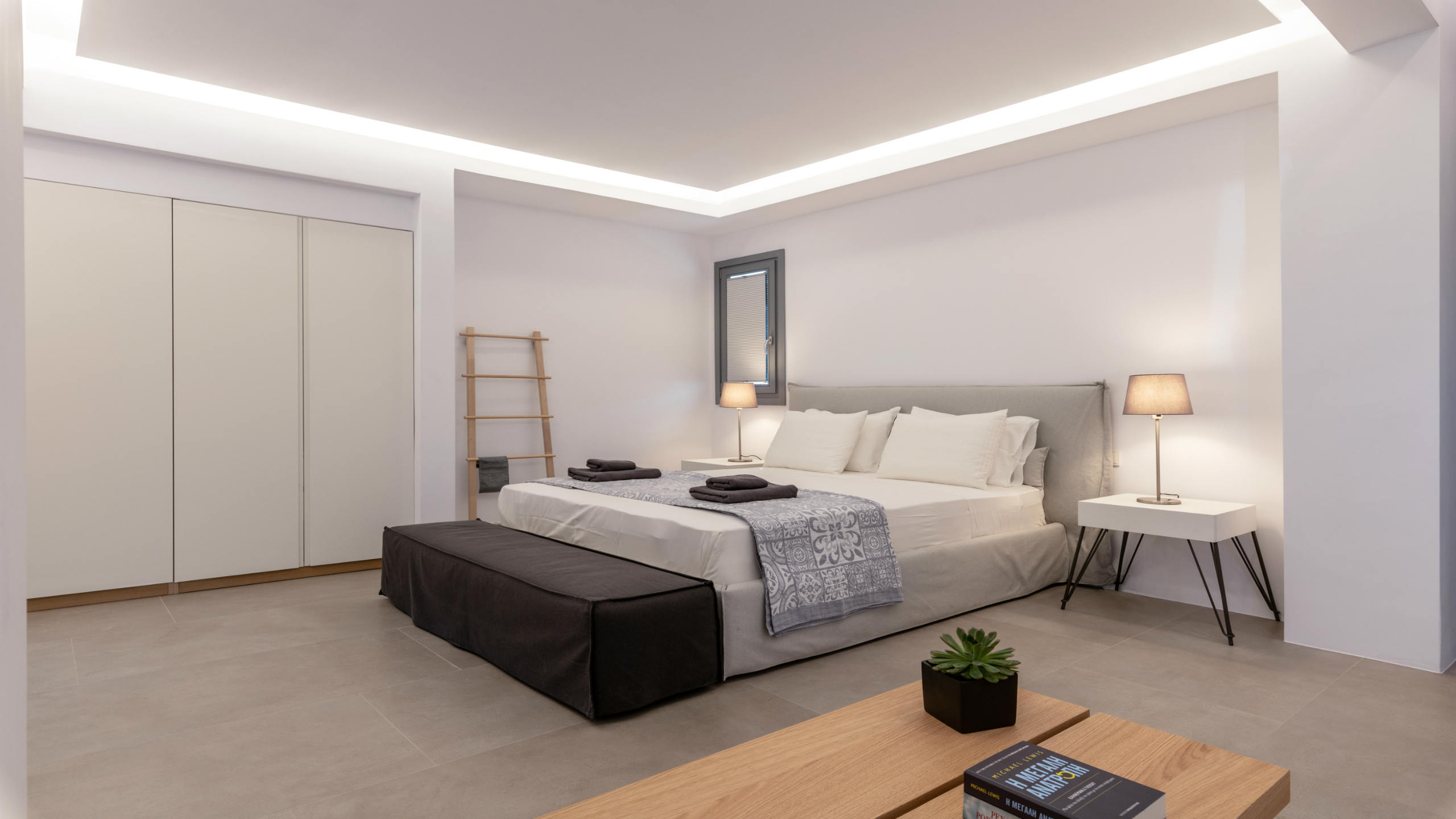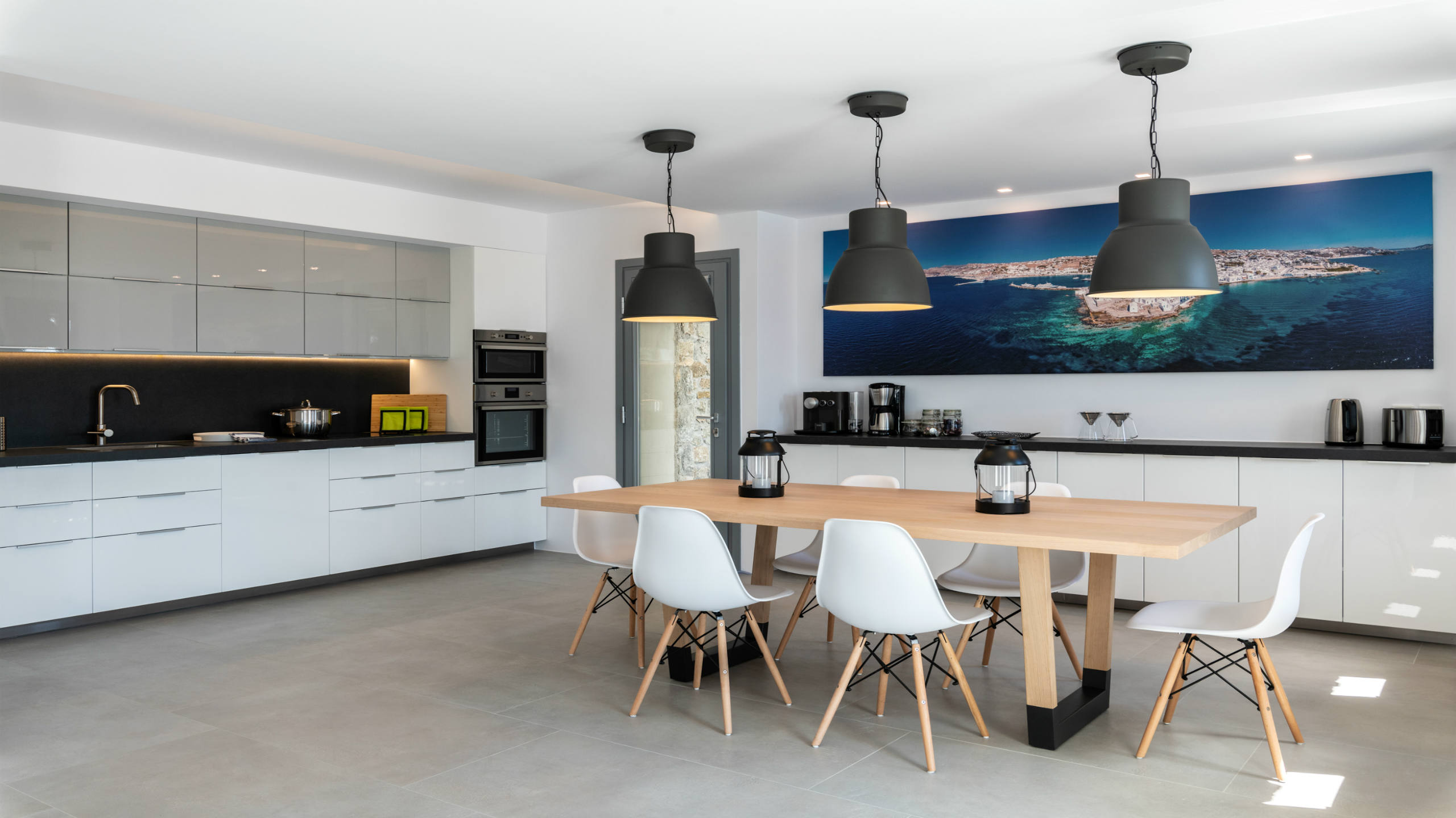 The Villa’s minimalist interior is a combination of modern architecture with provincial beach house elements. A fully equipped open-plan kitchen with modern appliances gives onto a living-sitting area, directly accessing the sized terrace which gloriously envelops the large infinity lagoon type swimming pool. A shaded area is ideal for relaxation whilst the outdoors extends throughout the large grounds providing guests with countless chill out spots or areas to soak in the sun on its dispersed sun loungers.