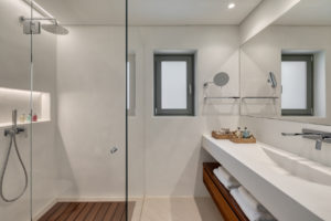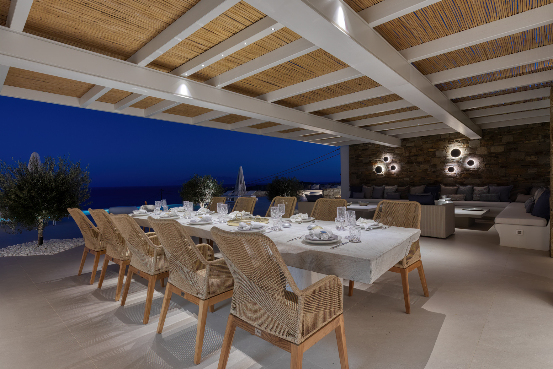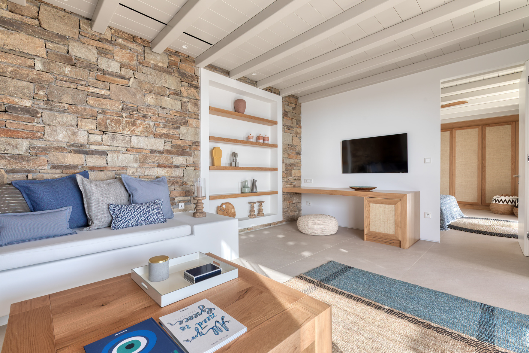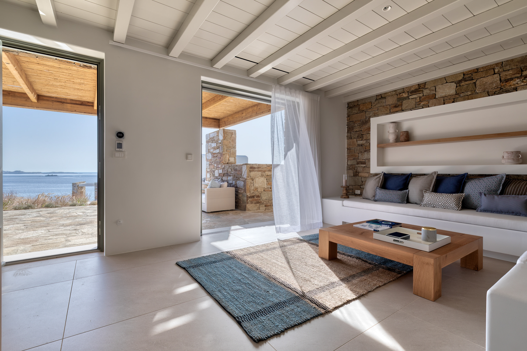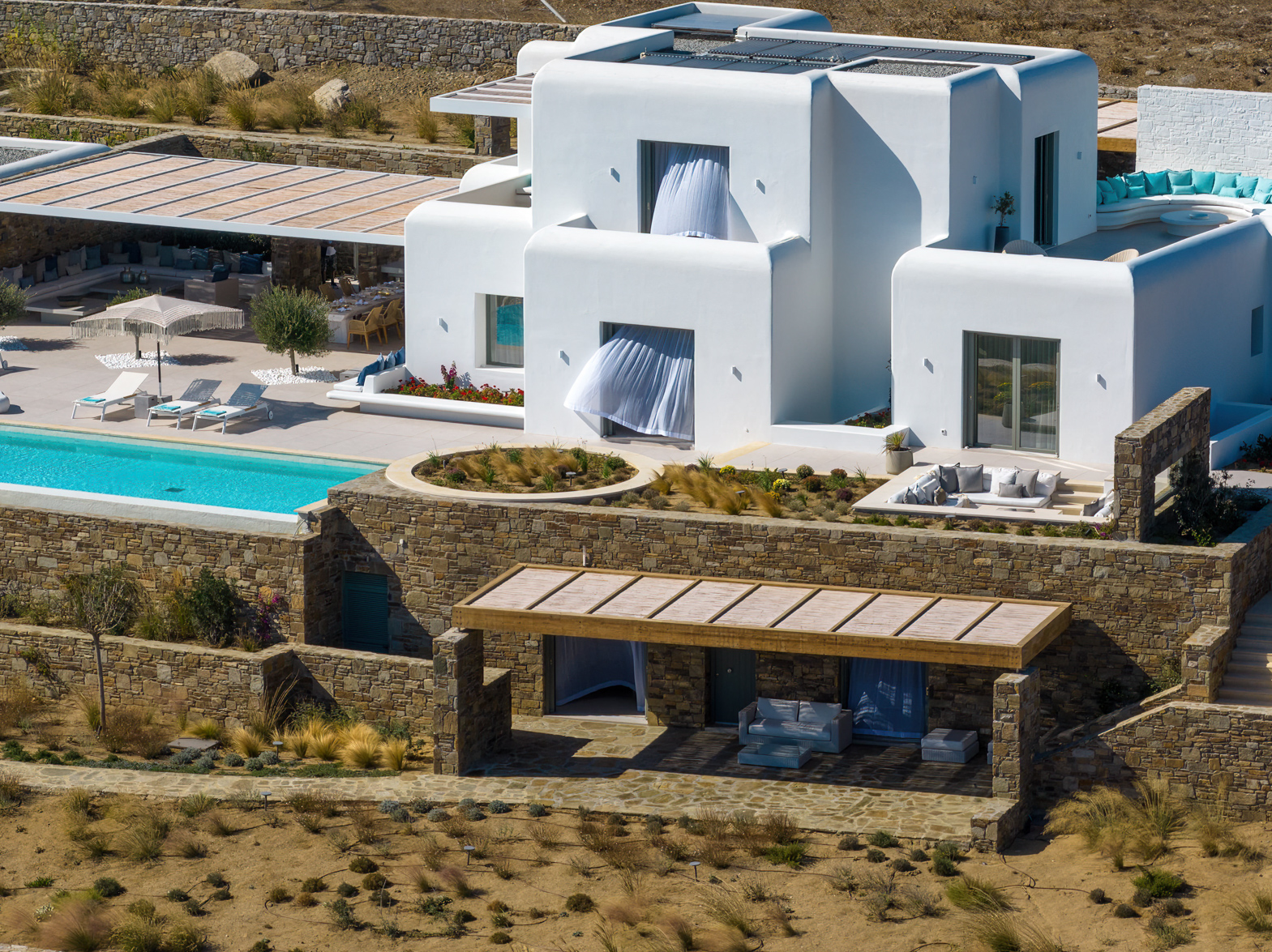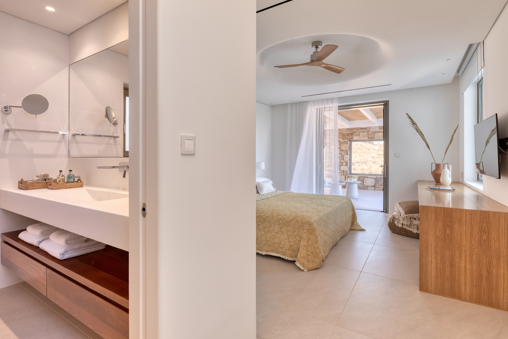 Guest house 4: sitting room with built-in sofas, smart TV], central ventilation & [A/C], master bedroom with king-size bed, TV, [A/C], en-suite bathroom with double showers and sinks – direct access to spacious pergola area with lounge furniture | amazing sea views.