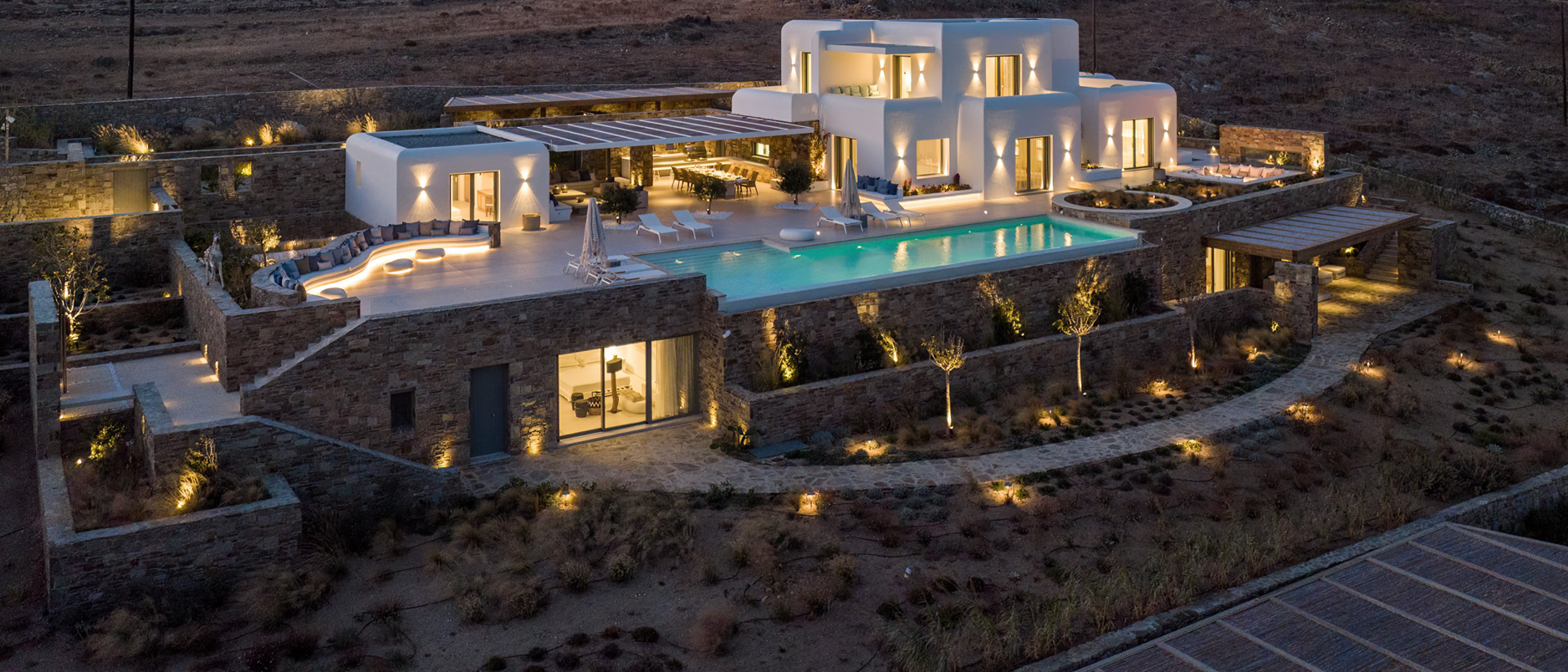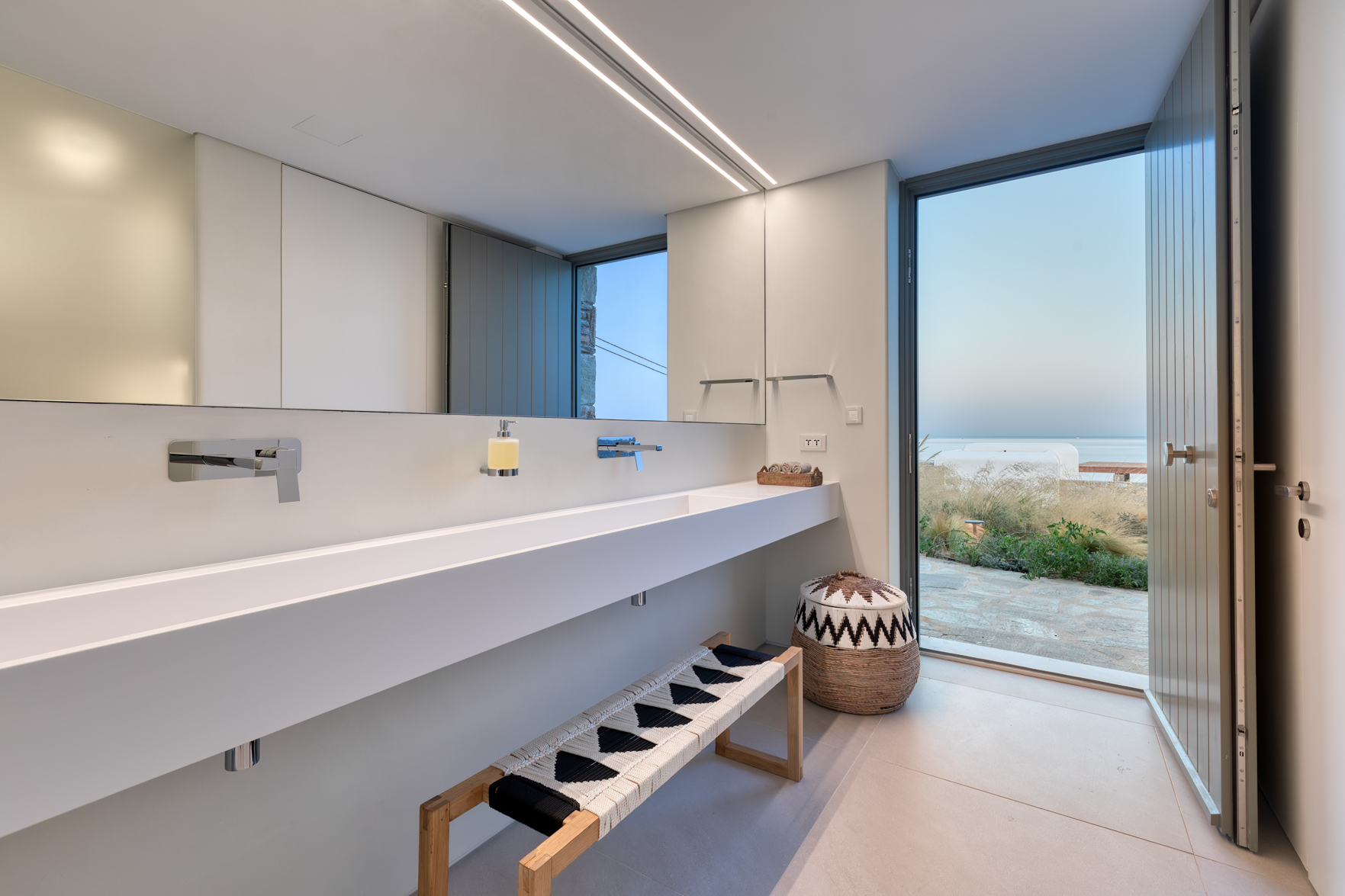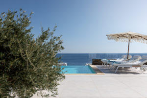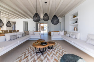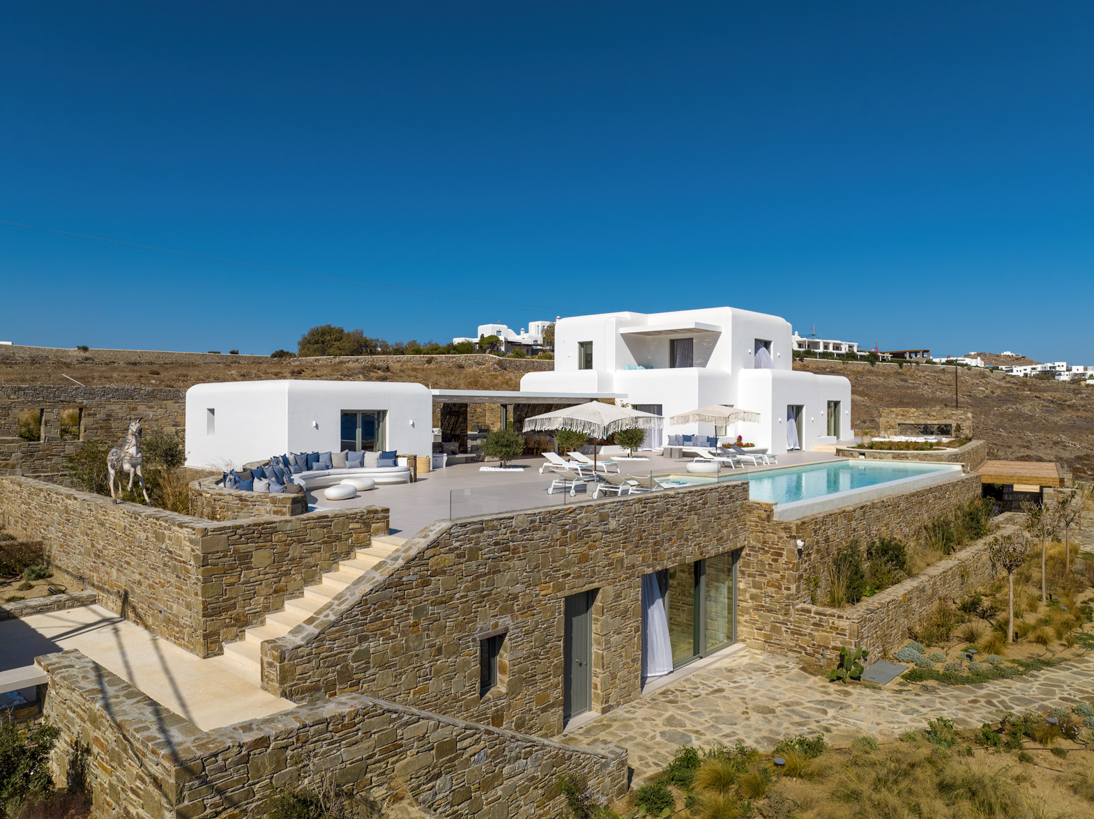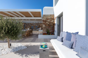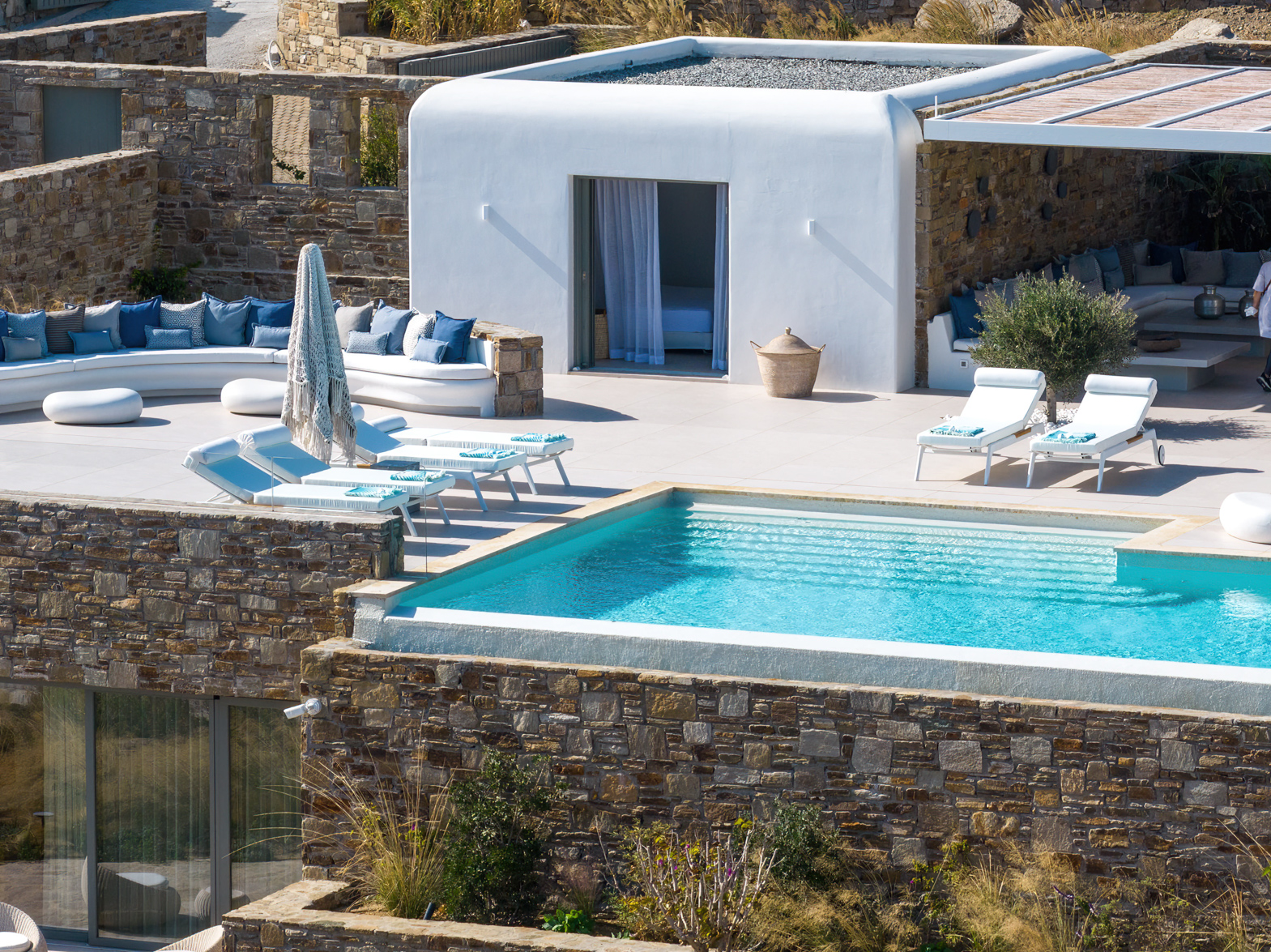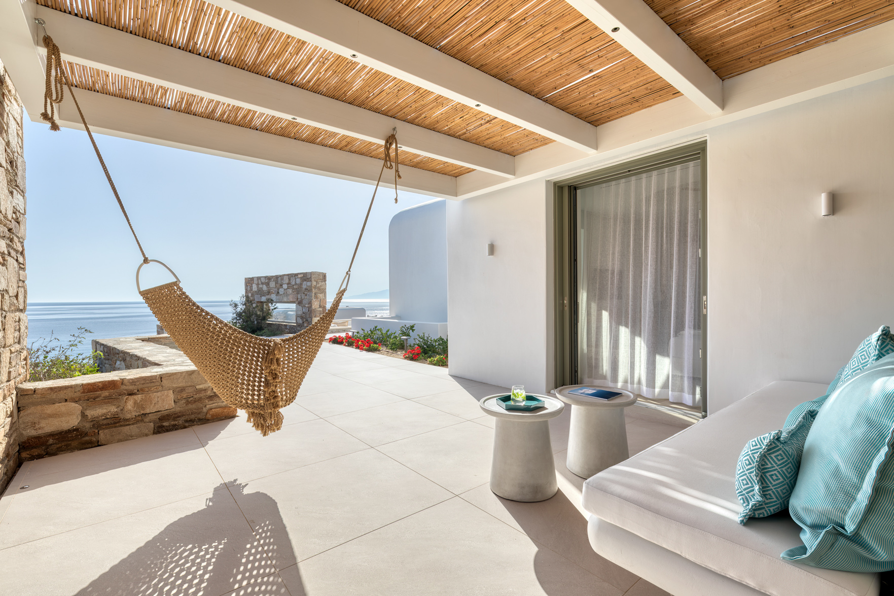 Guest house 4: sitting room with built-in sofas, smart TV], central ventilation & [A/C], master bedroom with king-size bed, TV, [A/C], en-suite bathroom with double showers and sinks – direct access to spacious pergola area with lounge furniture | amazing sea views.