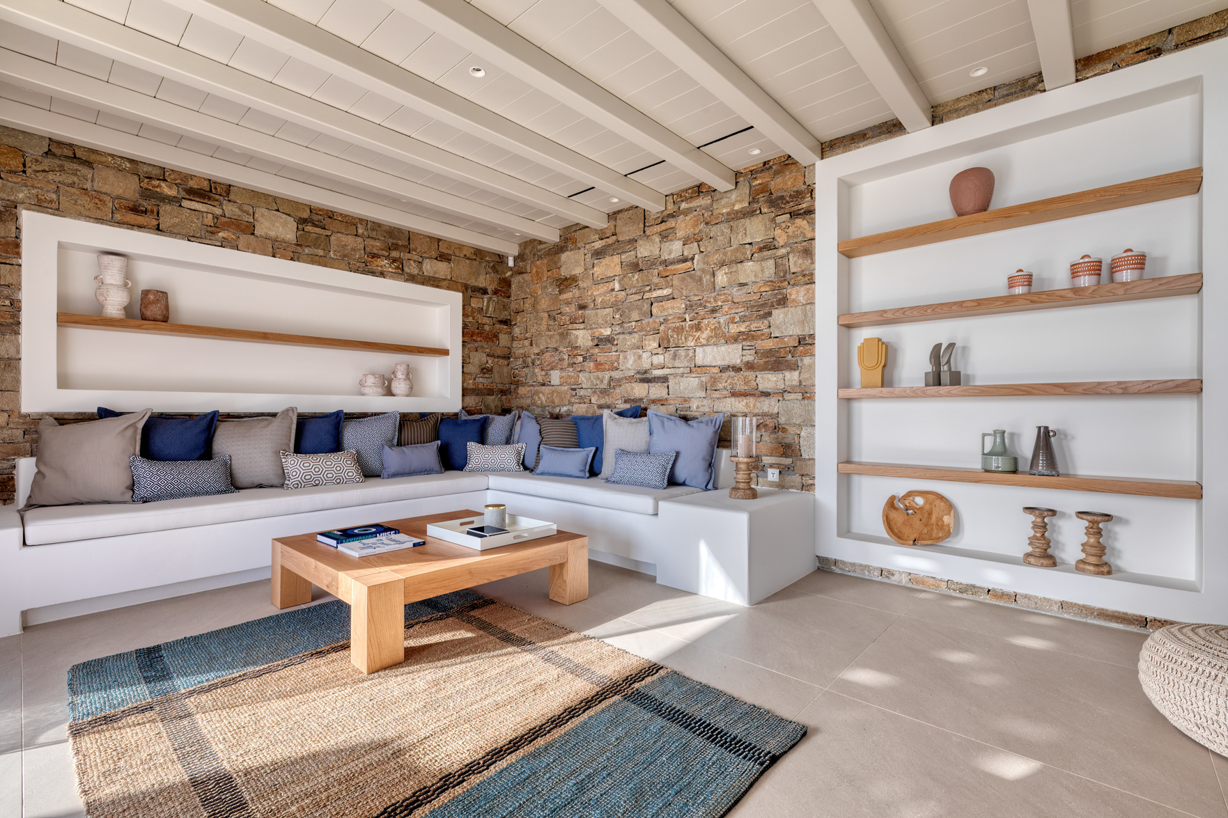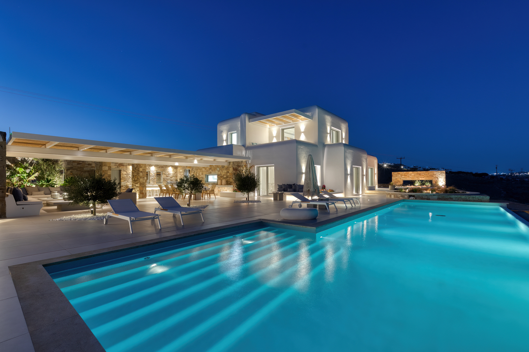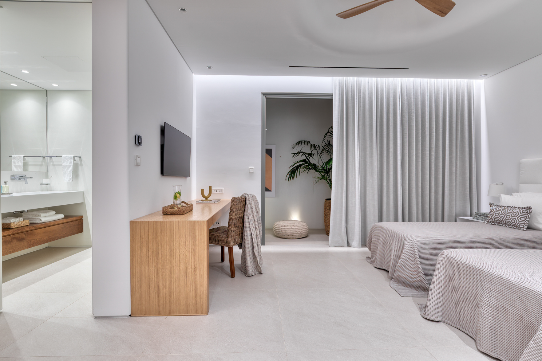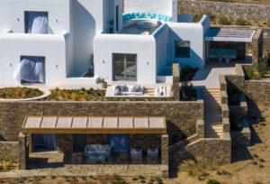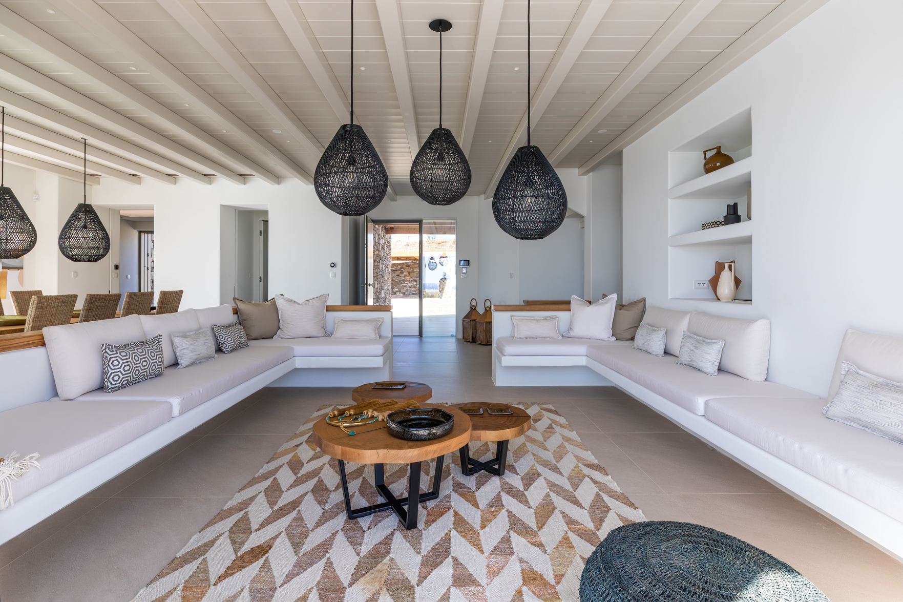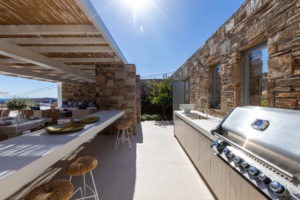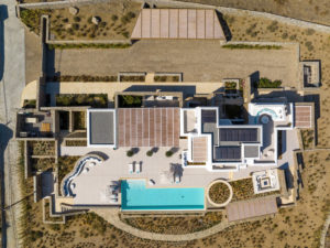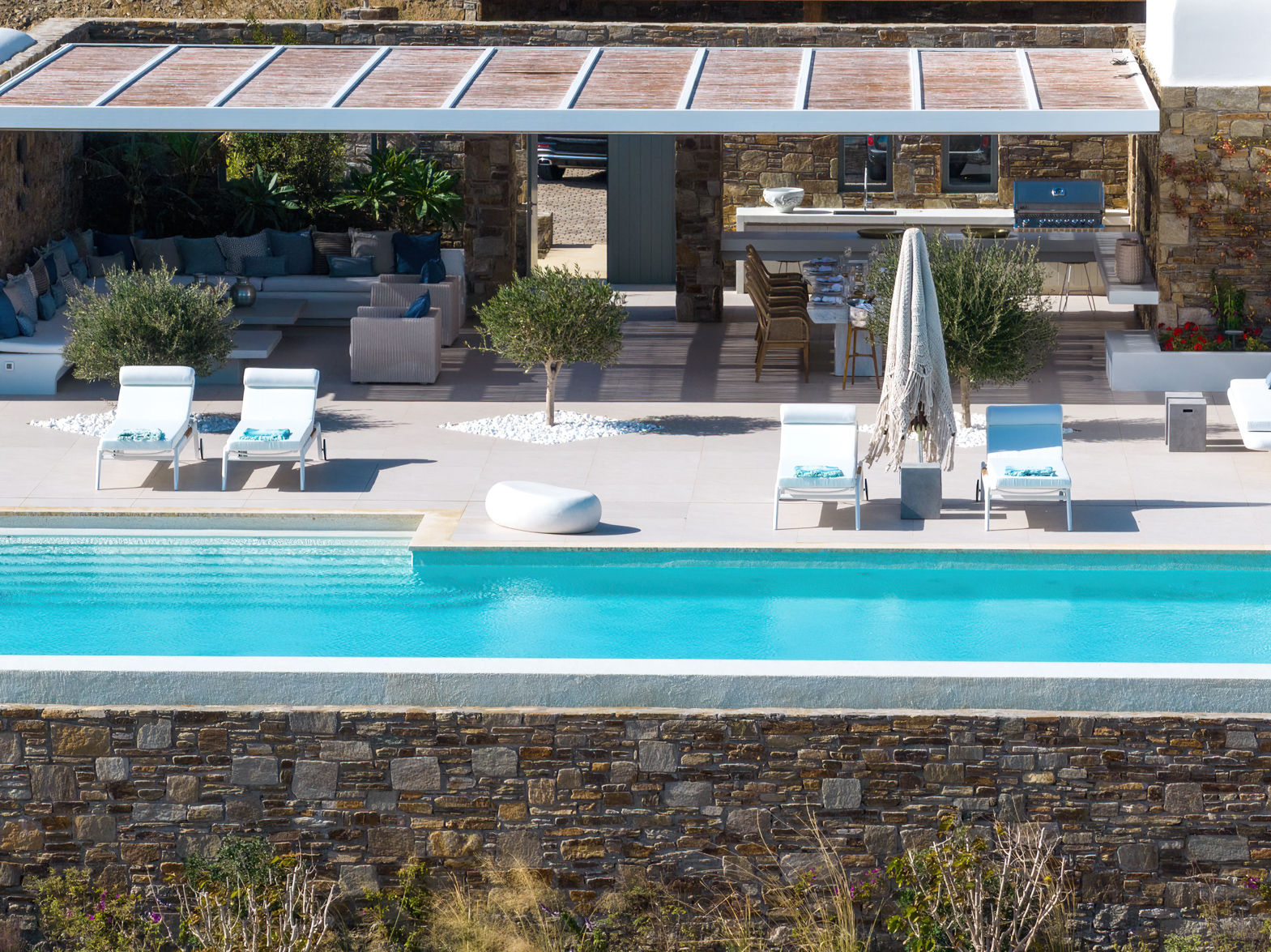 Guest house 4: sitting room with built-in sofas, smart TV], central ventilation & [A/C], master bedroom with king-size bed, TV, [A/C], en-suite bathroom with double showers and sinks – direct access to spacious pergola area with lounge furniture | amazing sea views.