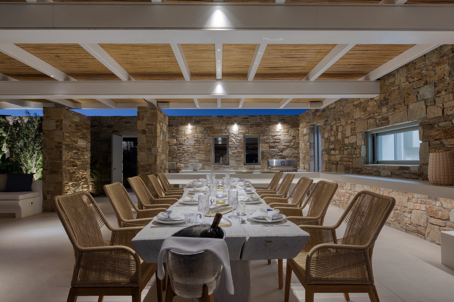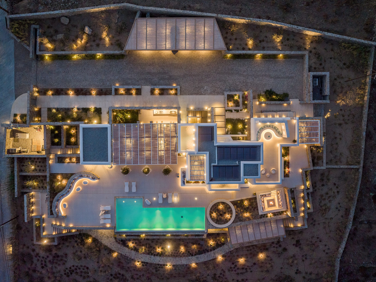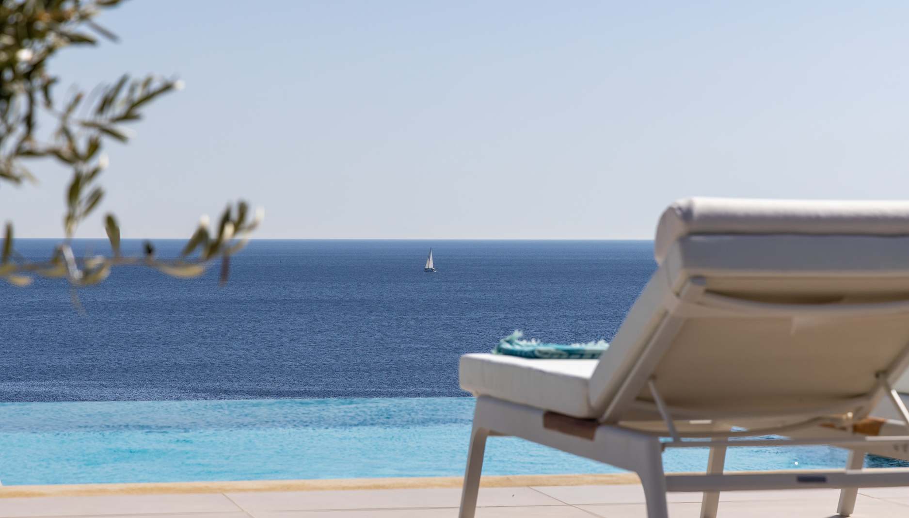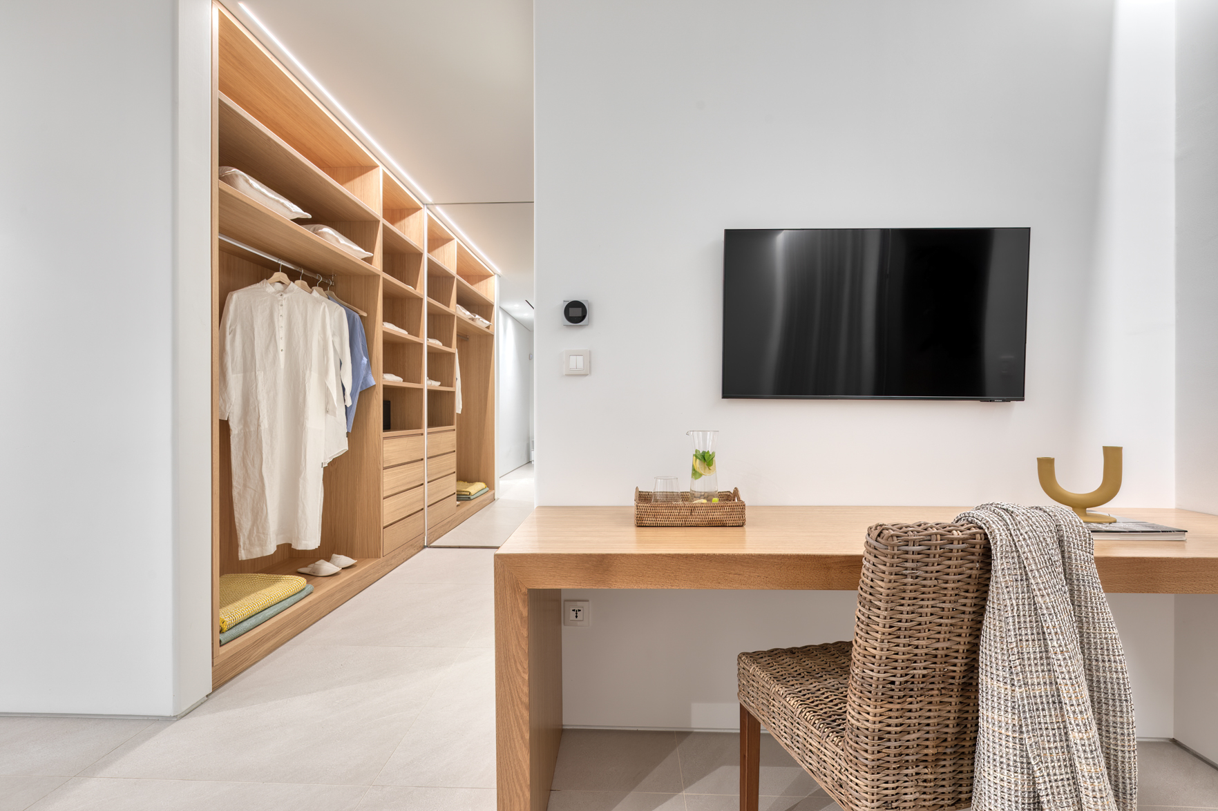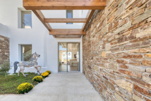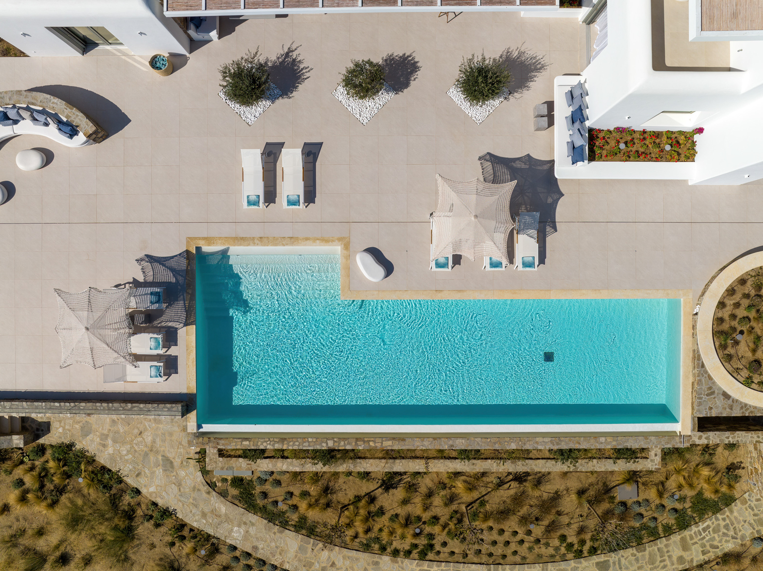 Guest house 4: sitting room with built-in sofas, smart TV], central ventilation & [A/C], master bedroom with king-size bed, TV, [A/C], en-suite bathroom with double showers and sinks – direct access to spacious pergola area with lounge furniture | amazing sea views.