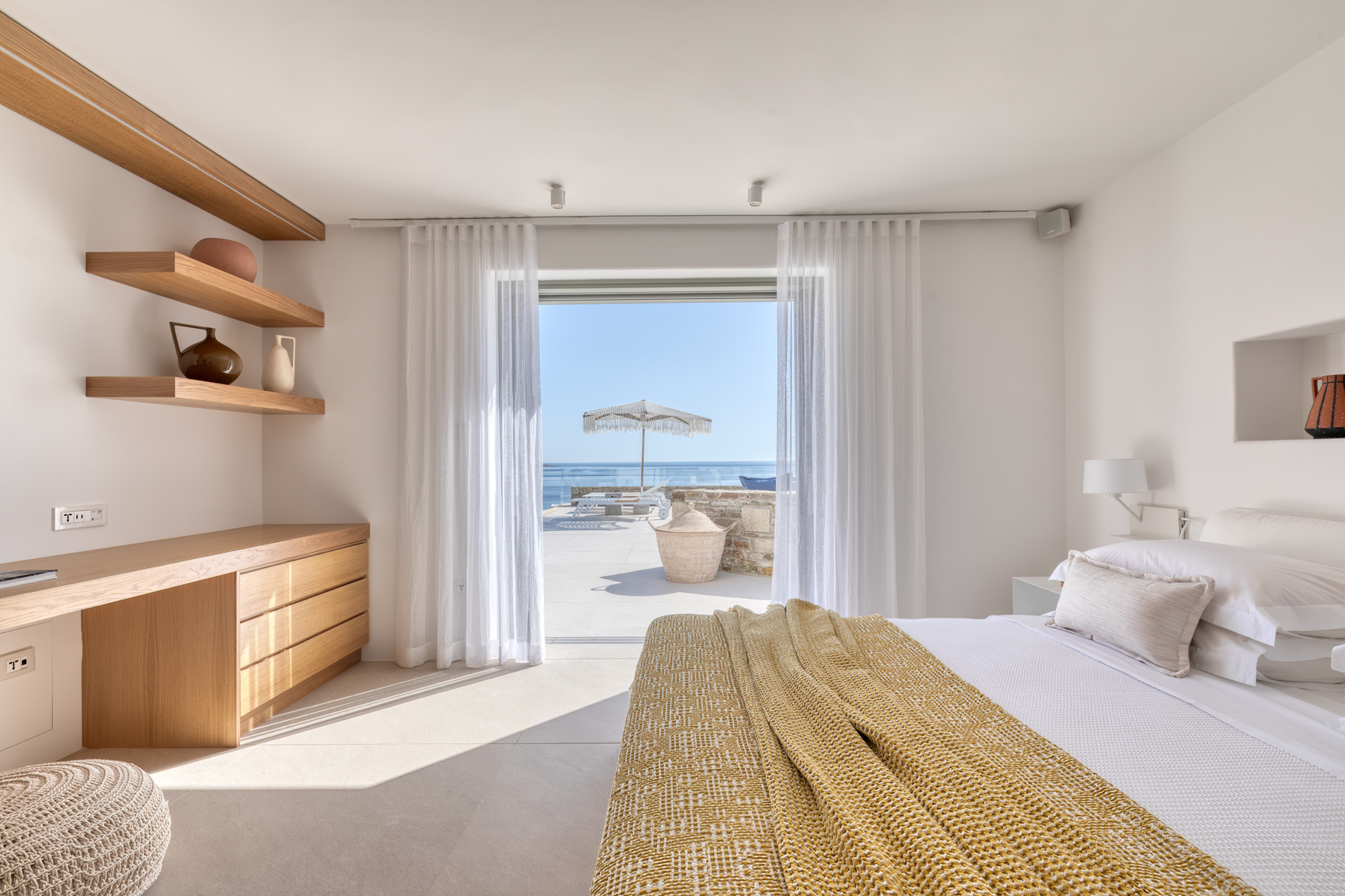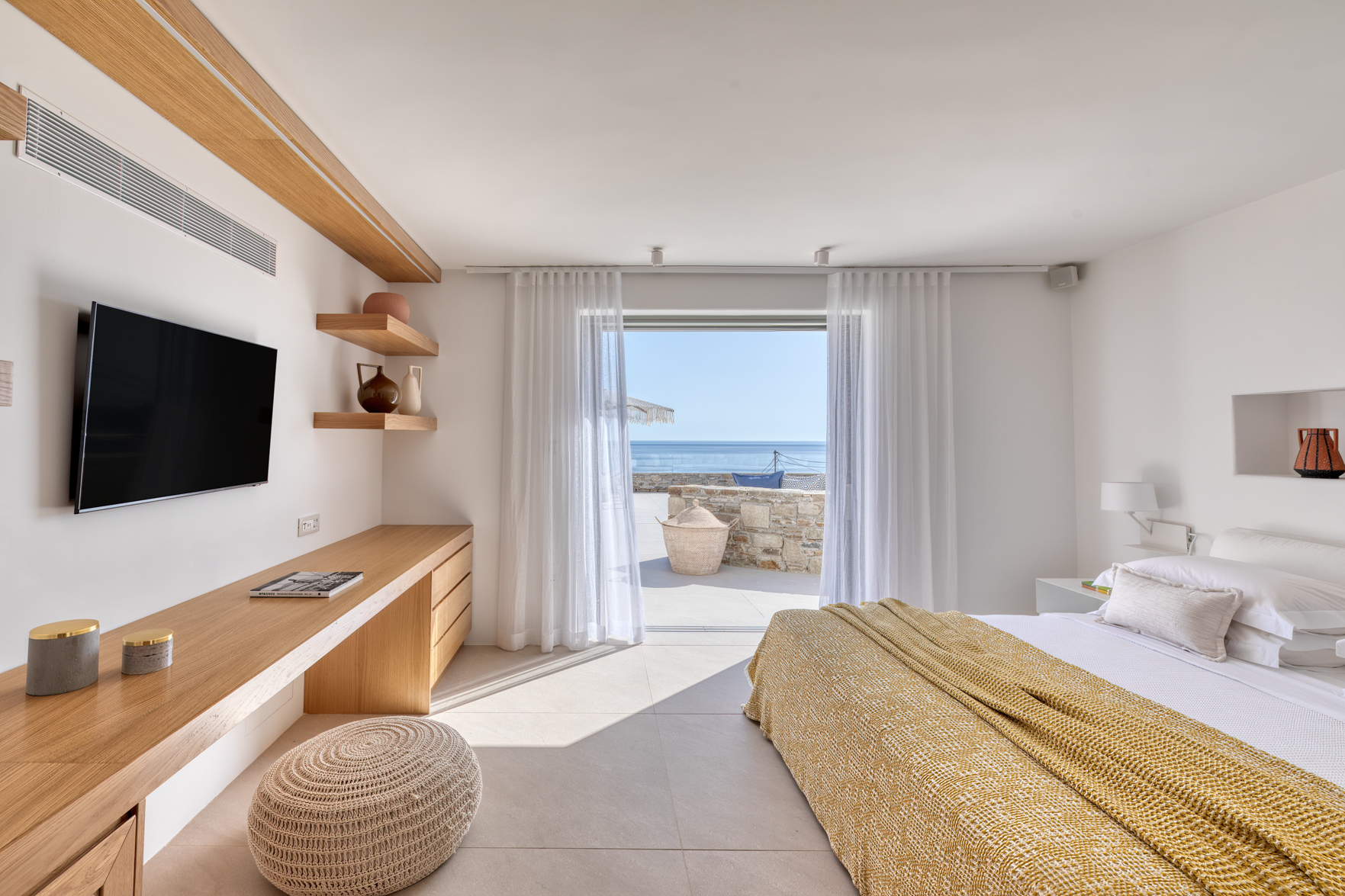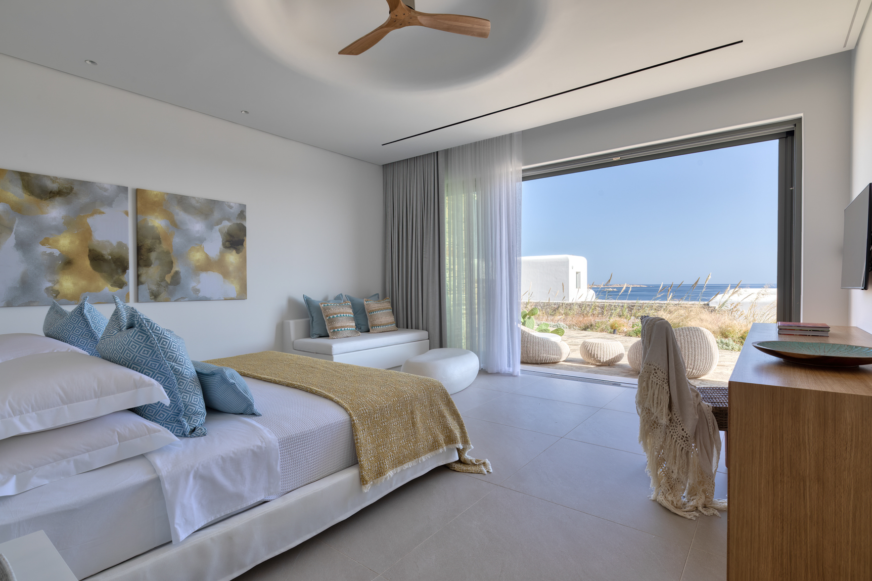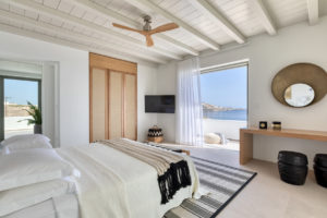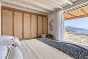 Guest house 1: double bedroom with king-size bed, smart TV, central ventilation & [A/C], en-suite bathroom – direct access to shaded outdoor lounge area and to fire pit lounge, via balcony doors | amazing sea views.