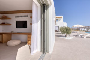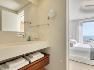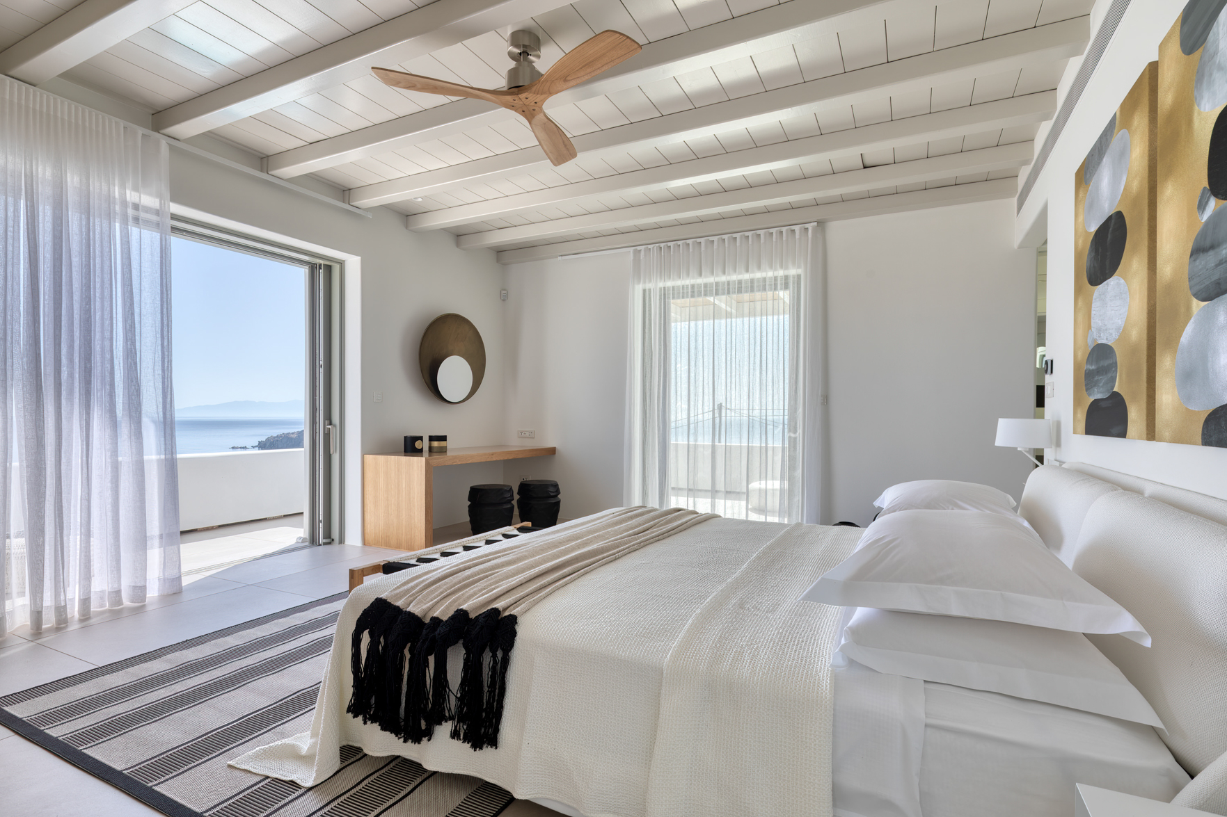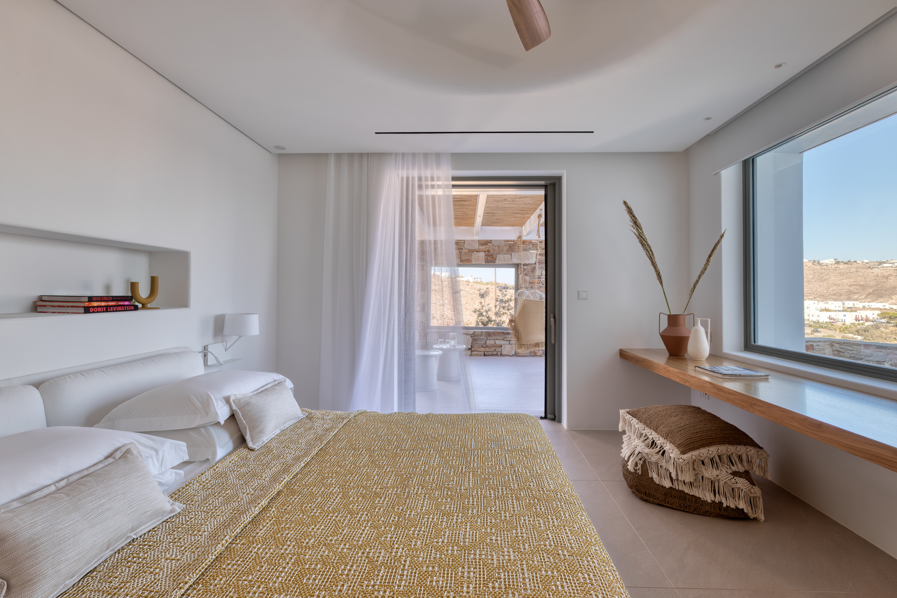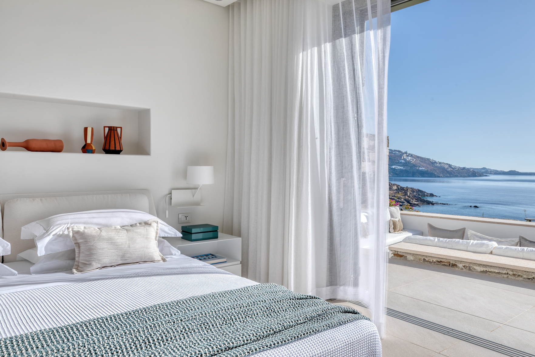Guest house 1: double bedroom with king-size bed, smart TV, central ventilation & [A/C], en-suite bathroom – direct access to shaded outdoor lounge area and to fire pit lounge, via balcony doors | amazing sea views.