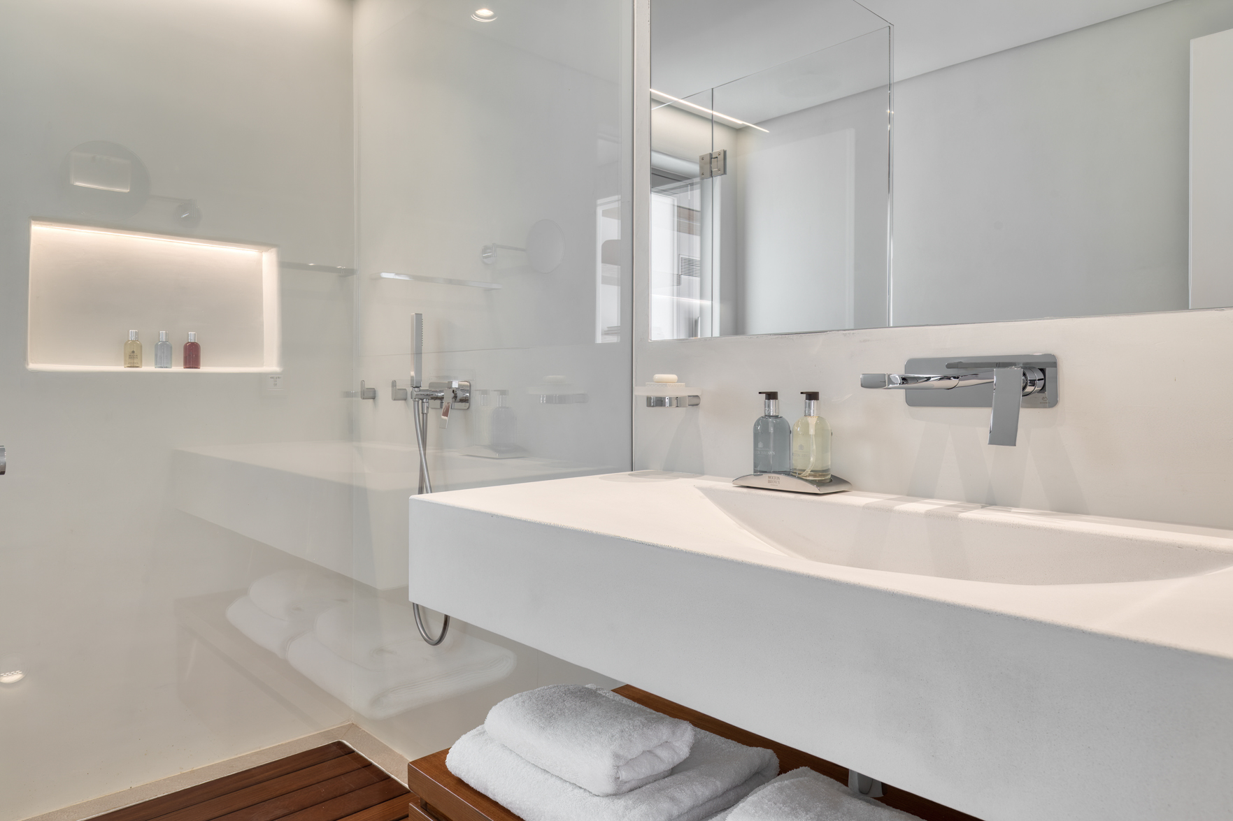 Room 1: Master bedroom with king-size bed, [A/C], en-suite bathroom with double showers and sinks – direct access to a large private veranda. Access via Elevator, external and internal stairs.