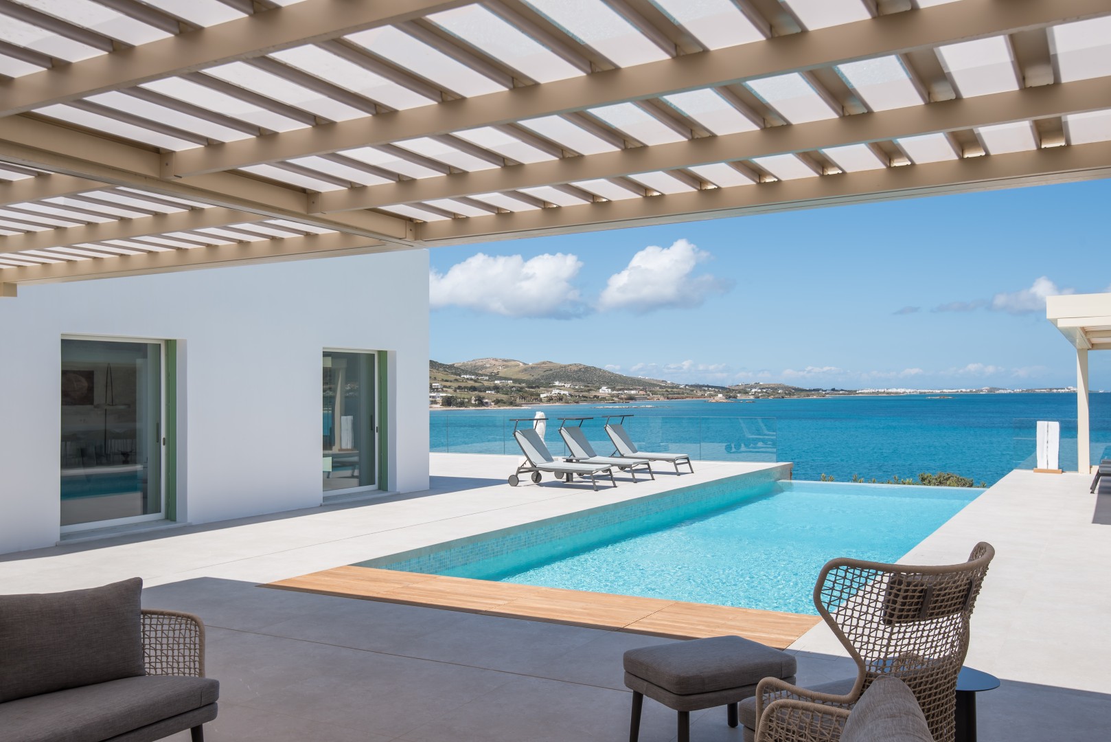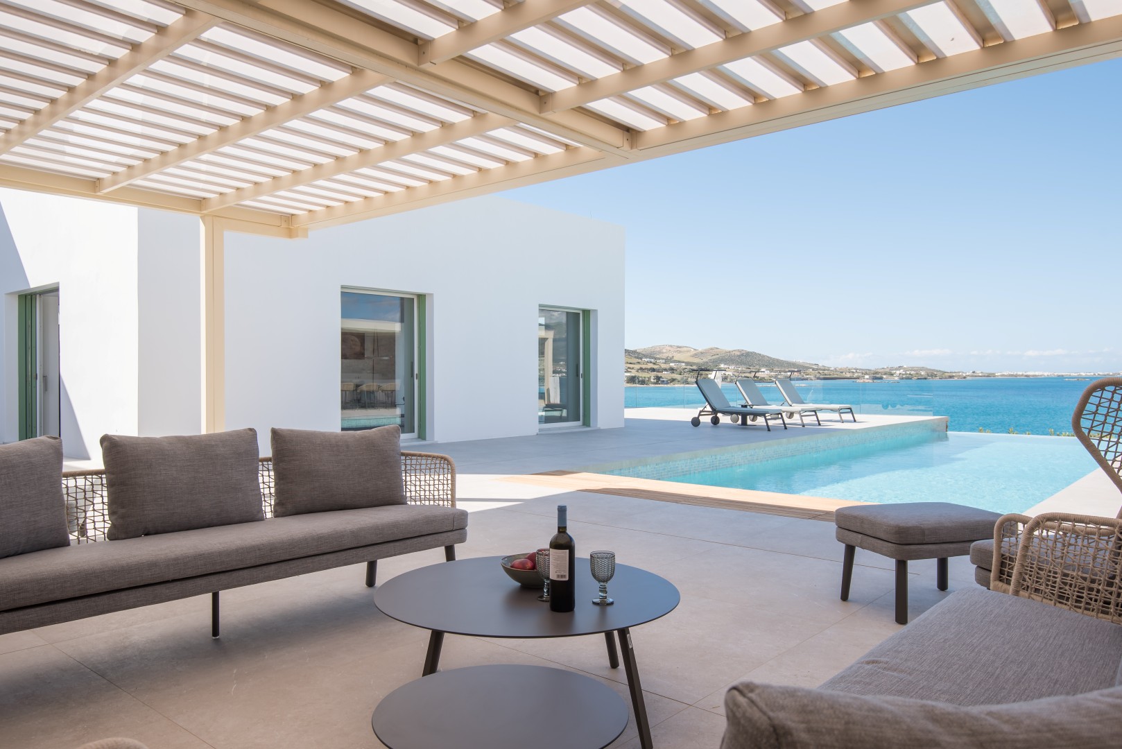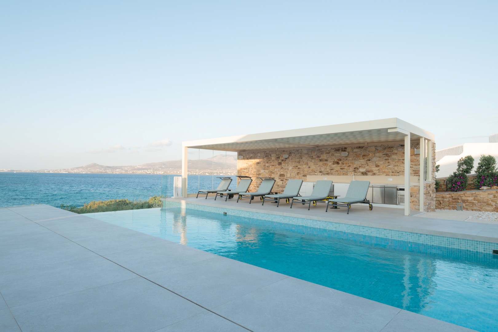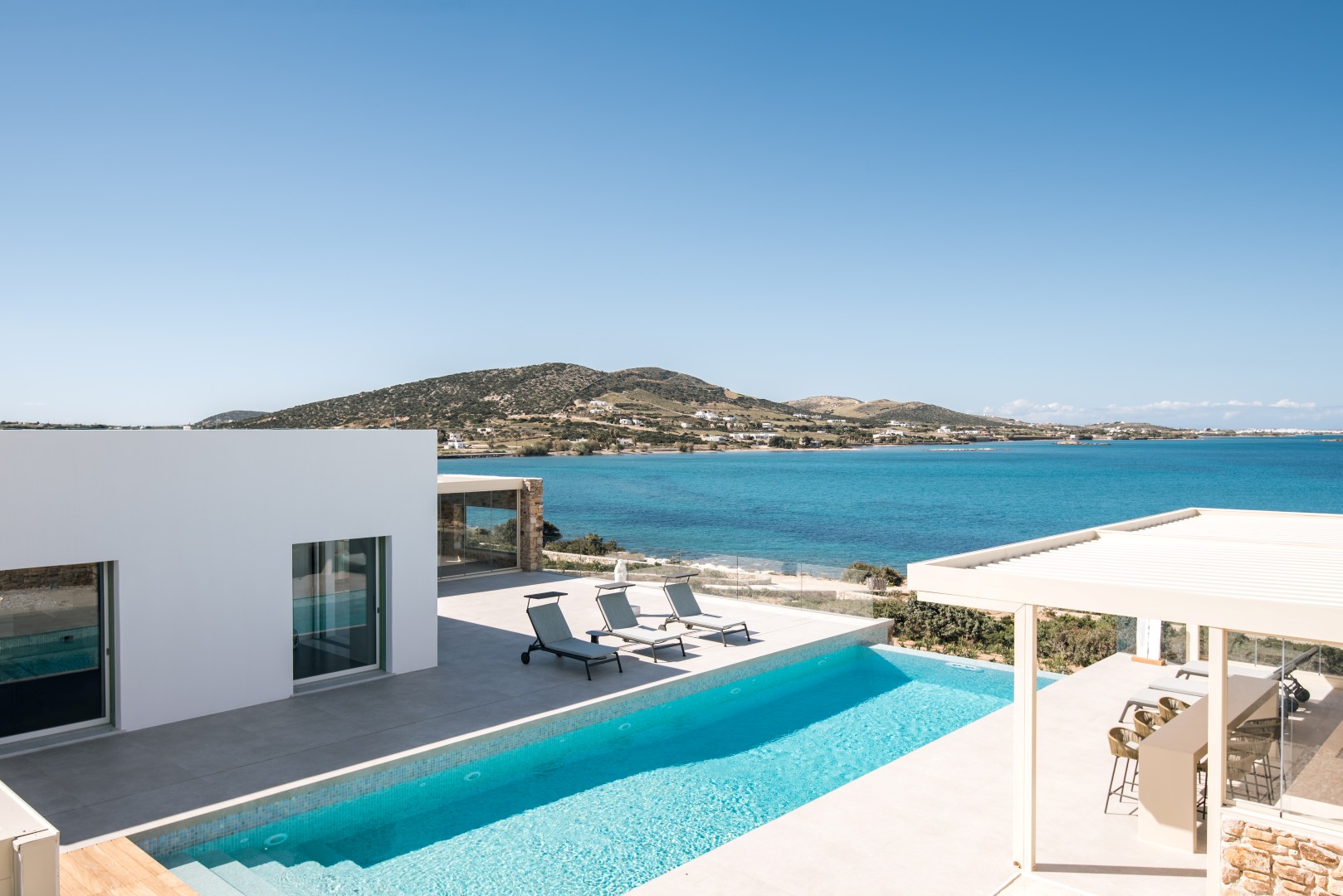 This elegant seaside villa combines contemporary luxury with Cycladic charm, offering breathtaking panoramic views of the Aegean. Designed for seamless indoor-outdoor living, it centers around a stunning infinity-style pool framed by sun loungers, shaded pergolas, and an impressive stone-clad outdoor dining pavilion with glass walls overlooking the sea. On the pool level, large sliding doors open into a bright and spacious living area with a comfortable lounge and dining space, alongside a fully equipped modern kitchen. A few steps up, the middle level features two beautifully designed bedrooms—one with twin beds and one double—sharing a stylish shower room.