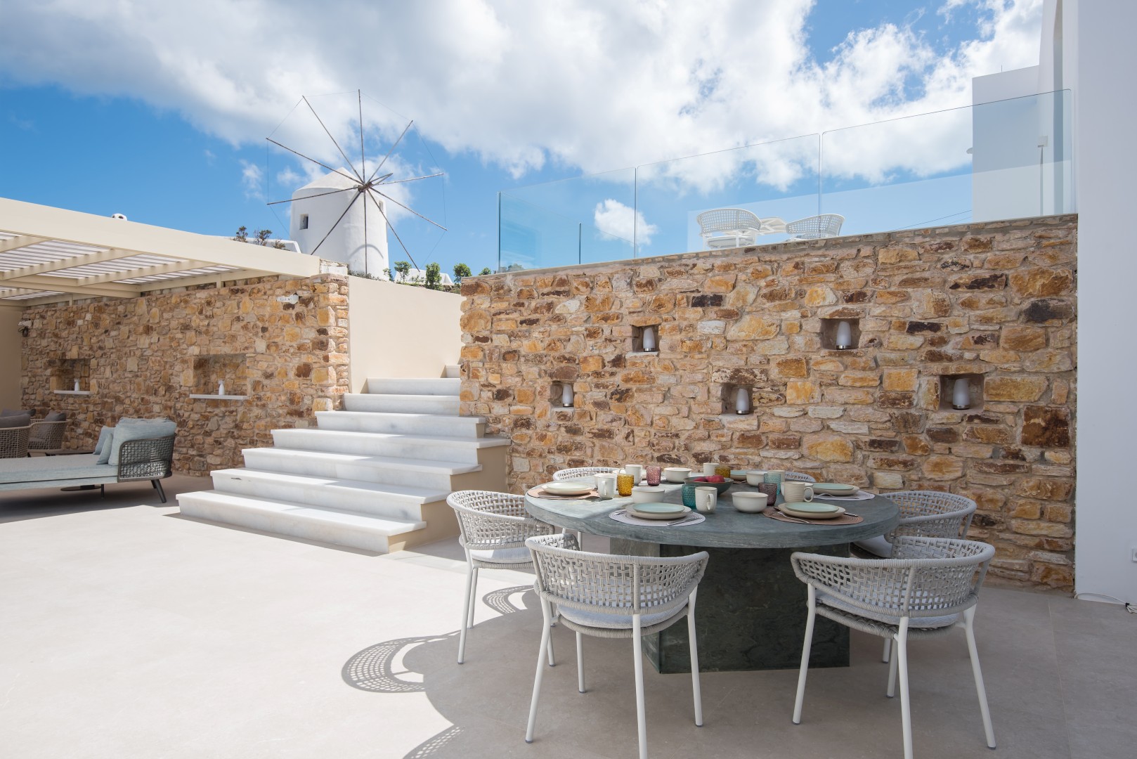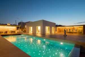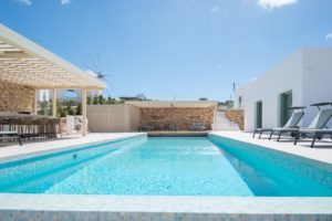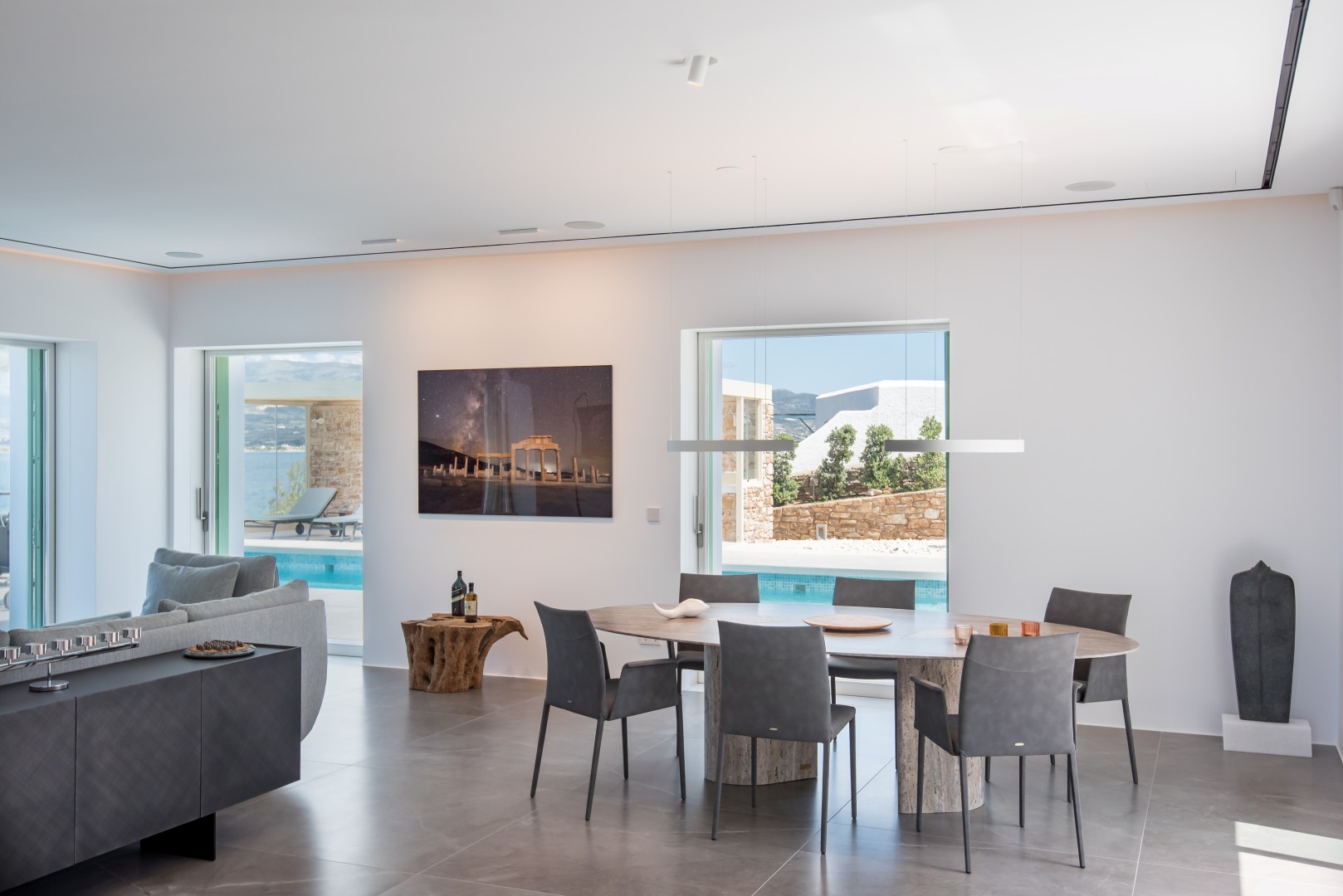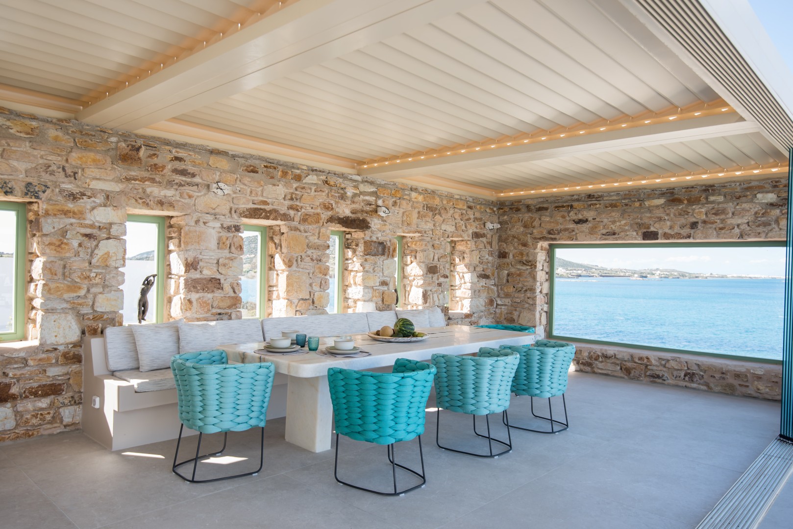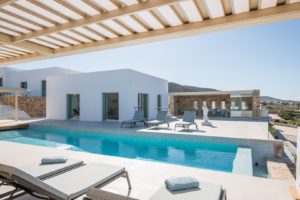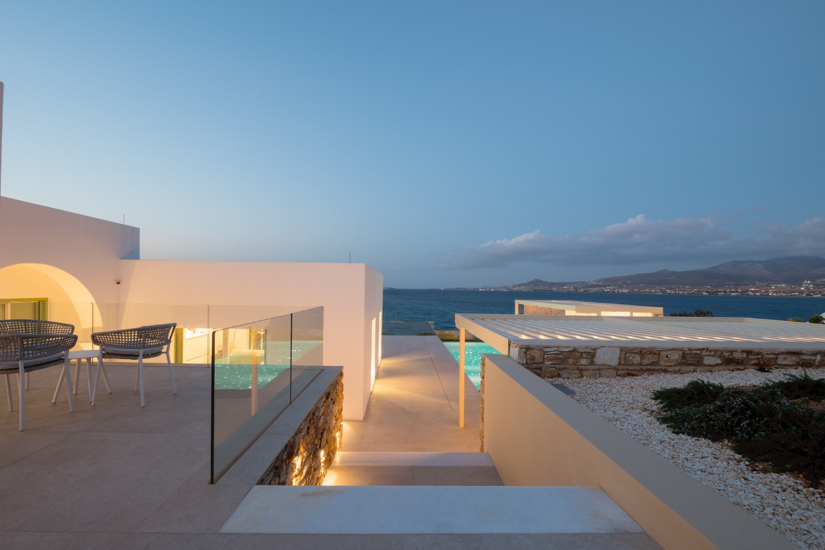 This elegant seaside villa combines contemporary luxury with Cycladic charm, offering breathtaking panoramic views of the Aegean. Designed for seamless indoor-outdoor living, it centers around a stunning infinity-style pool framed by sun loungers, shaded pergolas, and an impressive stone-clad outdoor dining pavilion with glass walls overlooking the sea. On the pool level, large sliding doors open into a bright and spacious living area with a comfortable lounge and dining space, alongside a fully equipped modern kitchen. A few steps up, the middle level features two beautifully designed bedrooms—one with twin beds and one double—sharing a stylish shower room.