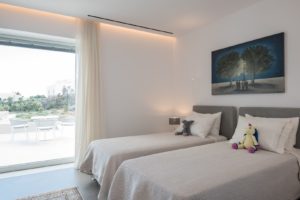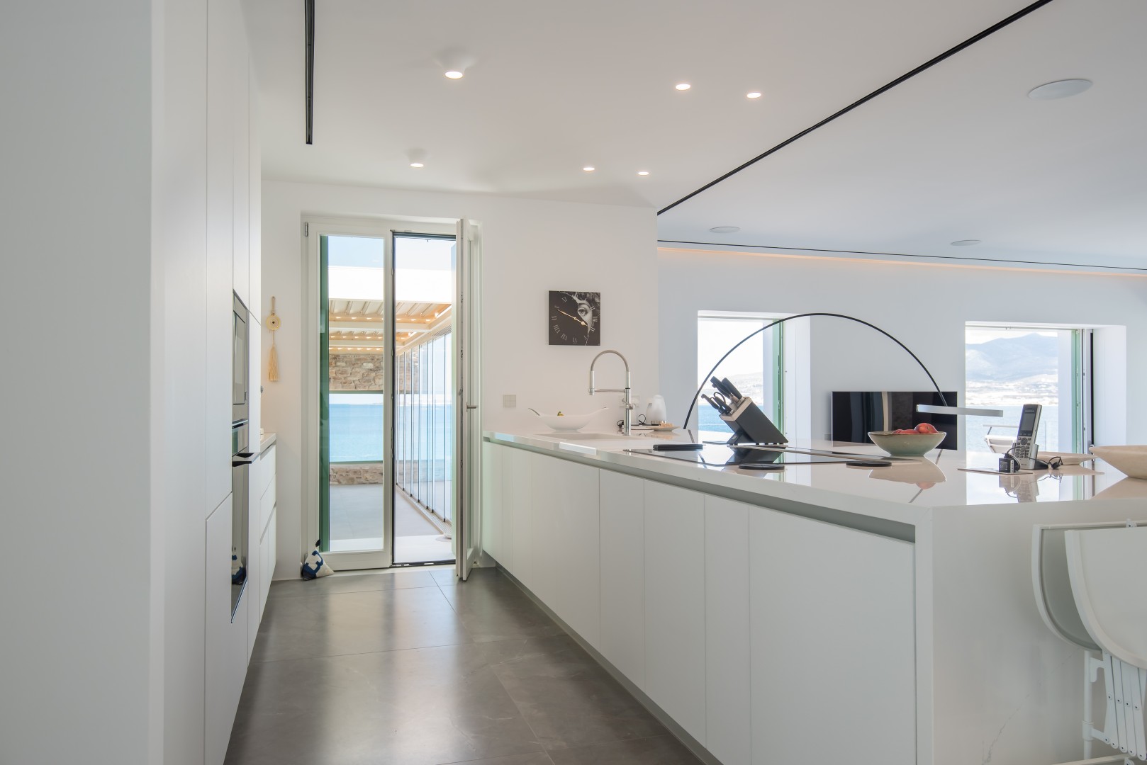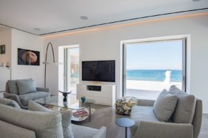 Another short set of steps leads to the top level, where the serene master suite awaits, complete with an en-suite bathroom and access to a private terrace and patio for quiet moments with endless sea views. On the lower level, a well-equipped gym and sauna provide wellness and relaxation options. Minimalist décor, curated artwork, high-quality finishes, and expansive windows ensure a calm, luxurious atmosphere throughout, making this villa the ideal retreat for comfort, privacy, and unforgettable coastal living.