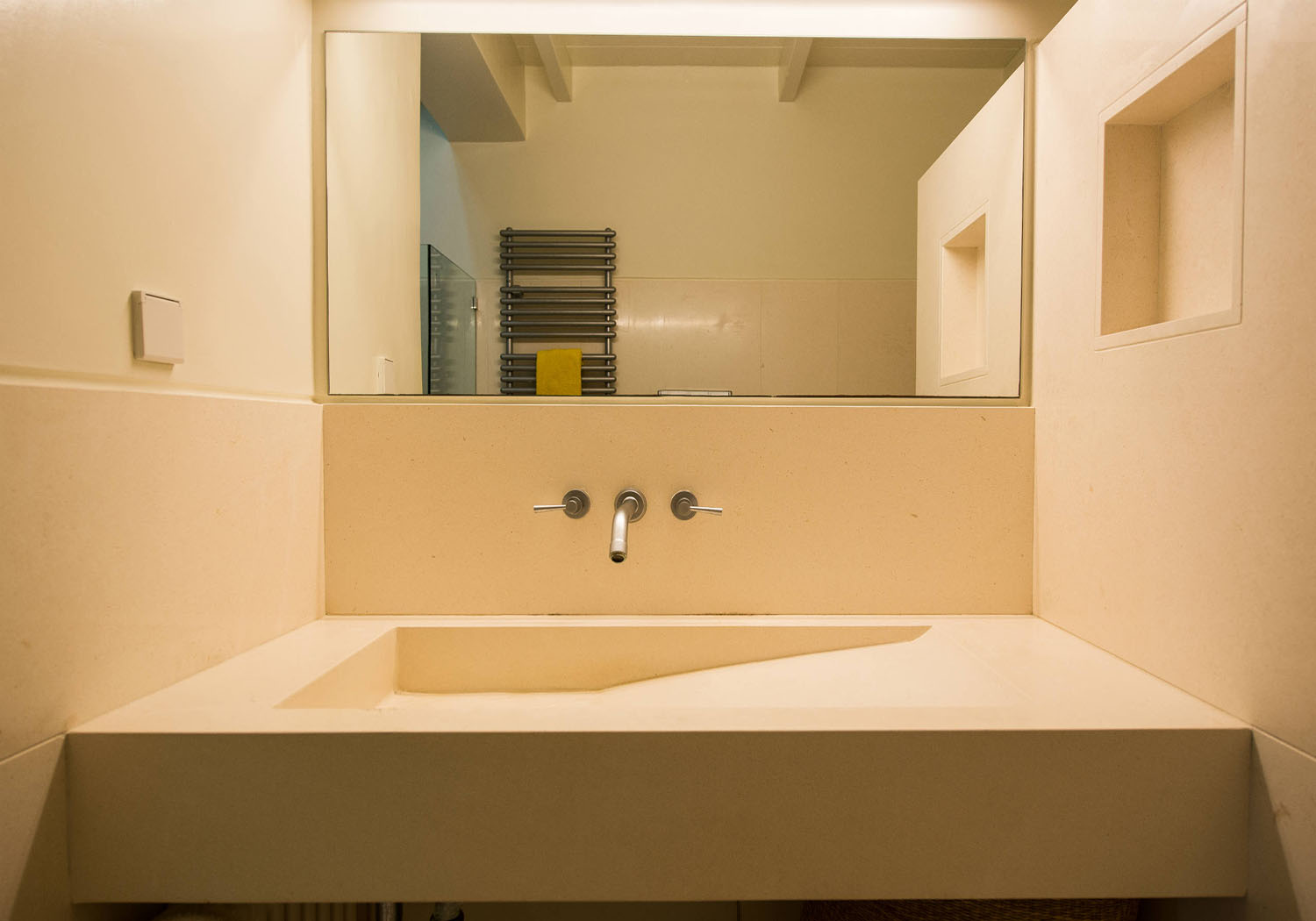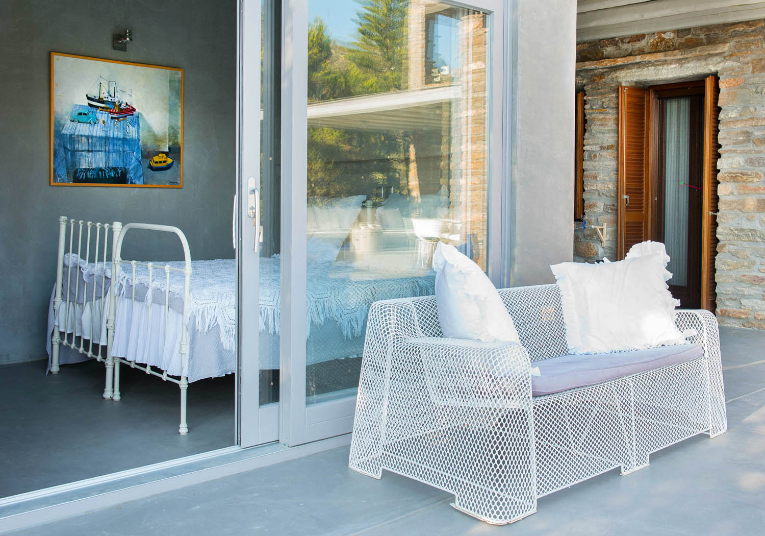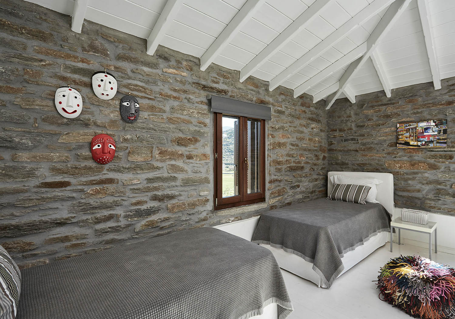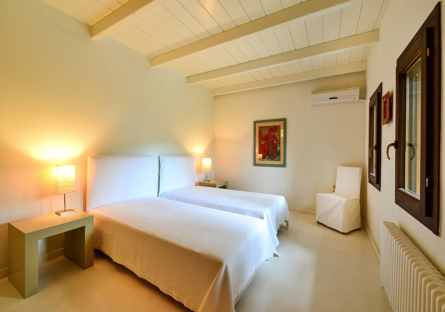 One independent guest bedroom with two joined single beds, en-suite bathroom, access to the terrace.